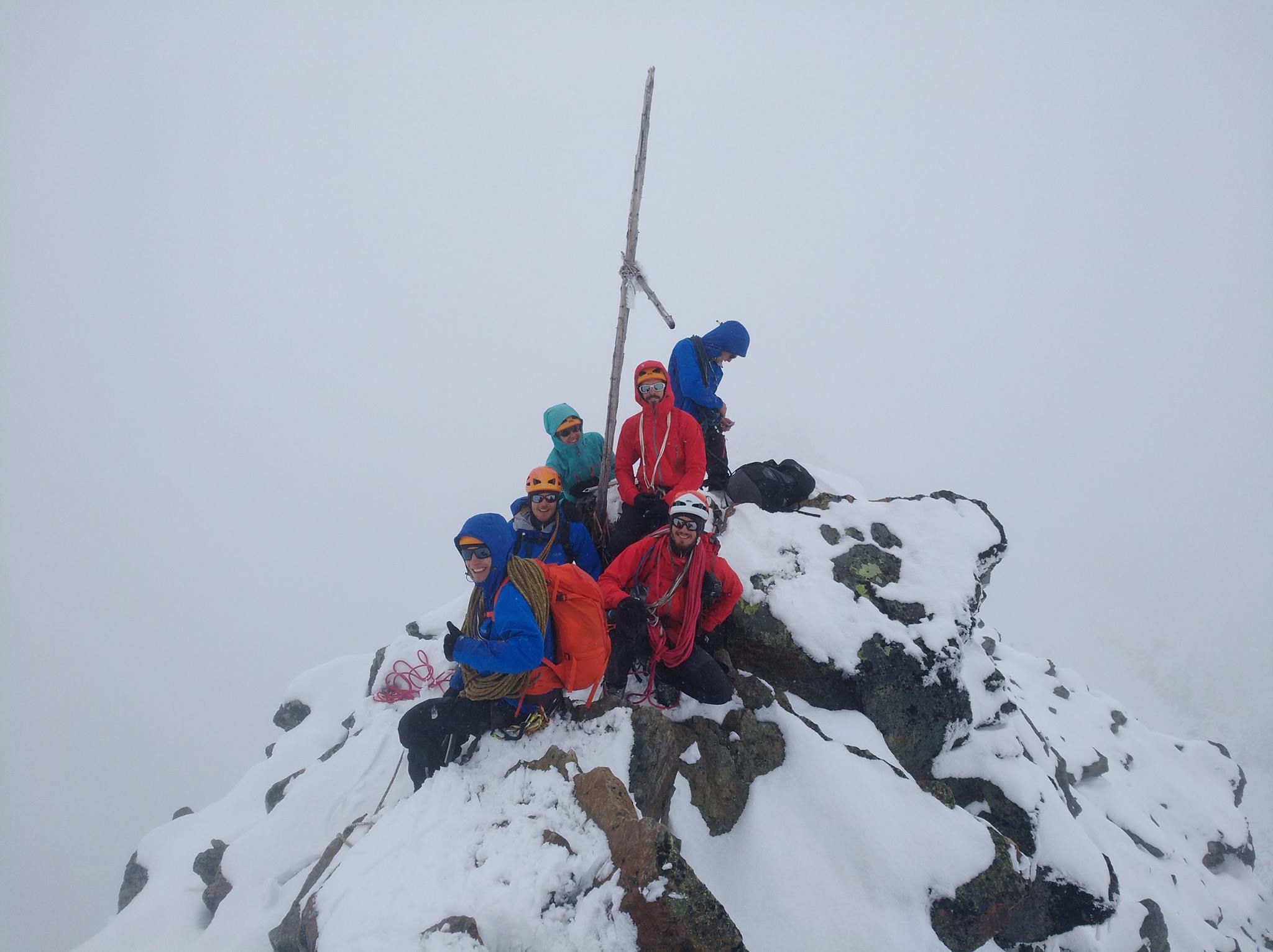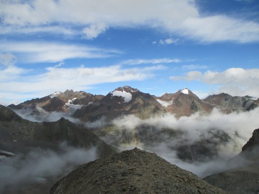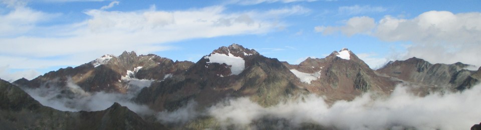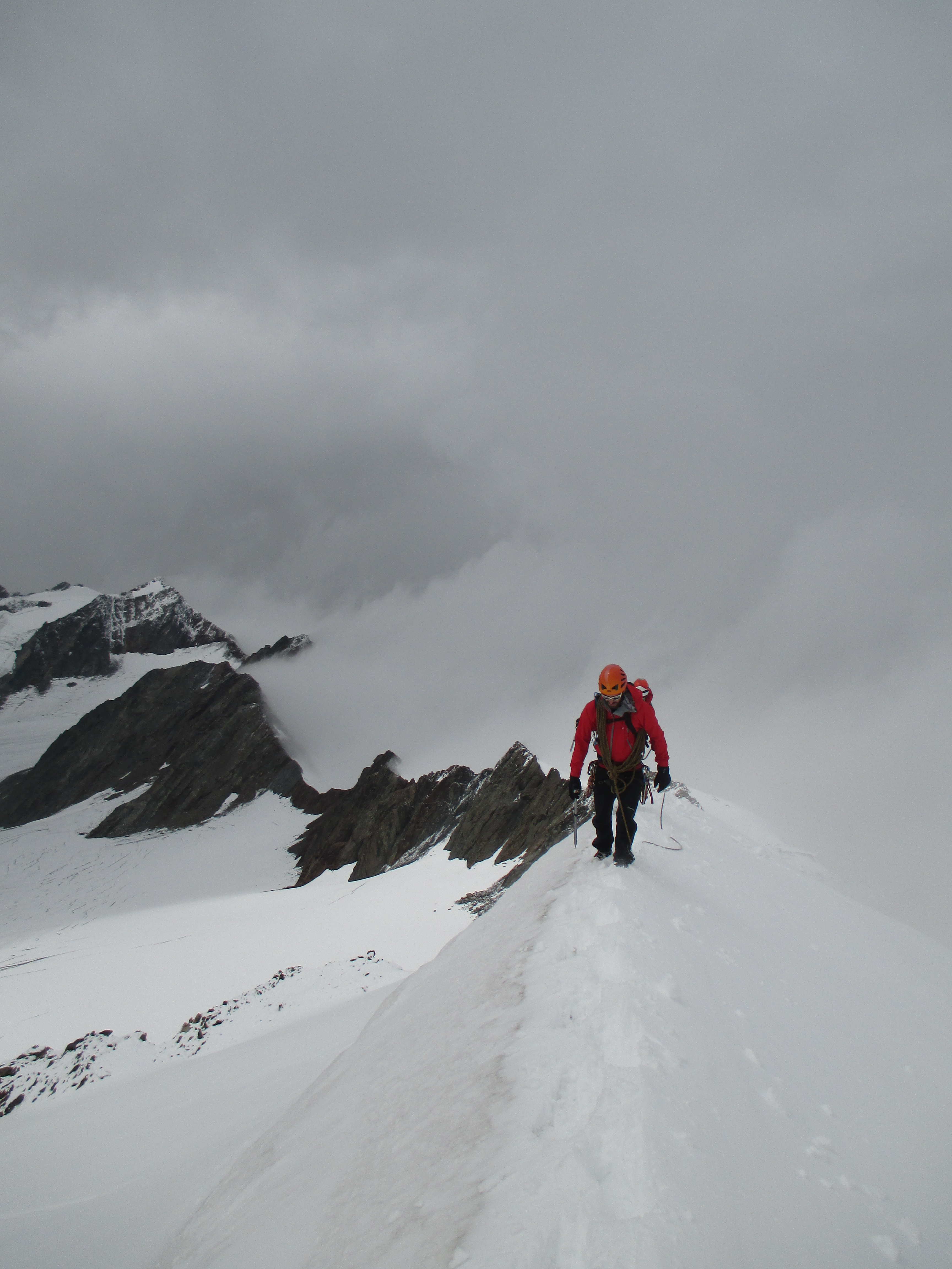 Gelukkig was het onweer tegen de volgende dag overgetrokken en bleef er enkel nog maar wat mist over. Niets dat ons weerhield voor een nieuwe toppoging, ditmaal hadden we onze zinnen gezet op de Petersen Spitze (3484m). Met een steile noordelijke ijsflank die zou leiden naar de top zag het er een zeer interessante berg uit. We waren dan ook extra gemotiveerd om dit maal wel de top te bereiken. We vertrokken al navigerend door de mist, maar slaagden er wonderwel in ons vrij vlot en snel naar de top te oriënteren. De ijsflank was een nieuwe ervaring voor ons allen, maar zonder problemen en met een brede glimlach stonden we al snel op de eerste top van onze zomerstage! Zo konden we toch met een goed gevoel vertrekken op onze tocht naar de beste Kaiserschmarren van de Ötztaler Alpen.