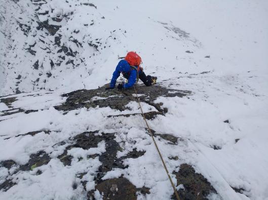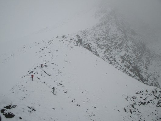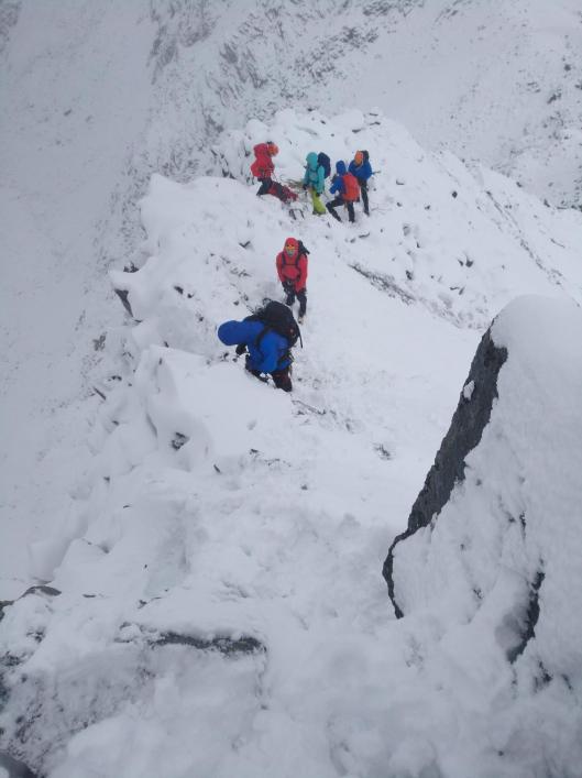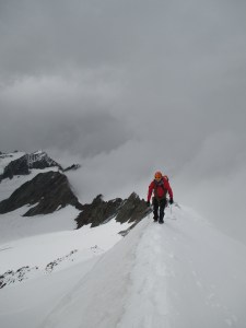 De tocht naar het Gepatschhaus was dan weer wel van formidabele kwaliteit! Toen we ’s ochtends opstonden met een vers pak sneeuw van 30 centimeter wisten we al dat we een zeer uitdagende dag tegemoet gingen. De instijg naar de geplande graat, die normaal over een aangeduid pad zou gaan, werd plots een hele uitdaging. Alle markeringen waren uitgewist door de sneeuw en oriëntatie werd belemmerd door een dichte mist. Gelukkig hadden we waypoints aangeduid in de gps en was het toch mogelijk om ons door de sneeuw en de mist heen naar de graat te oriënteren. De instijg was al een waar avontuur, om nog maar te spreken de beklimming zelf! Met crampons en piolet in de aanslag werd al snel duidelijk dat een makkelijke graatbeklimming door de plotse schotse winter condities ineens een heel stuk moeilijker werd. Met enkele afgezekerde technische klimpassages en sneeuw van begin tot einde was dit een onvergetelijke ervaring. Maar onze tweede top, de Hinter Olgruben Spitze (3296m) was een feit!