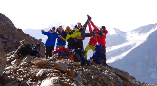 Zo werd het Taschachhaus na een herkansing gekatapulteerd naar de eerste plaats en zo ook beleefden wij dankzij een herkansing de climax van onze stage! Na een mislukte eerste poging waren we allen vastberaden om een tweede toppoging naar de Bligg Spitze te ondernemen. De motivatie was groter dan ooit! Dat was te merken aan het snelle tempo waarmee we de al eens eerder afgelegde instijg aflegden. Voor we het wisten waren we weer aan de gletsjer waar we de vorige keer hadden moeten terugkeren. Ditmaal leek echter, alsof het ons lot was, de lucht nog dreigender dan de vorige keer. Een grijs wolkendek trok zich boven ons dicht, waarop we even twijfelden of we opnieuw onze poging zouden moeten staken. Maar het weerbericht dat we in de hut hadden geraadpleegd had enkel bewolking voorspeld, geen regen. Dankzij de hypermoderne smartphones is het tegenwoordig zelfs mogelijk om vanop een berg toegang te hebben tot de laatste weersverwachtingen. Goed nieuws, men had bewolking voorspeld maar bleef erbij dat het niet zou gaan regenen of onweren. Waarop wij even gemotiveerd onze tocht weer verder zetten. De gletsjer werd zonder veel moeite overgestoken en de graat bedwongen zonder enige problemen. Het was ons gelukt de top van de Bligg Spitze te bereiken. De euforie was immens! Zes glunderende kopjes feliciteerden elkaar en straalden van geluk na deze onvergetelijke stage. Een enorme ervaring rijker en een stapje dichter bij een volleerde alpinist! Maar meer dan dat, verzadigd en voldaan na een heerlijke week culinaire fijnproeverij!