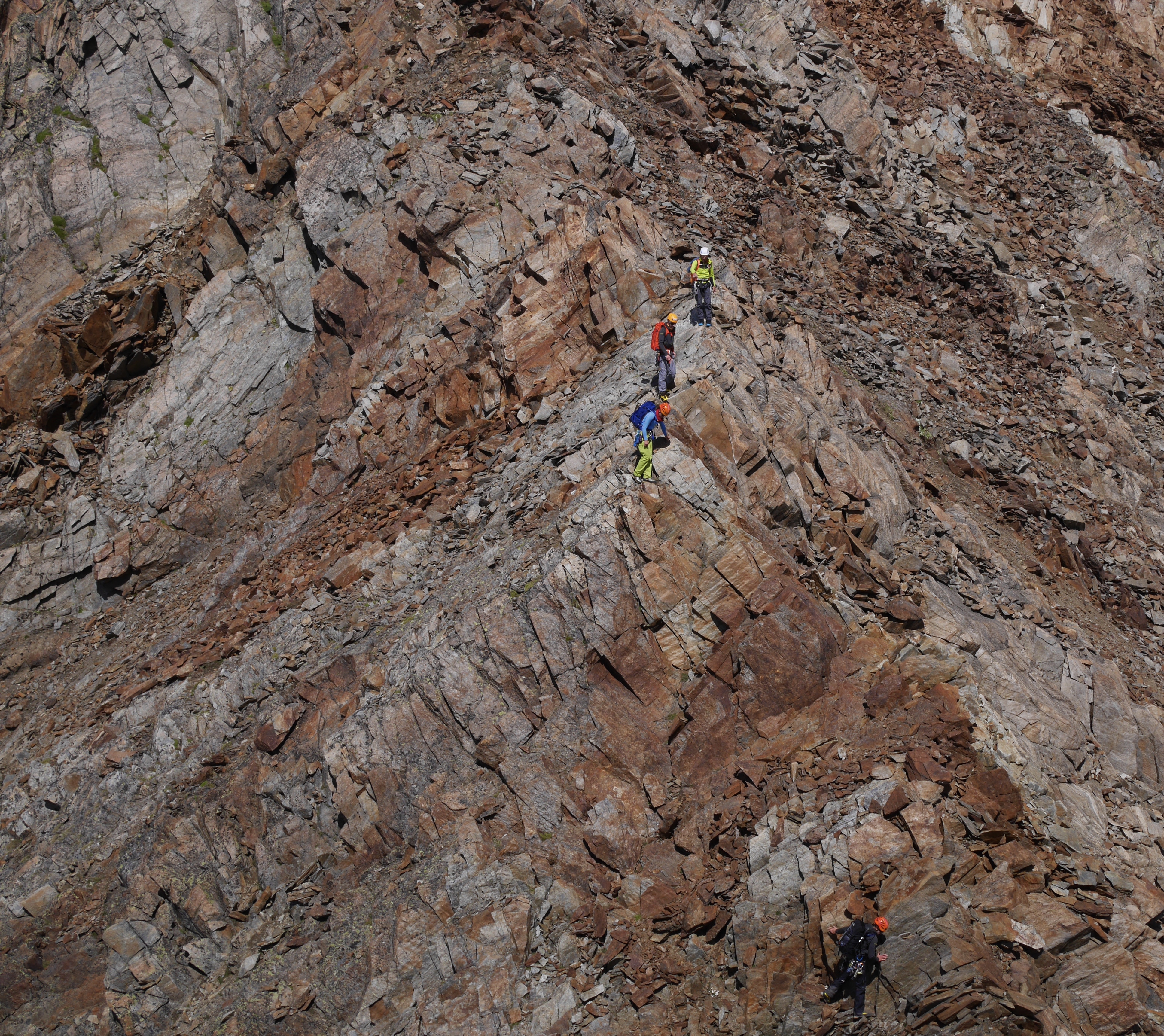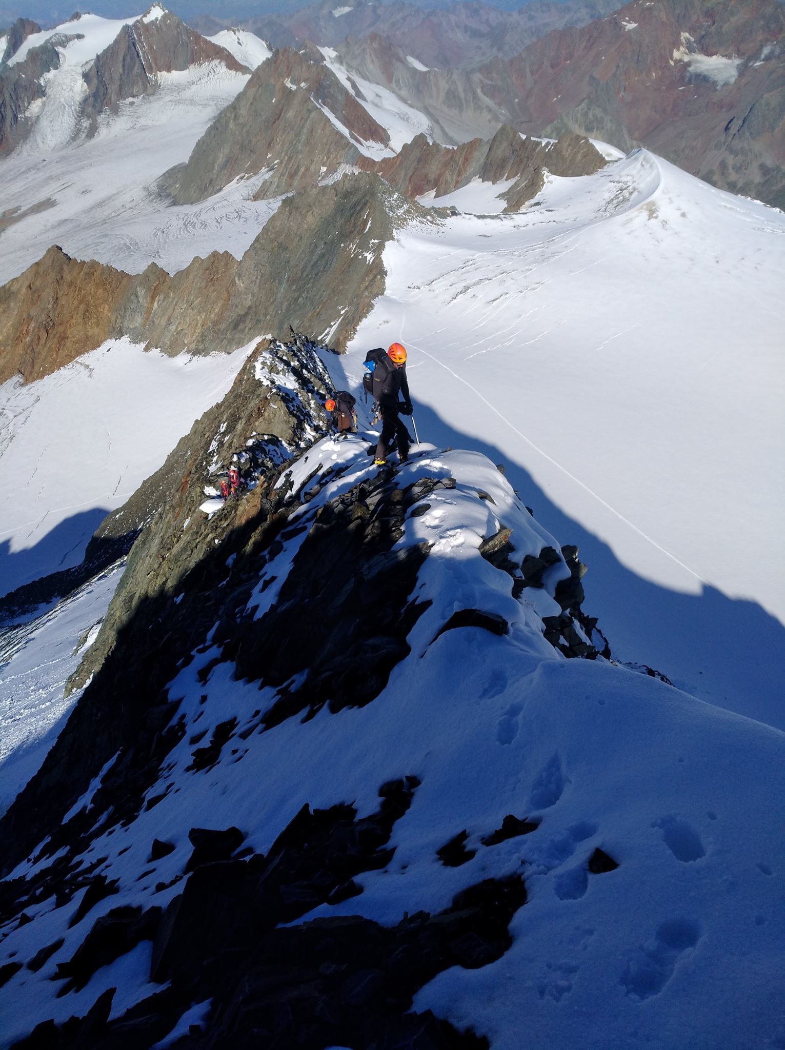 De tocht naar de Breslauer Hütte ging gepaard met de beklimming van de Wild Spitze (3770m), vooraf gegaan door de beklimming van de Hinter Brochkogel (3635m). Twee zeer mooie beklimmingen. De graat naar de top van de Hint. Brochkogel was van ongeziene kwaliteit. Met zeker twee passages op solide rots, veruit de stabielste graat van onze stage. Op de top van de Hint. Brochkogel hadden we echter nog energie over en besloten we dezelfde dag nog een tweede beklimming te doen. De Wild Spitze, de tweede hoogste berg van Oostenrijk en dus een klassieker te noemen was een mooie toevoeging aan het palmares. Maar door het hoge Disney gehalte en de stormloop aan mensen op te top maakte onze ervaring gelijkwaardig aan de eerder vermelde Kaiserschmarren. Een berg van topkwaliteit, maar andere beklimmingen kregen onze voorkeur.