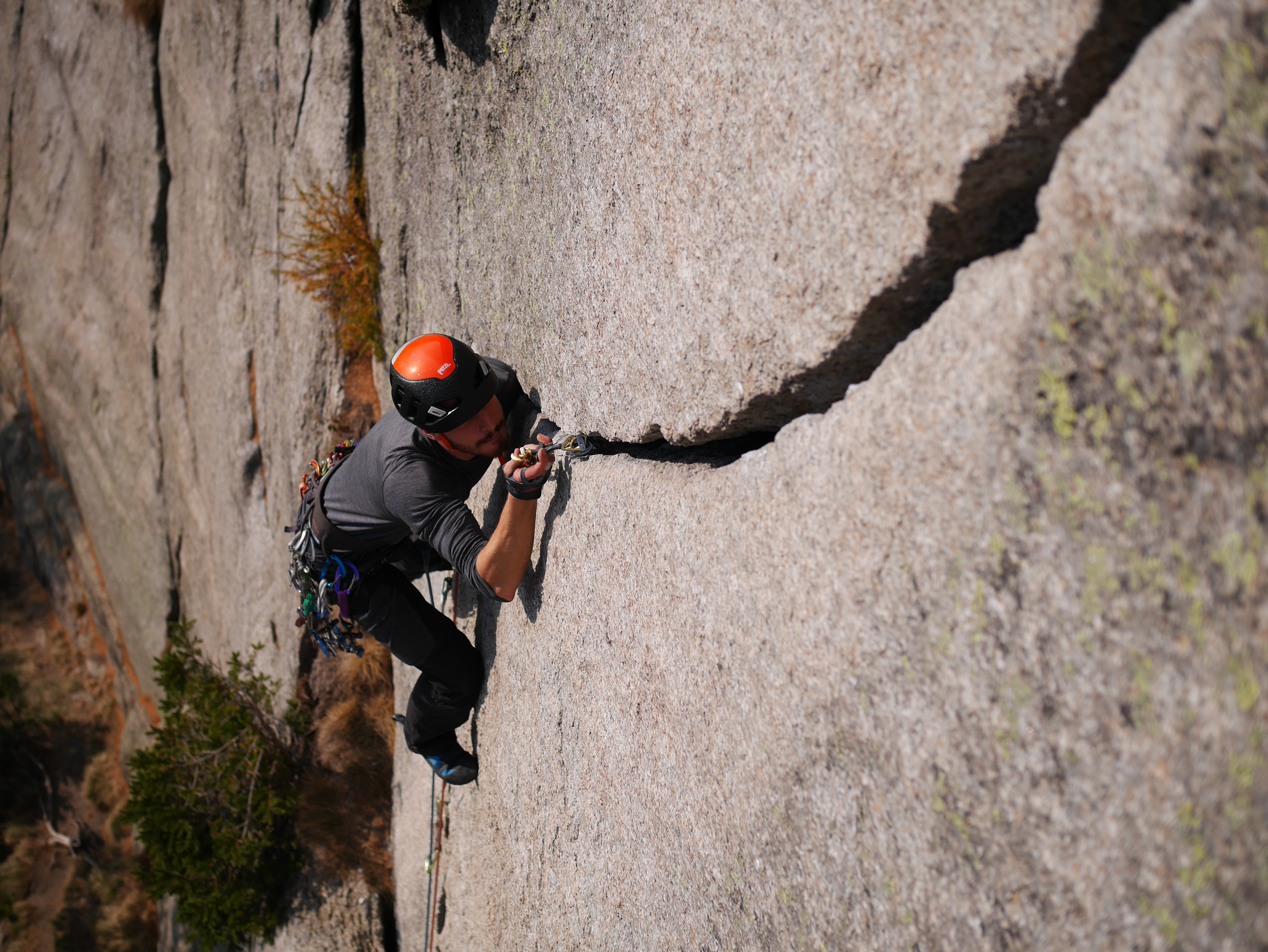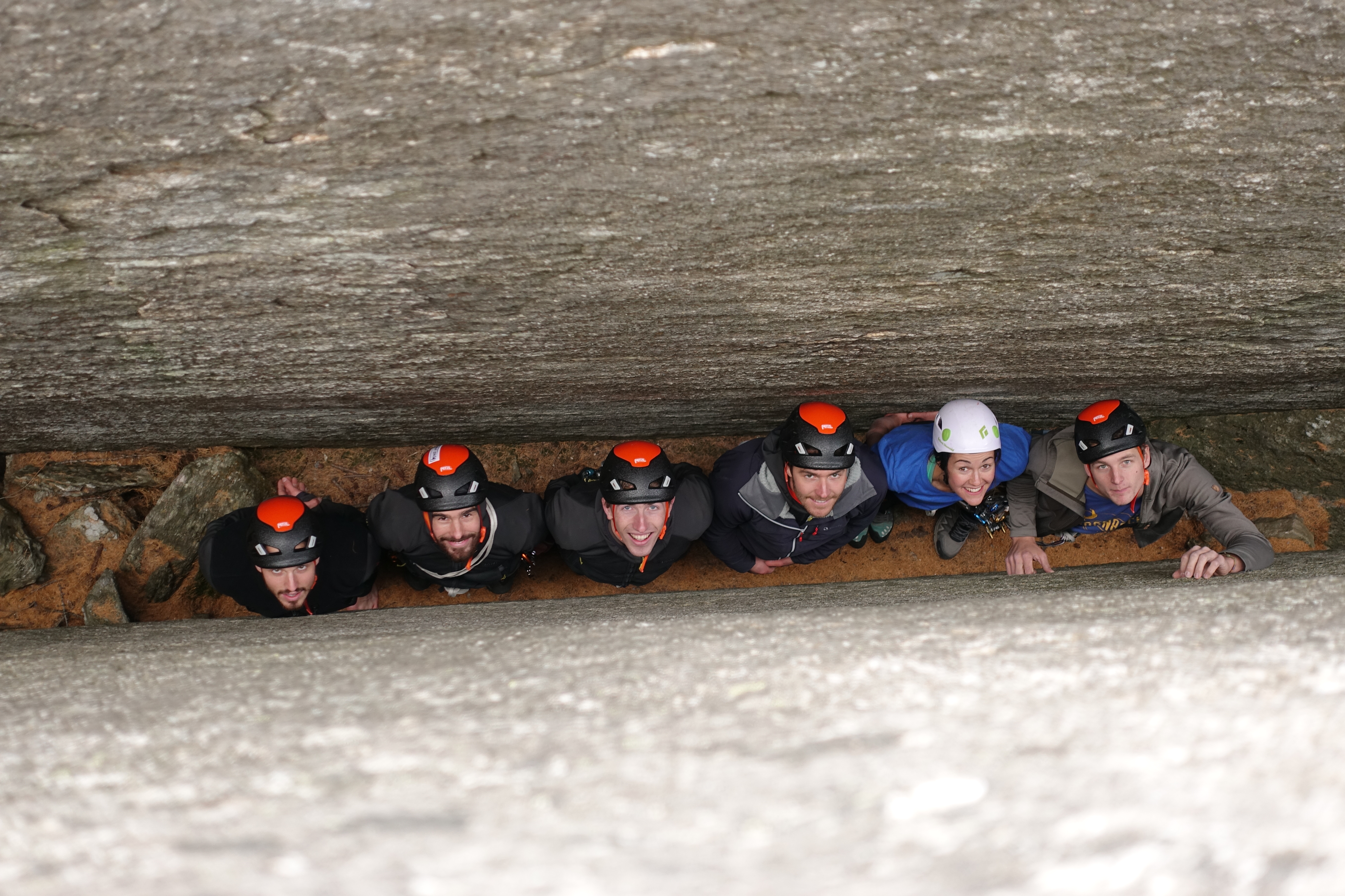Ja en nu? Geen regletjes, geen voetsteuntjes, gewoon geen normale handgrepen. Laat staan een haak. Hoe beginnen we hier aan? Gelukkig is Mount Coach 7 inventief genoeg om voor elk probleem een oplossing te zoeken! Een offwith barst die we niet kunnen afzekeren? Geen probleem! Met de nieuwste ecologische-en-breekbare relais kan elke barst dynamisch van bovenuit worden afgezekerd. Lang leven het avontuur.