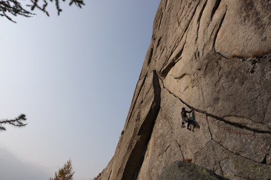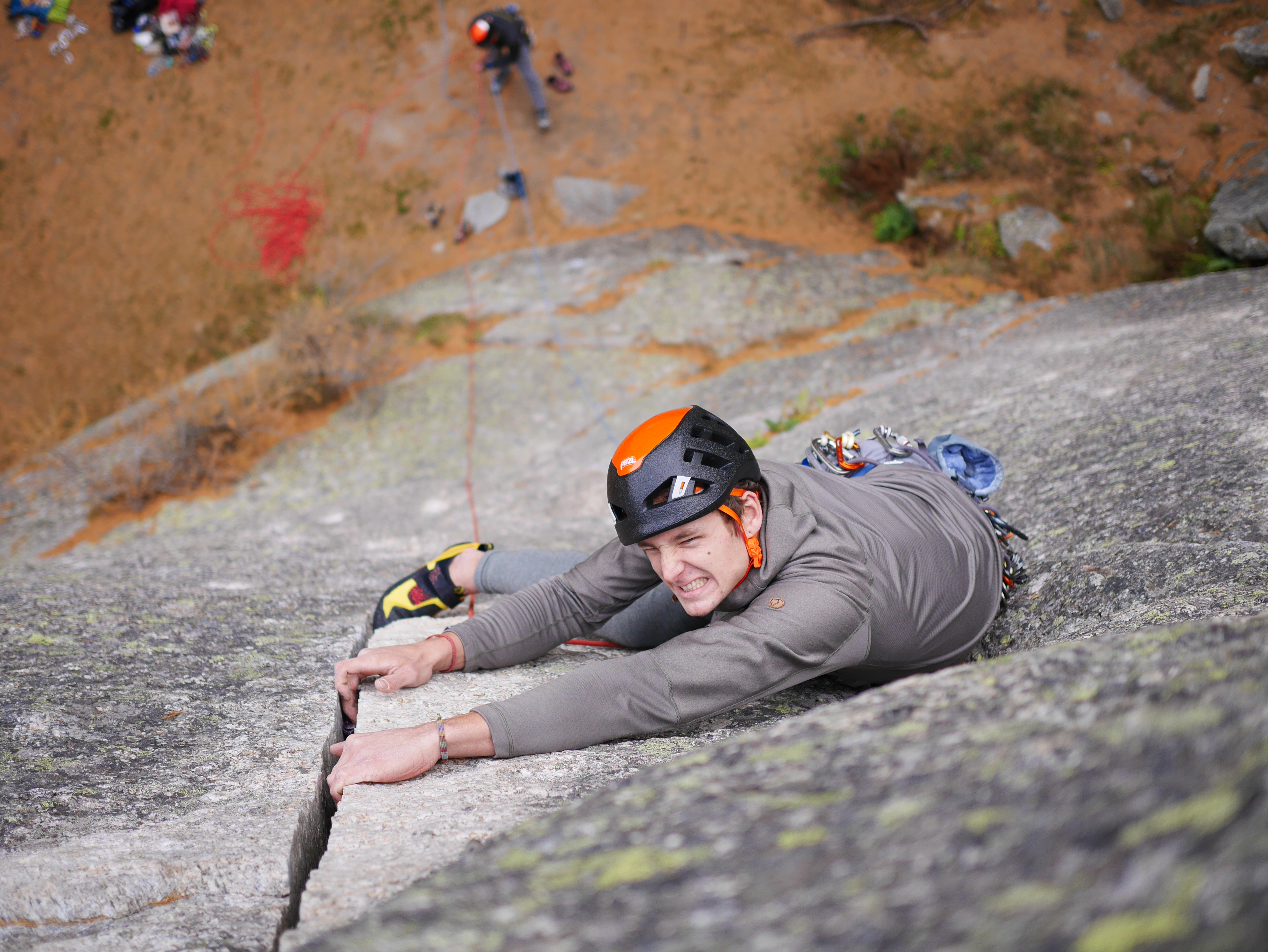 Nadat we de vorige dag hadden ondervonden dat de klimtechnieken gebruikt bij barst klimmen helemaal anders zijn dan wat we gewoon waren, ontdekten sommigen van ons een tweede moeilijkheid van het trad klimmen. Er staan namelijk geen haken die je de weg tonen. Dit resulteerde in gevloek bij het cordee van Robbe en Karel. Wat een makkelijke traverse naar rechts had moeten worden bleek plots een moeilijke 6b die in de topo als volgt wordt beschreven: ‘(…) it offers difficult and exposed climbing, often slimy and wet. The equipment consists of pegs which are not always reliable.’ Gelukkig had het al drie maanden niet meer geregend in de vallei en was de route bijgevolg droog. Maar ‘the difficult and exposed climbing on not always reliable equipment’ zorgde toch voor de nodige adrenaline. Dankzij voldoende basiskennis en durf slaagden ze er in om op een volledig veilige manier hun weg naar de top te vinden. Maar het eerste angstzweet was een feit.