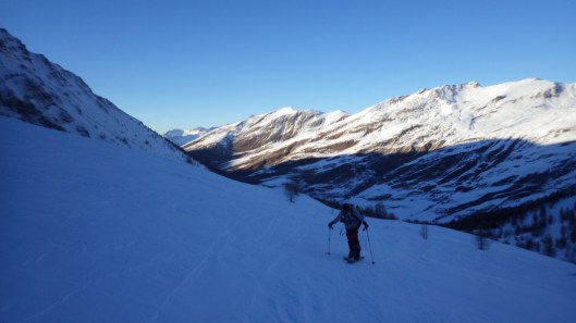 Our goal was to do a little skitour in the afternoon and so we drive to Fontgillarde and start skinning to Col de Longet. We thought to encounter perfect powder snow “There was a retour d’est last weekend right!?” but it seems that there only fell about 10 cm. Besides there had been a lot of wind so we didn’t find a meter of fluffy and soft snow… Anyway we go on, it’s at least a good training!