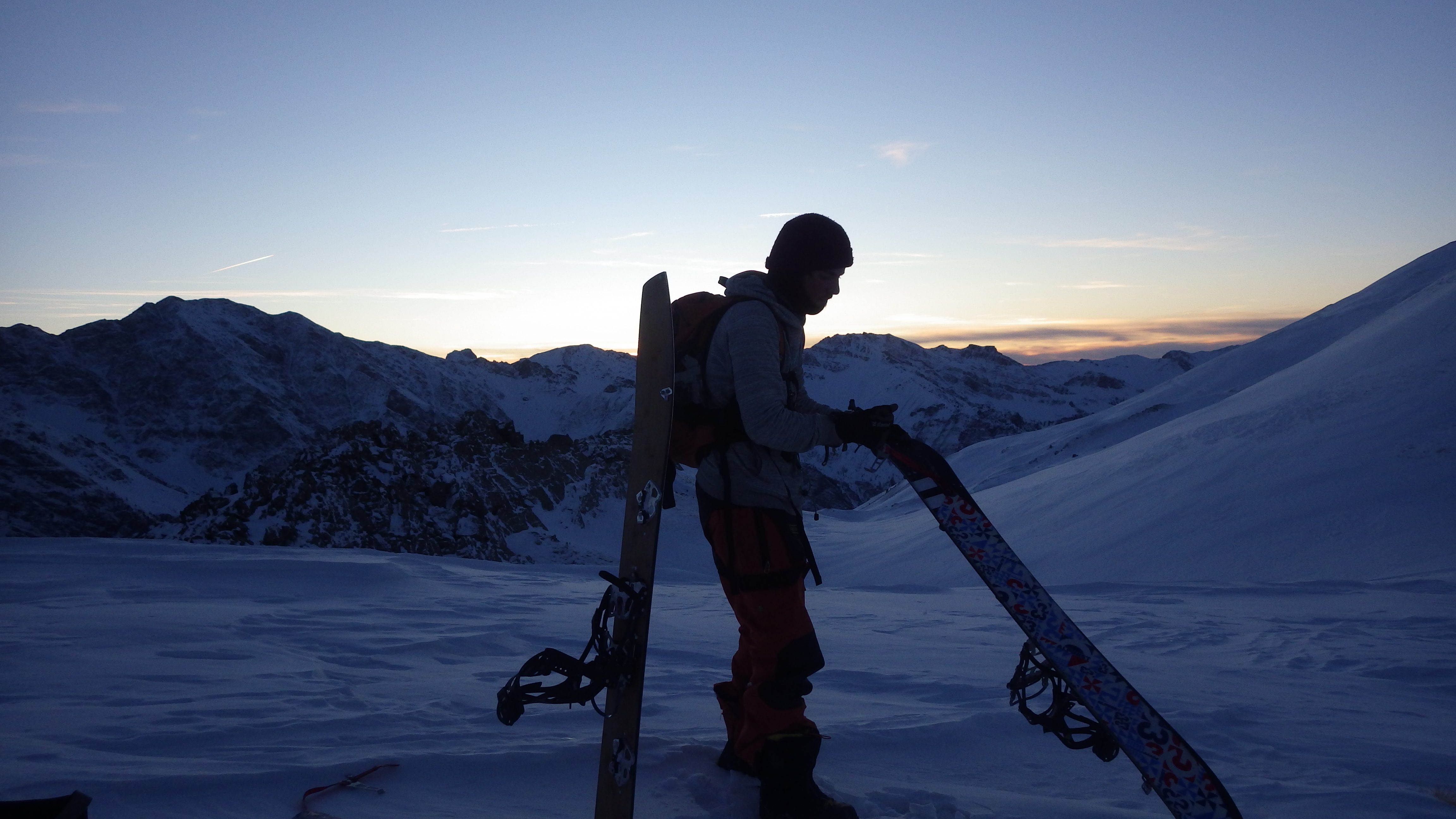 At 17:00 we’re at the col. It’s freezing cold and it starts getting dark. Headlamps instead of goggles get placed on our helmets. Junior (Etienne) forgot his one so he learns how to ski on the feeling. In the evening we enjoy ‘fondue fromage’ in the van with a descent Belgian beer.