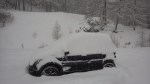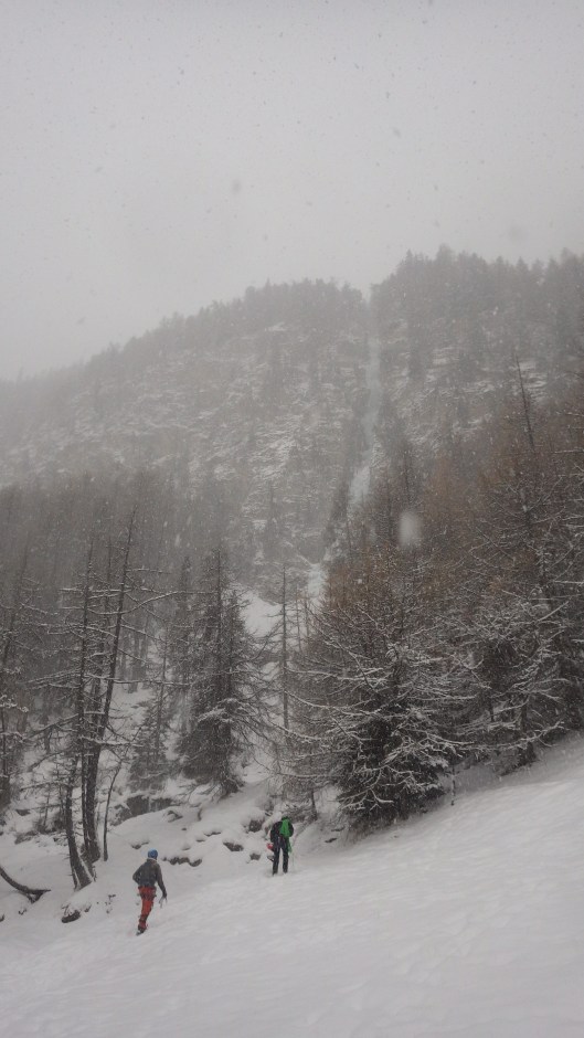 Since Les Formes du Chaos (25m, WI4) seems to be a quite popular icefall, we get up earlier on sunday. Snow starts to fall as announced so Powla gets parked at a safer spot a bit lower in the valley. The 4×4 fiat panda which I borrowed from my parents (thanks mutti and patti!) should do the job.