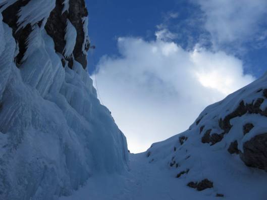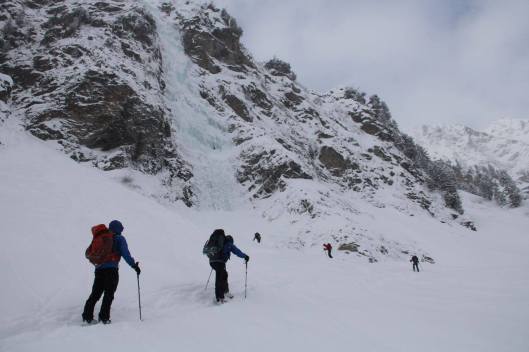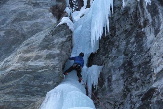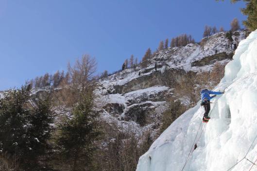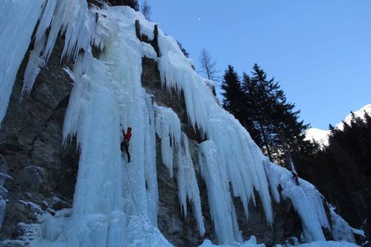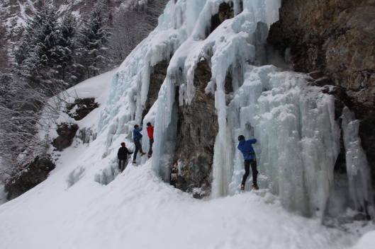 Bij het ontwaken de volgende dag mogen we voor het eerst de omgeving rondom ons waarnemen: wat een pracht! De zon schijnt op een betoverend wit landschap en op ieders gezicht. We vertrekken richting het ijspark (n.b. dit is een speciaal oefenpark dat gesponserd en vrijwillig onderhouden wordt. De kunstmatige watervallen vormen een perfecte uitvalsbasis voor beginnende ijsklimmers). Na een half uur stappen staan we onder de watervallen waar we allemaal onze Petzl Sirocco’s bovenhalen. Behalve Amelie, die plots merkt dat ze deze nog in het Tauernhaus had laten liggen. Een wandeling van een uur tot gevolg plus een traktatie voor de groep erbovenop, de volgende keer zal iedereen aan zijn Sirocco gedacht hebben.