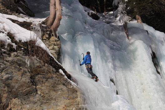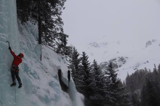 Gelukkig waren we hier voor andere doeleinden: ijsklimmen. Het is reeds onze laatste dag in Oostenrijk en deze brengen we terug in het ijspark door. Doel van de dag is zoveel mogelijk voorklimmeters te verzamelen. Het leuke aan het park is dat je veel verschillende lijnen kan klimmen en zo veel kan oefenen, minder leuk is dat al het ijs reeds uitgetrapt is. Waar we gewoon zijn van het rotsklimmen dat wanneer een route veel geklommen wordt deze afgeklommen wordt en net glad wordt, was hier het omgekeerde waar. Een waterval die veel bekommen wordt, geraakt uitgeslagen en voelt na een tijdje dus aan als een zeer esthetische trap. Maar om de hoek ontdekt Sanne, een pracht van een onuitgeslagen, nog maagdelijke route, die dan ook door allen met veel plezier werd beklommen. Een geslaagde afsluiter op de Oostenrijkse bodem.