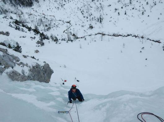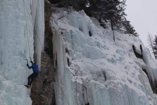 Aangekomen aan de waterval krijgt Denis de opdracht drie topropes te installeren. Terwijl leert Sanne ons de kneepjes van relaisbouw op ijs aan. Dan starten we met de eerste oefening, deze luidt, al topropend ijsvijzen plaatsen. Ieder krijgt de kans om dit te oefenen waarna we verder gaan met opdracht twee: voorklimmen met de ijsvijzen (en de relais) reeds geplaatst.