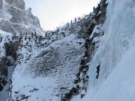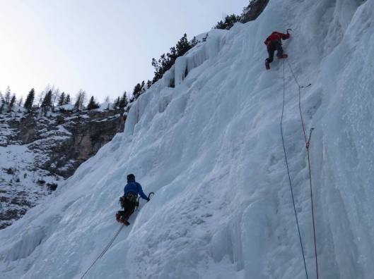 Vrijdag, onze laatste ijsklimdag. We trekken allen samen naar Val Travenanzes een vallei met een wand vol watervallen die zich uitstrekt over meer dan 200 meter. Hier zijn enkele klassieke routes en in goeie condities bieden deze watervallen dan ook veel potentieel. Maarten en Yashin hun waterval is helaas niet beklimbaar maar bij geen gebrek aan alternatief zij gaan op zoek naar een nieuwe route. Ze vinden al snel een andere lijn. Beiden klimmen een halve lengte voor, maar na 40meter moeten ze beslissen om rechtsomkeer te maken vanwege te slechte condities. Denis en Philip hebben iets verderop wat meer succes en slagen erin de befaamde Sogno Canadese (WI5) uit te klimmen. Terwijl Robbe en Karel het zelfde overkomt als Maarten en Yashin, beslissen zij na even te wachten totdat Philip en Denis voldoende gevordert zijn in hun route, om ook de eerste lengte van Sogno Canadese te klimmen. Amelie neemt Sanne ietsje verder op sleeptouw (;)) en zij beklimmen een beetje verderop een zeer mooie en avontuurlijke lijn genaamd Belvedere (WI4+). Na afloop komen we allen bijna gelijktijdig aan de auto aan, ontmoeten we nog Ann en Matty en rijden we allemaal samen richting onze lieve opa en zijn lekkere keuken!