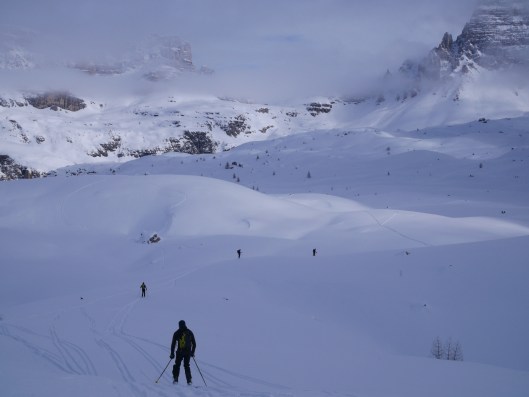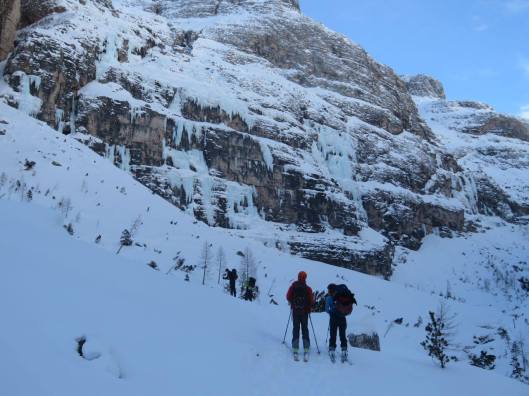 Zaterdag wordt beslist, na een grenswaardig warme dag gisteren, om het potentieel gedooide ijs aan de kant te laten liggen en een dagje rond de Drei Zinnen te tourskien. Beschouw het als een oefendagje op onze tourskistage met Pasen en als een verkenning voor de Dolomitenstage in september of gewoon als een welverdiende rust na 5 dagen ijsklimmen! Een absolute aanrader, mooie uitzichten op een ontspannend parcour in de frisse buitenlucht.