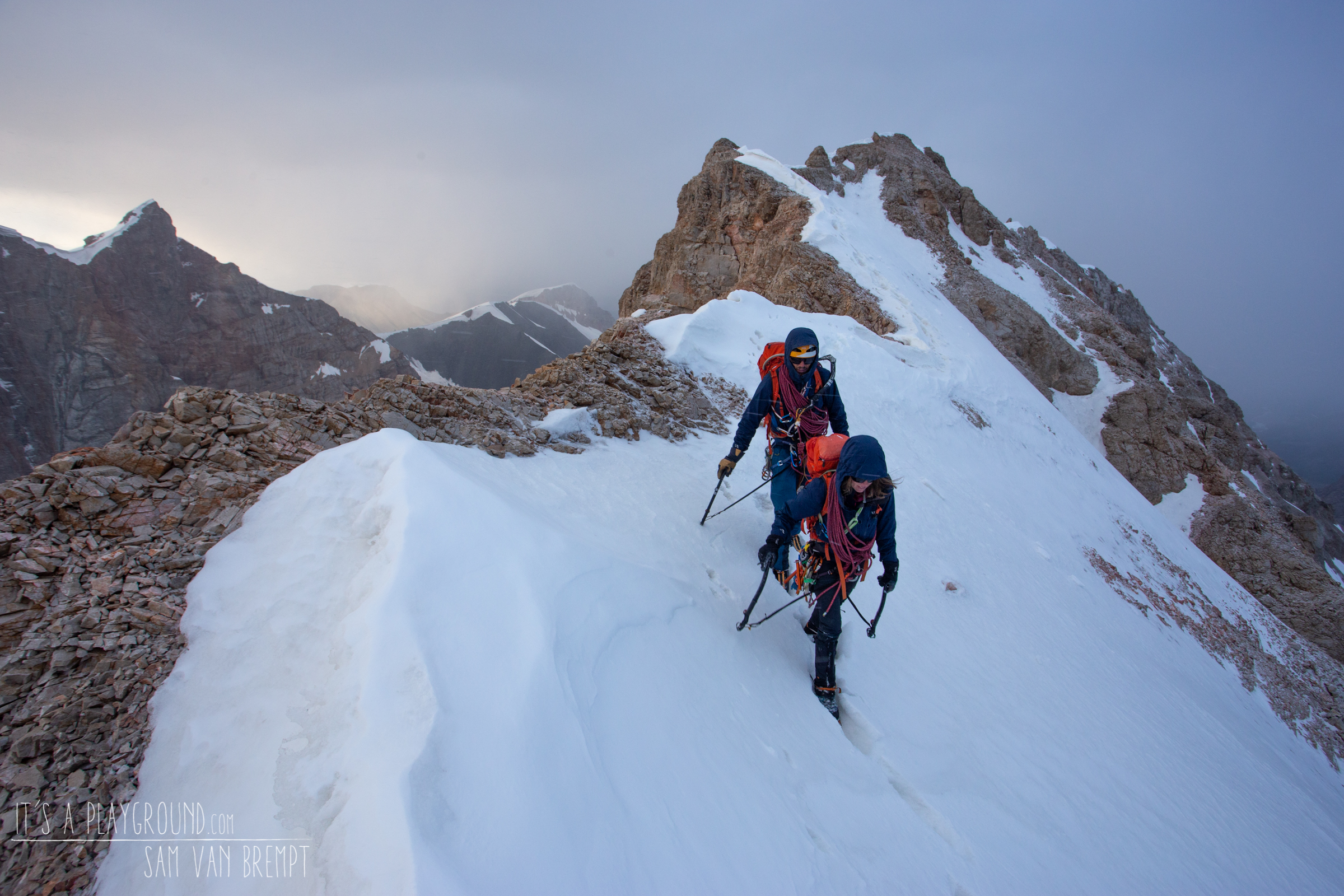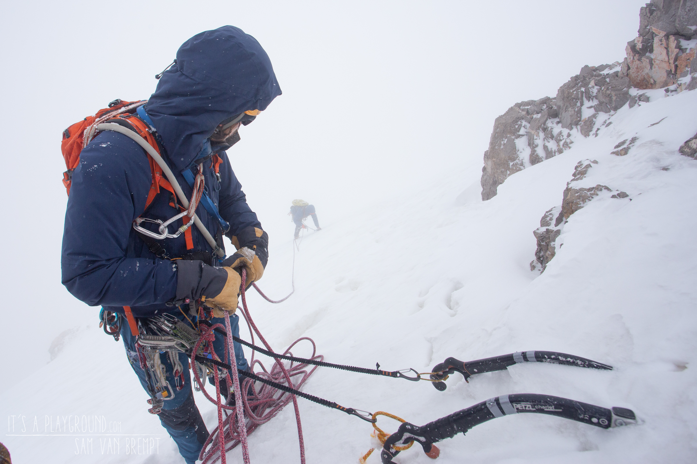 12u. De sneeuw ligt in een dik pak tegen de wand. De wind waarvan we hoopten dat die in de loop van de dag zou afnemen blaast hier onvermoeibaar op ons in. Nieuwe opgewaaide sneeuw waait rond onze oren. We zien duidelijk het begin van de topgraat boven ons. De moeilijkste passages zijn achter ons, maar onze voortgang is moeizaam. Sam en ik klimmen voorop, hij op kop. Ik zie hem zwoegen om het spoor te trekken, waarbij hij dikwijls half in de sneeuw verdwijnt. Met zijn ijsbijl graaft hij de sneeuw weg om stevig ijs te vinden om een ijsschroef te plaatsen. Dikwijls zie ik hem tot zijn schouder in zo’n gat verdwijnen voor hij voldoende goed ijs vindt.