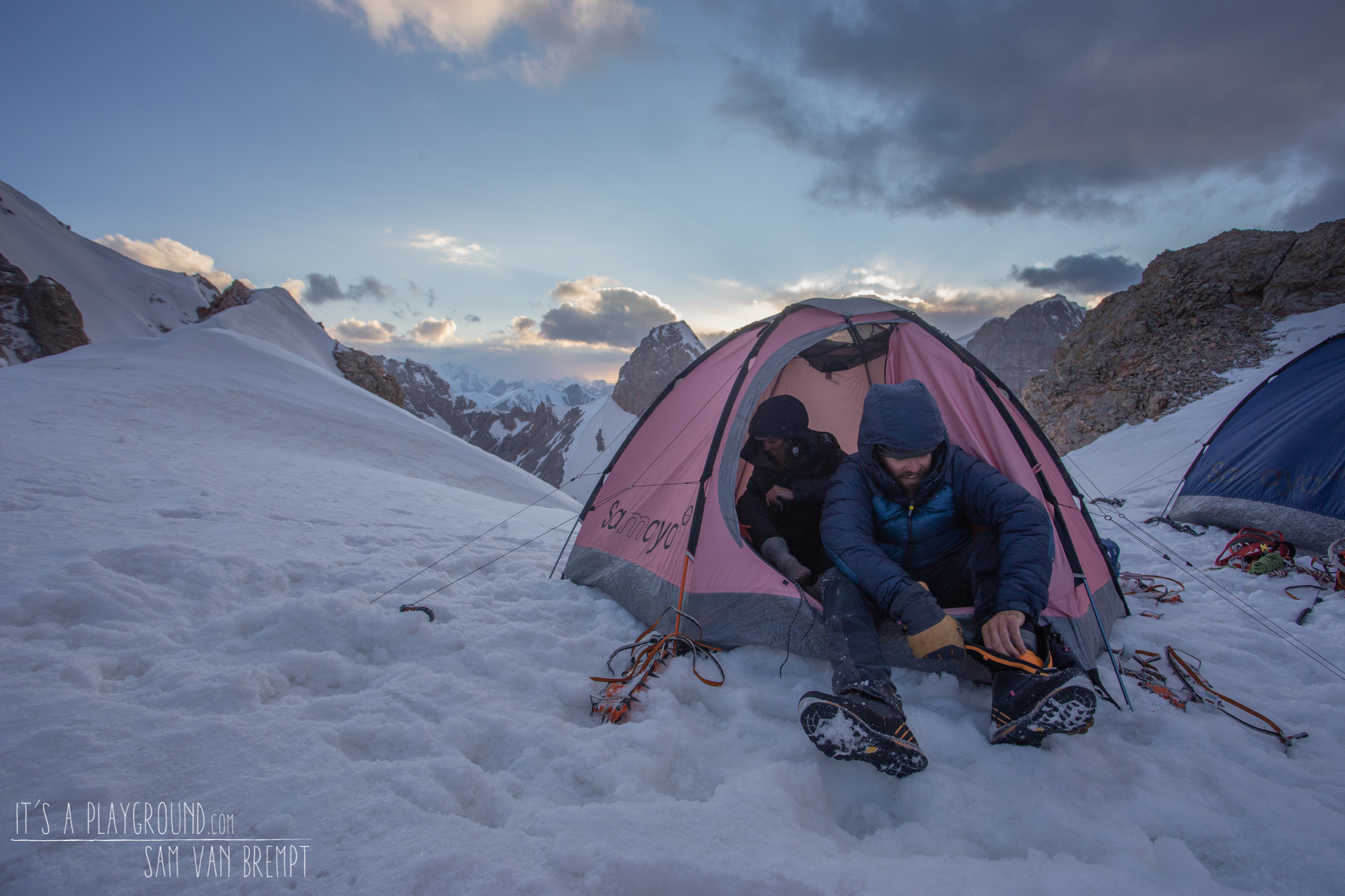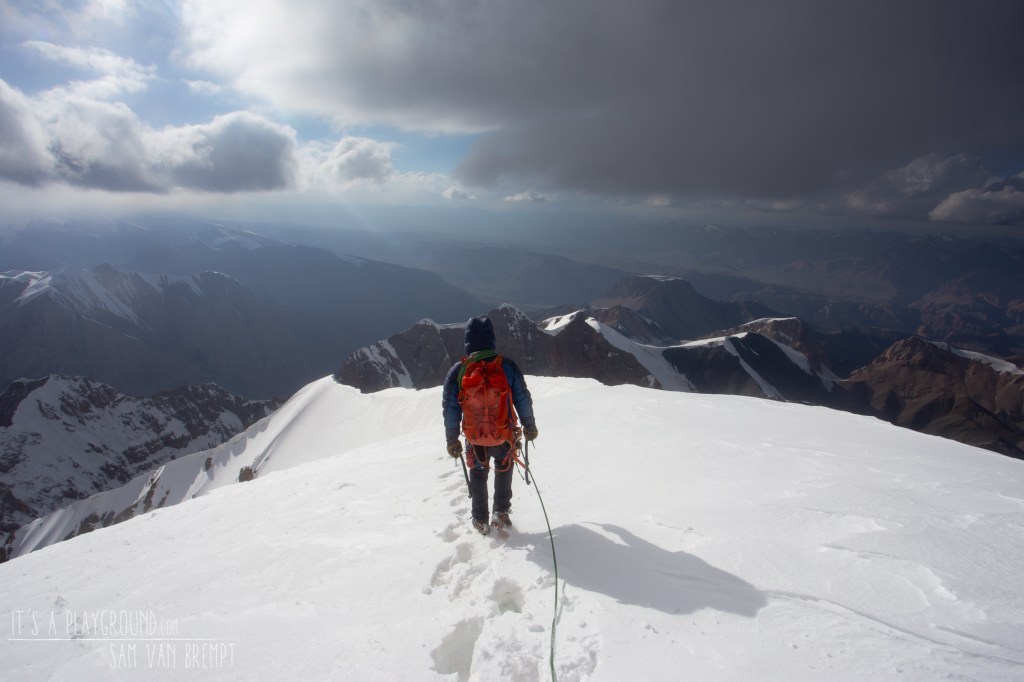 18u30. Elke goede ervaring in de bergen is er een met een valse top. Ook in Kirgizië. Gelukkig is het nauwelijks verder tot de echte top. We vieren kort onze beklimming met gedroogd fruit en noten die we in Bishkek op de kleurrijke Osh Bazaar markt kochten. Het uitzicht is ongelooflijk. We zien ons basiskamp in het noorden. Pik Dankova in het zuiden, met daarachter China. De Chinese bergen sluieren zich in wolken, de Gobiwoestijn blijft voor ons verborgen. In het zuidoosten zien we de Pik Alpinist, waar onze vrienden Tobias en Bavo een poging op wagen. Een fantastisch puntige berg die uitsteekt in het landschap omwille van zijn esthetische kwaliteiten, maar zich verre van gemakkelijk laat temmen. Iedere flank is steil.