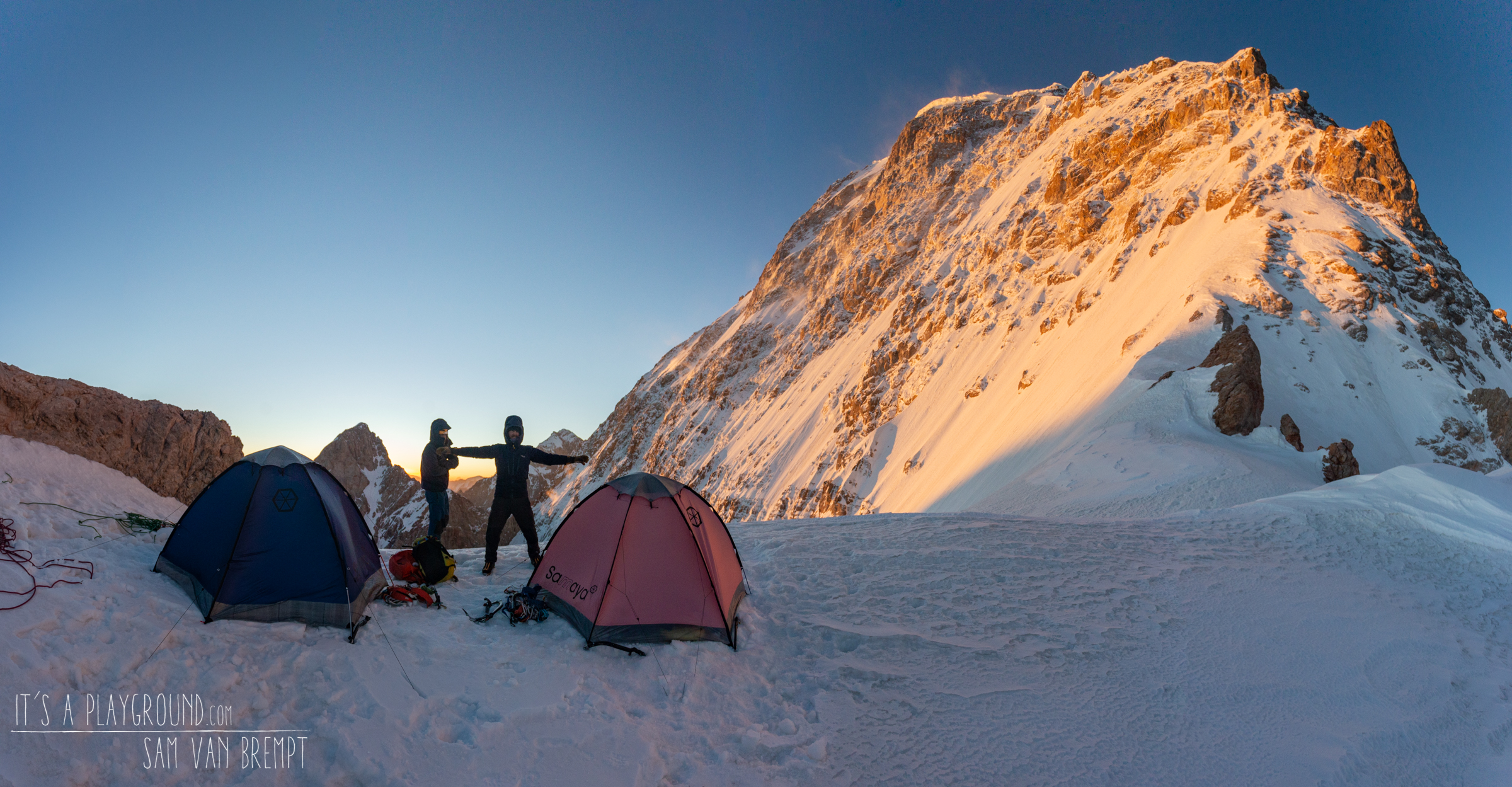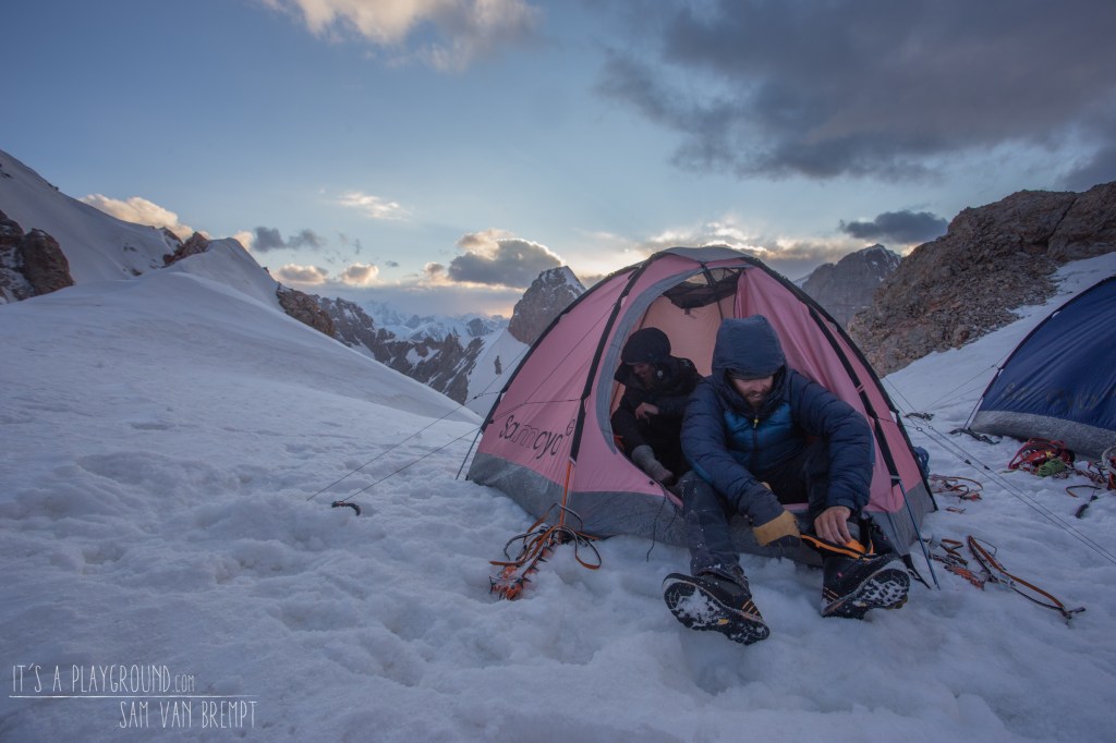 Links van ons komt nu zo’n tien kilometer verder en tweeduizend meter lager ons basiskamp in zicht. Ik moet grinniken als ik er aan denk hoeveel moeite het ons heeft gekost om het daar te krijgen. De tien kilometerlange vallei waar we een kleine week ladingen omhoog droegen lijkt plots heel klein. Ook ons hoog kamp op het zadel zien we vanaf hier staan. Onze tenten en bivakmateriaal lieten we daar achter om sneller en lichter te zijn. Later zullen we op deze plek de noordwand in duiken om langs een ijsgeul af te dalen. Zo hoeven we de ietwat delicate graat die we zonet achter ons lieten niet af te klimmen, maar zullen we kunnen vertrouwen op onze touwen en rappeltoestellen om ons veilig beneden te krijgen.