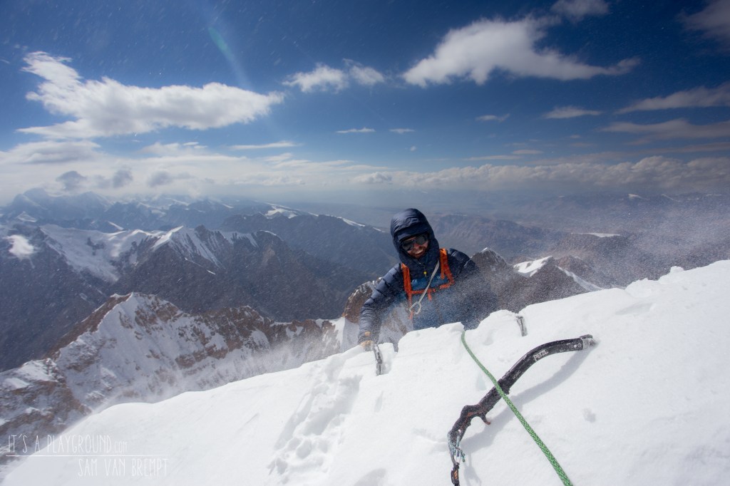 16u. Ook dit steile sneeuwveld laat ons niet zomaar uit z’n greep. Een kort verticaal stuk ijs is zo dik bepakt in sneeuw dat we er maar overheen geraken door als het ware een schoorsteen door de sneeuw te graven. Wanneer dit achter de rug is hebben we het gevoel een smaakje te hebben gekregen van de beroemde tunnels op de sneeuwtop van Cerro Torre in Patagonië. We bevinden ons nu op slechts 50 meter van de topgraat, die daarna over 150 hoogtemeters tot de top leidt. Niks lijkt ons nog te kunnen tegenhouden. Maar de voorspelde lichte neerslag in de namiddag die we hoopten voor te blijven daalt nu op ons neer. Of beter: blaast ons hevig rond de oren. Onze zichtbaarheid is fel verminderd en de temperatuur zakt. Ik zeg tegen Simon, die op de relais aankomt: “we moeten niet meer bang zijn dat er slecht weer aankomt. Erger dan dit kan het niet meer worden”. We overleggen wat te doen. De weersomstandigheden neigen naar het soort ‘beter omkeren voor er accidenten gebeuren’. Maar we hebben perfect zicht gekregen op ons traject tot de top. Zelfs in deze omstandigheden kunnen de laatste meters geen enkel probleem meer zijn. De zichtbaarheid is niet top, maar niet problematisch. Wind was er al de hele dag en die neemt niet toe. We raken akkoord dat het de moeite is om nog tot de top door te zetten. Het is immers onze laatste beklimming en na twee pogingen op ons groot doel, de Pik Dankova (5982m), waarbij we ei zo na op de top stonden willen we deze top echt graag in de wacht slepen. We bereiden ons mentaal voor op een lange afdaling en mogelijks wat kou, maar zijn overtuigd van onze beslissing.