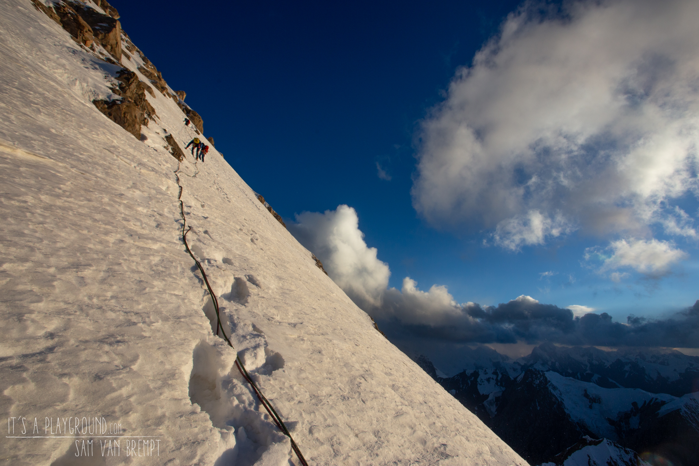 22u. De ijscouloir is lang. In het pikkedonker zien we enkel de lichtjes van onze hoofdlampen. Bij iedere rappel zie ik nooit verder dan een hoofdlamp 60 meter onder mij. Ik heb geen idee hoe ver het nog is tot we op begane grond staan. Ver weg zie ik één enkel lichtje in een zee van duisternis. Hoe uitzonderlijk is het om op 5000 meter, in het pikkedonker maar één enkel lichtje te zien? Dit toont hoe ver van de beschaving we ons bevinden.