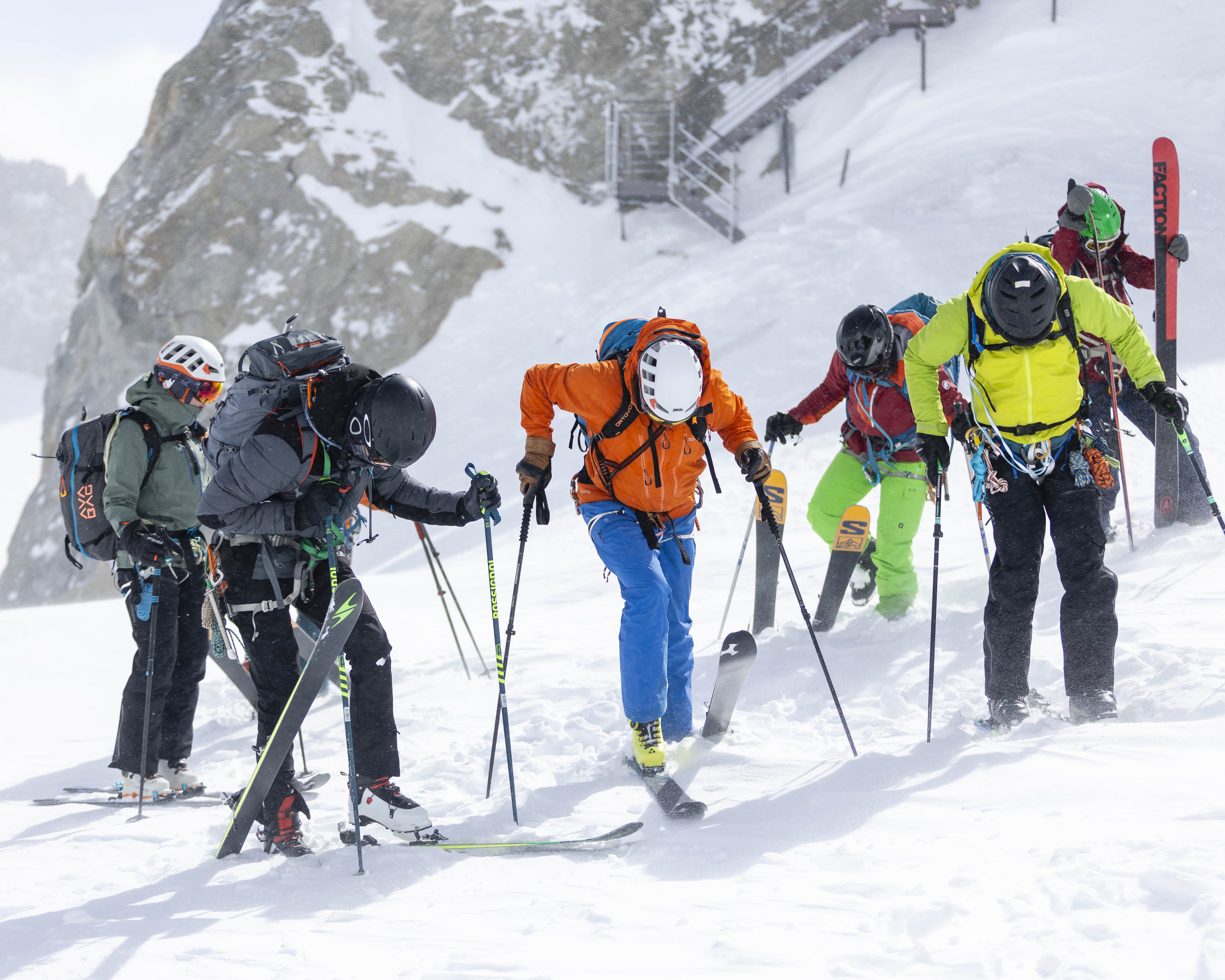 De laatste twee dagen stonden in het teken van de afdaling van de Vallée Blanche, een uitdagende off-piste afdaling. Op donderdag was het plan om vanuit de Aiguille du Midi de Vallée Blanche te skiën, maar door de hevige wind was de Aiguille du Midi gesloten. Daarom namen we de bus naar Helbronner in Italië om daar te vertrekken.