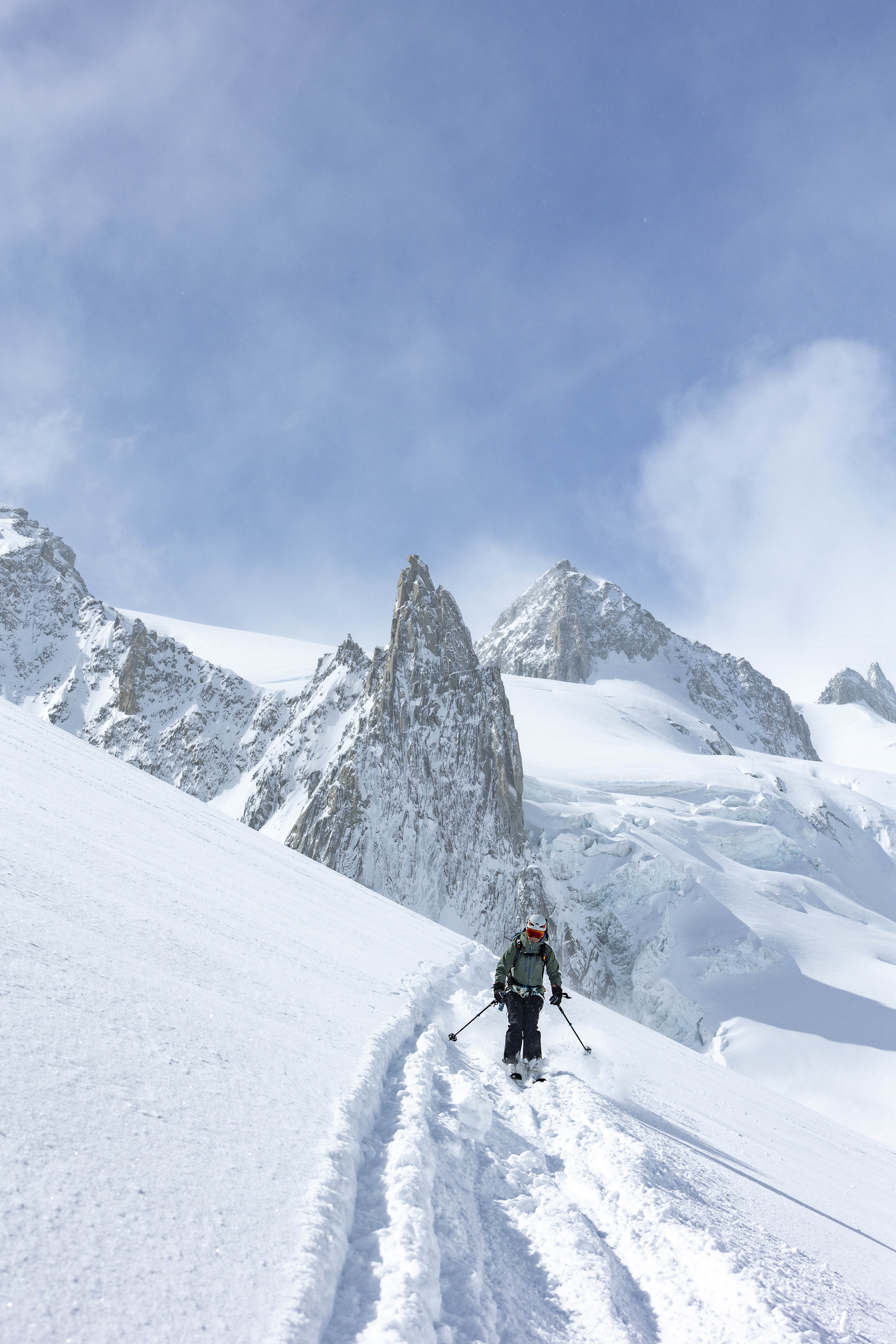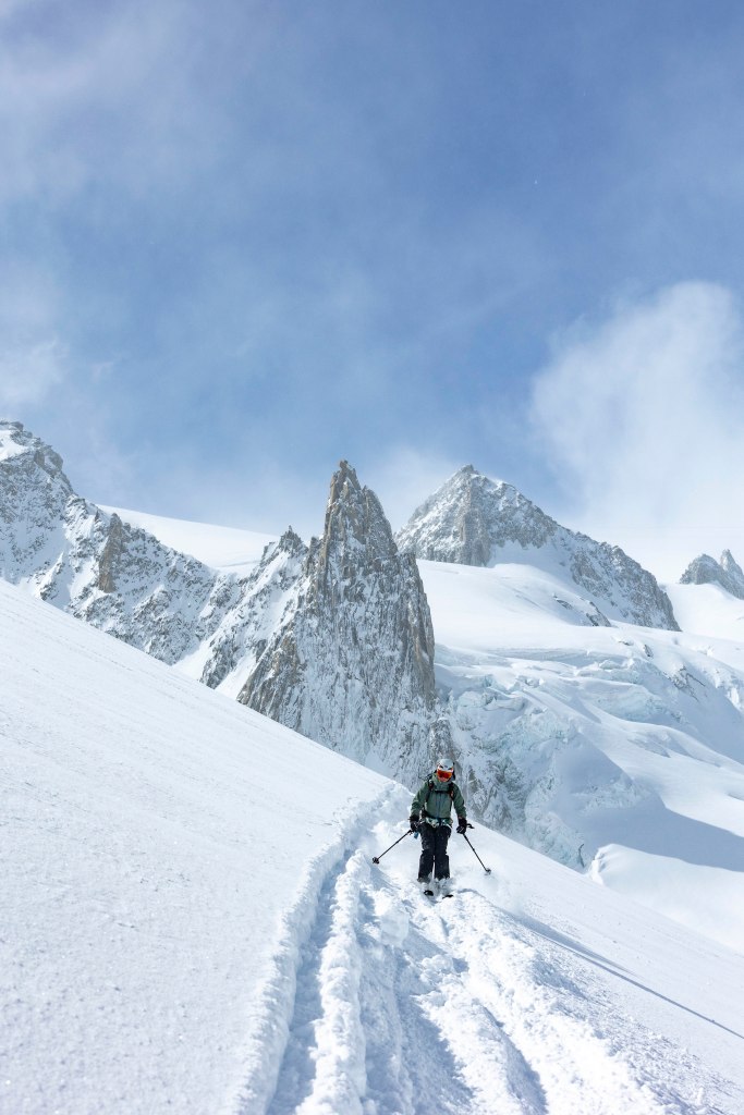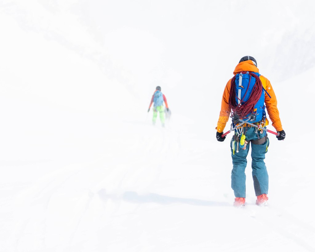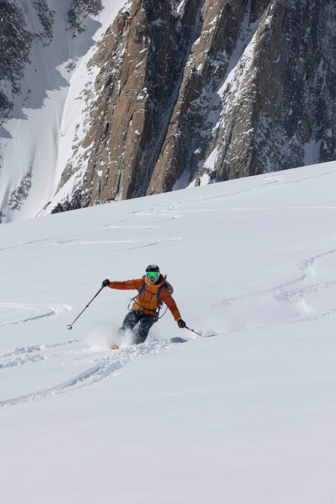 Er was ook veel verse sneeuw, wat goed was voor de sneeuwbruggen over spalten, maar tegelijkertijd een verhoogd risico op lawines met zich meebracht. Door de sterke wind en beperkte zichtbaarheid waren we een van de weinige skiërs die die dag de afdaling maakten. We hadden ook het geluk als eersten te gaan, wat in combinatie met de vers gevallen sneeuw zorgde voor een maagdelijke afdaling.