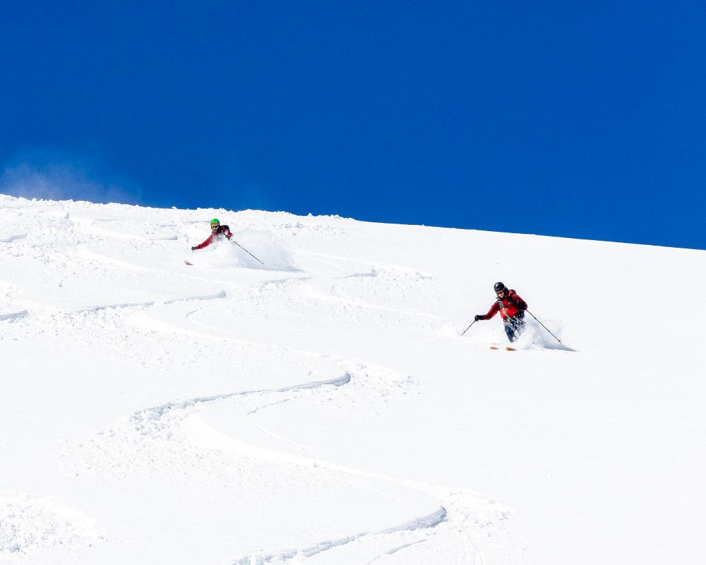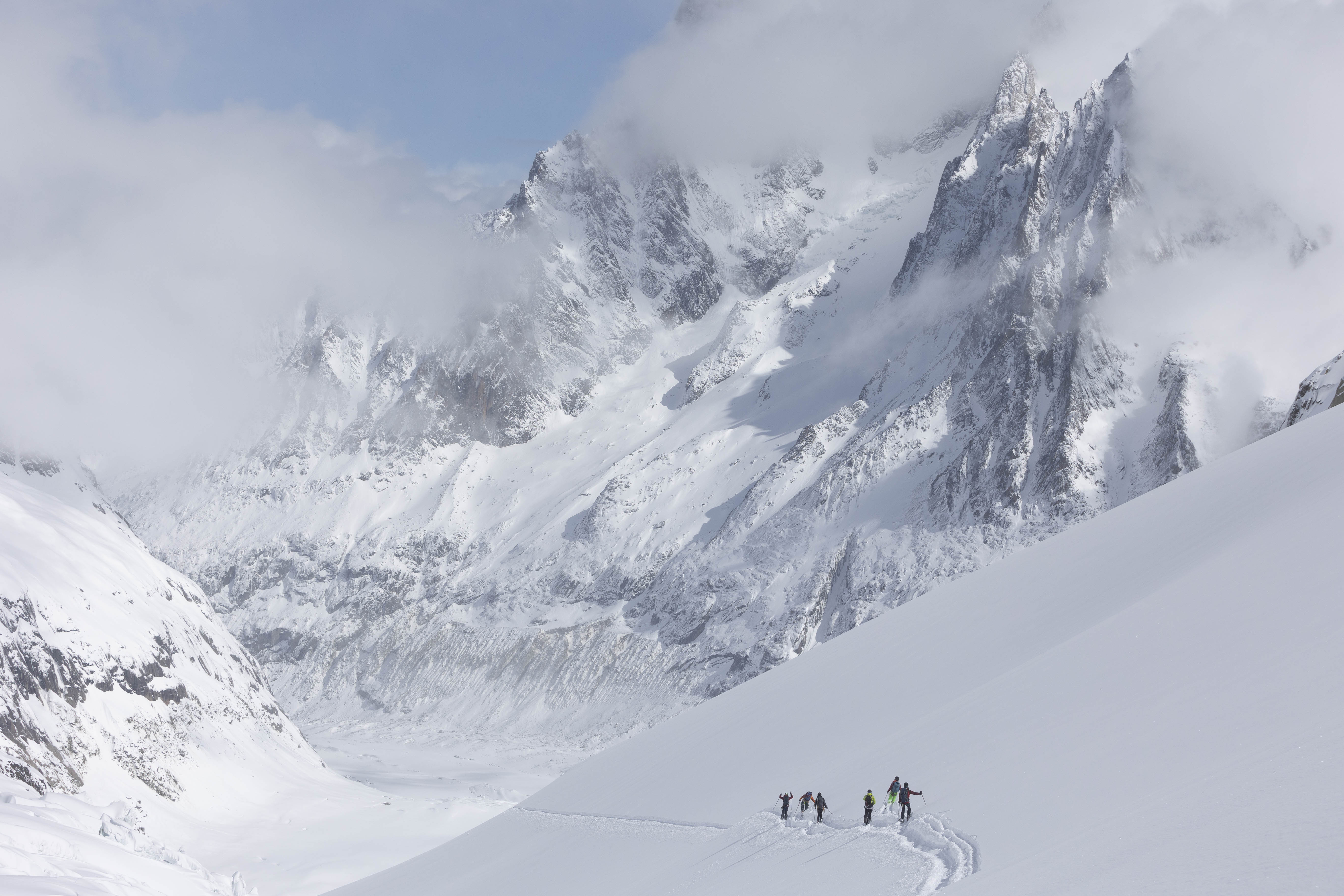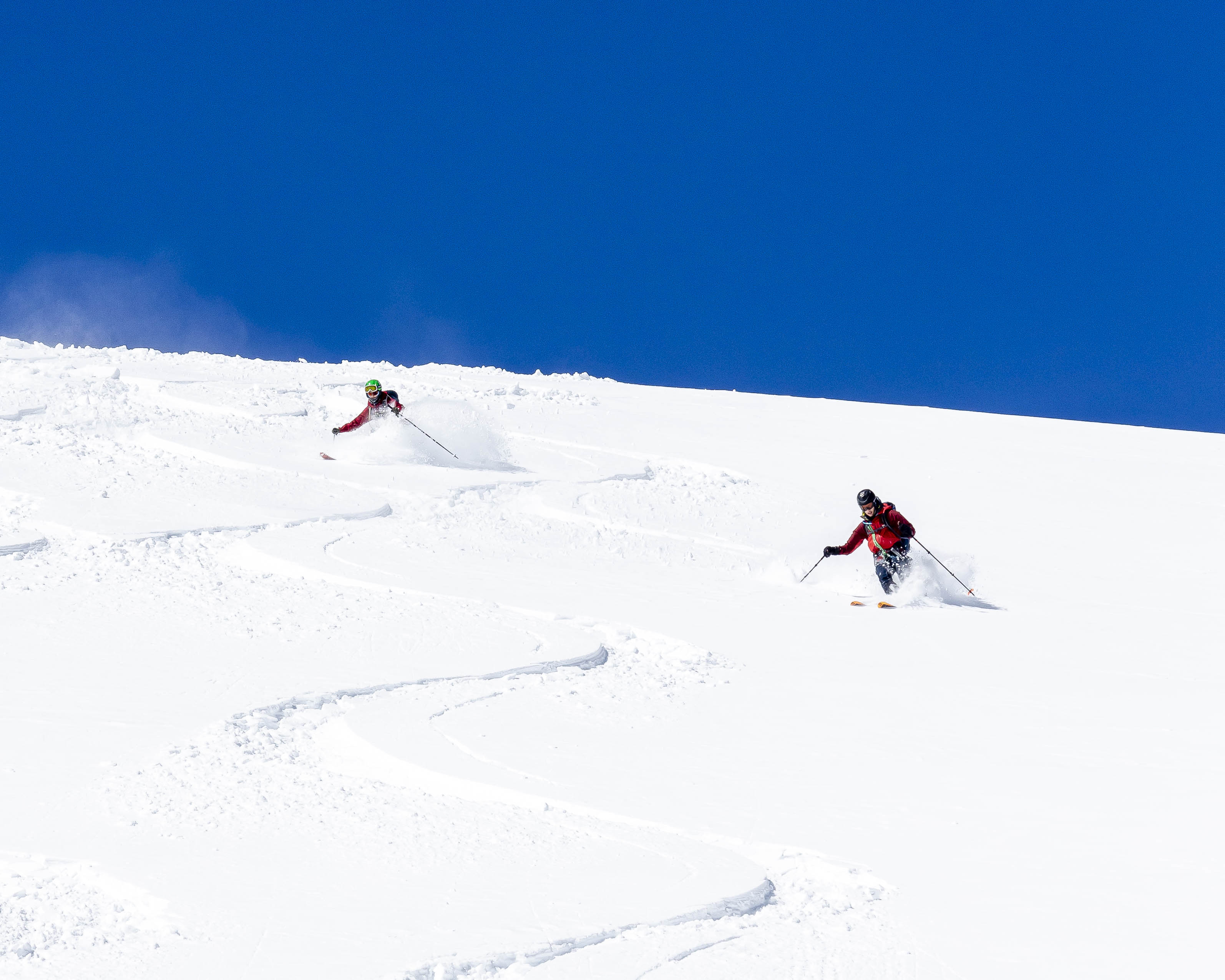 Er was ook veel verse sneeuw, wat goed was voor de sneeuwbruggen over spalten, maar tegelijkertijd een verhoogd risico op lawines met zich meebracht. Door de sterke wind en beperkte zichtbaarheid waren we een van de weinige skiërs die die dag de afdaling maakten. We hadden ook het geluk als eersten te gaan, wat in combinatie met de vers gevallen sneeuw zorgde voor een maagdelijke afdaling.