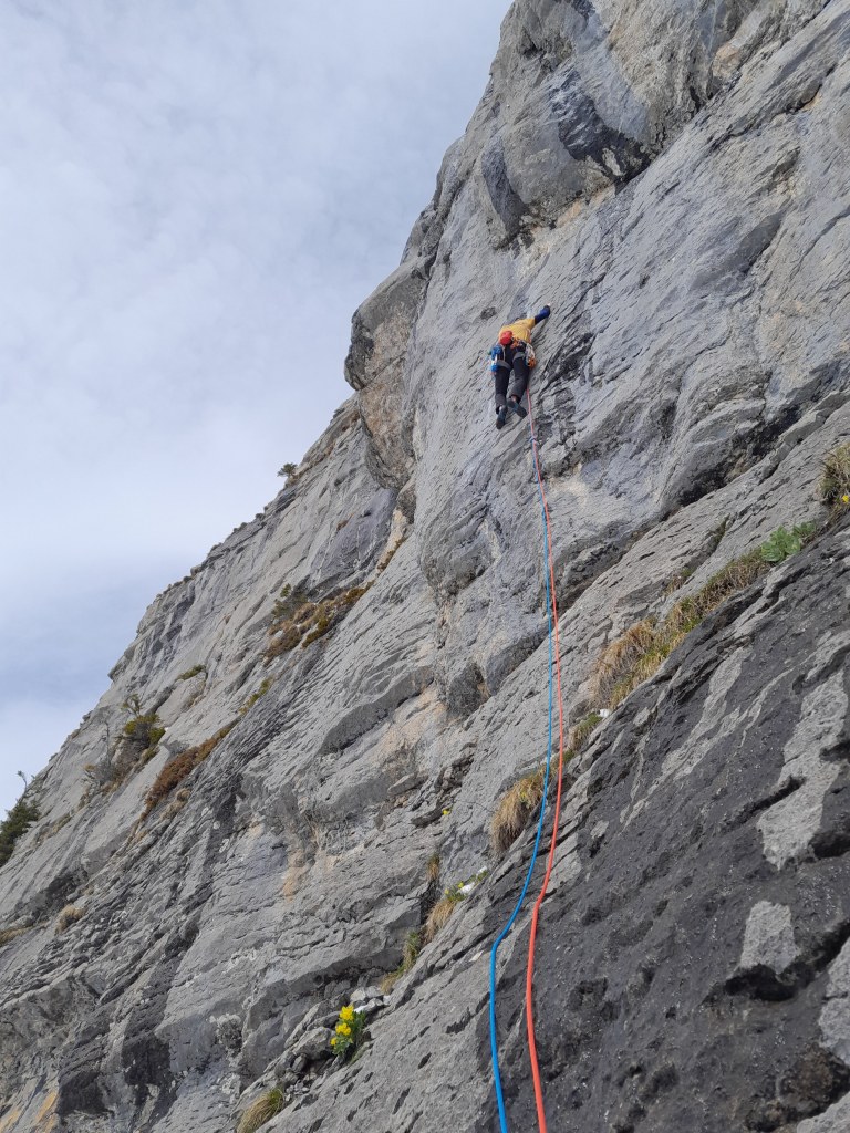 Emile en Sander kozen een route ver links op het massief, en moesten al snel terugkeren uit hun route omdat Emile te veel naar links uitweek en ze uit hun route kwamen met veel losse brol. Waarna Emile en Sander aansloten in de route van Vadim en Sanne met een harde 6a als begin gevolgd door 1 van de mooiste 6b’s die we tot nu toe hadden geklommen die week.