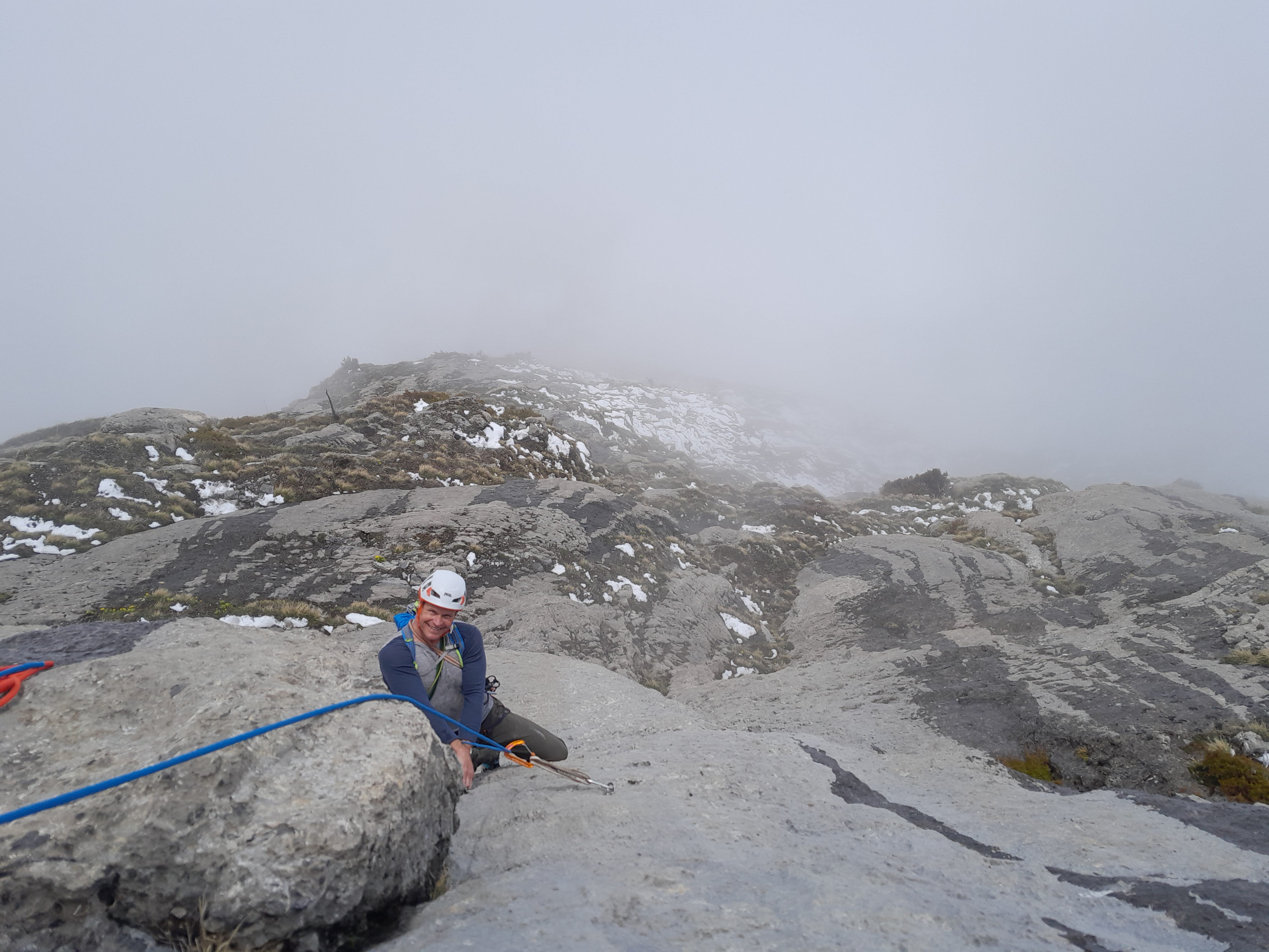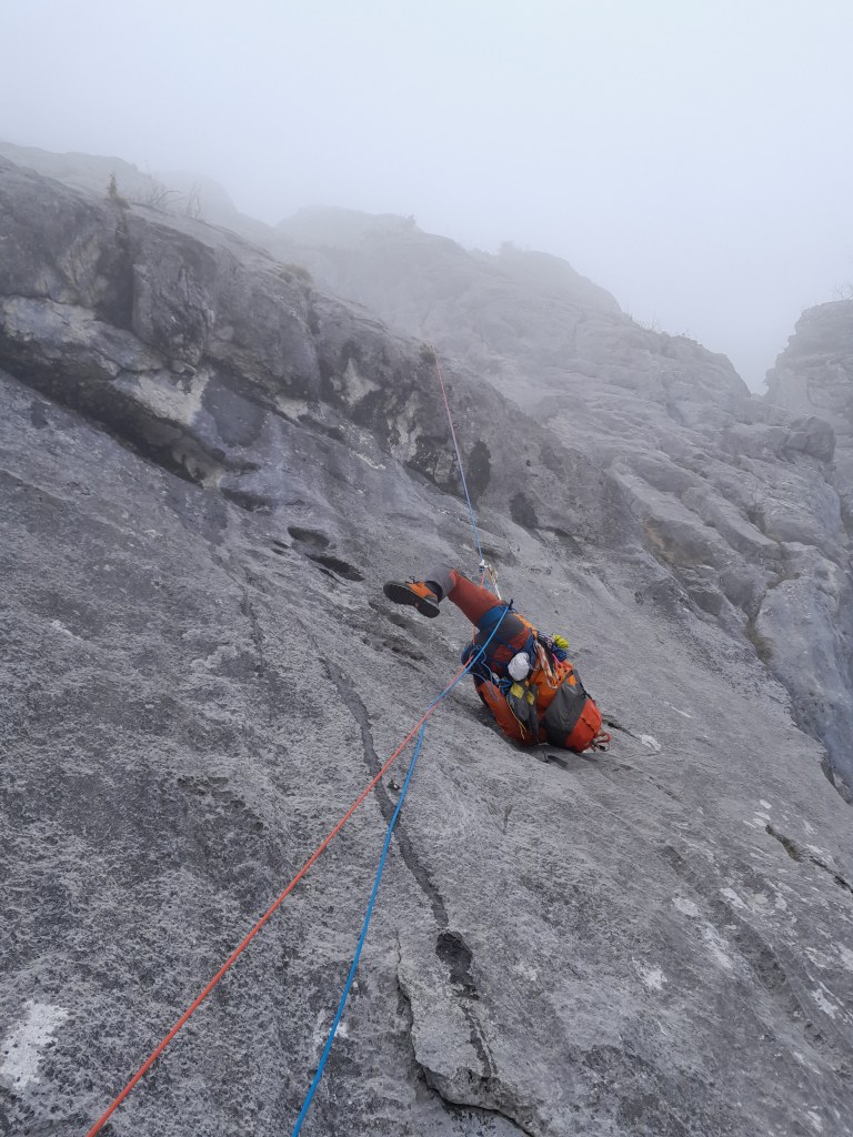 Emile en Kasper trotseerden vol goede moed / naïviteit (choose one) de route ‘Nikita’ (7b), bijna 400m lang en een 17-tal pitches bevattend. Dit werd een dag vol fases, na de eerste pitches die zich nog in de zesde graad bevonden maar die er toch al stevig in hakten, vormde er zich een woord in Kaspers hoofd: “slabducation”… en als het na de 9de lengte, wat een korte stukje scrambeling inhoudt, nog een pak moeilijker werd met slab 7a+, zijn Emile en Kasper het erover eens dat deze ervaring op dag 2 een ‘slab in the face’ is. Wakker worden jongens! “Het lijkt tijdens die eerste maanden van je Mount Coach carrière wel eens alsof je in een permanent Sinterklaasfeest beland bent, maar deze routes krijg je niet cadeau!” Als rasechte sportklimmers probeerden Emile en Kasper al deze pitches vrij te klimmen, maar Kasper gaf hier de brui aan in de 7a+ met een cruxy start, en Emile werkte als enige de 7b pitch (L12, 6c A0) deels al settentrekkend tot boven af, waarna hij ombouwde en het duo besloot af te dalen, het was tenslotte al 16 uur… De laatste vijf pitches hebben ze dus niet kunnen proberen, maar daar komen ze ooit voor terug! Het rappelen ging vlot, totdat de touwen vast bleken te zitten in de relais van L7, net toen ze (of net doordat ze?) 60m gerappeld hadden door twee relais te combineren. “Wat hier precies misgegaan is blijft een raadsel, oftewel konden we niet hard genoeg trekken aan de touwen door de rek en de wrijving die op de touwen kwam door het dal en het plateau waarop de bovenste relais gemaakt was, oftewel hadden we per ongeluk aan het verkeerde touw getrokken en zo de knoop vastgetrokken in de maillon. Het werd al bijna 17u en de mist sloop in de vallei vanaf de andere kant van de berg. De pijnlijke realiteit werd duidelijk: we moesten die 60m terug omhoog jumarren. Emile begon met enige tegenzin aan deze fysieke onderneming, en het duurde niet lang of hij riep het gebergte bij elkaar “ik wil gewoon naar huis!!” (met Antwerps accent). Na heel wat zwoegen kon hij het probleem oplossen en wat later stond het duo op de begane grond.”
