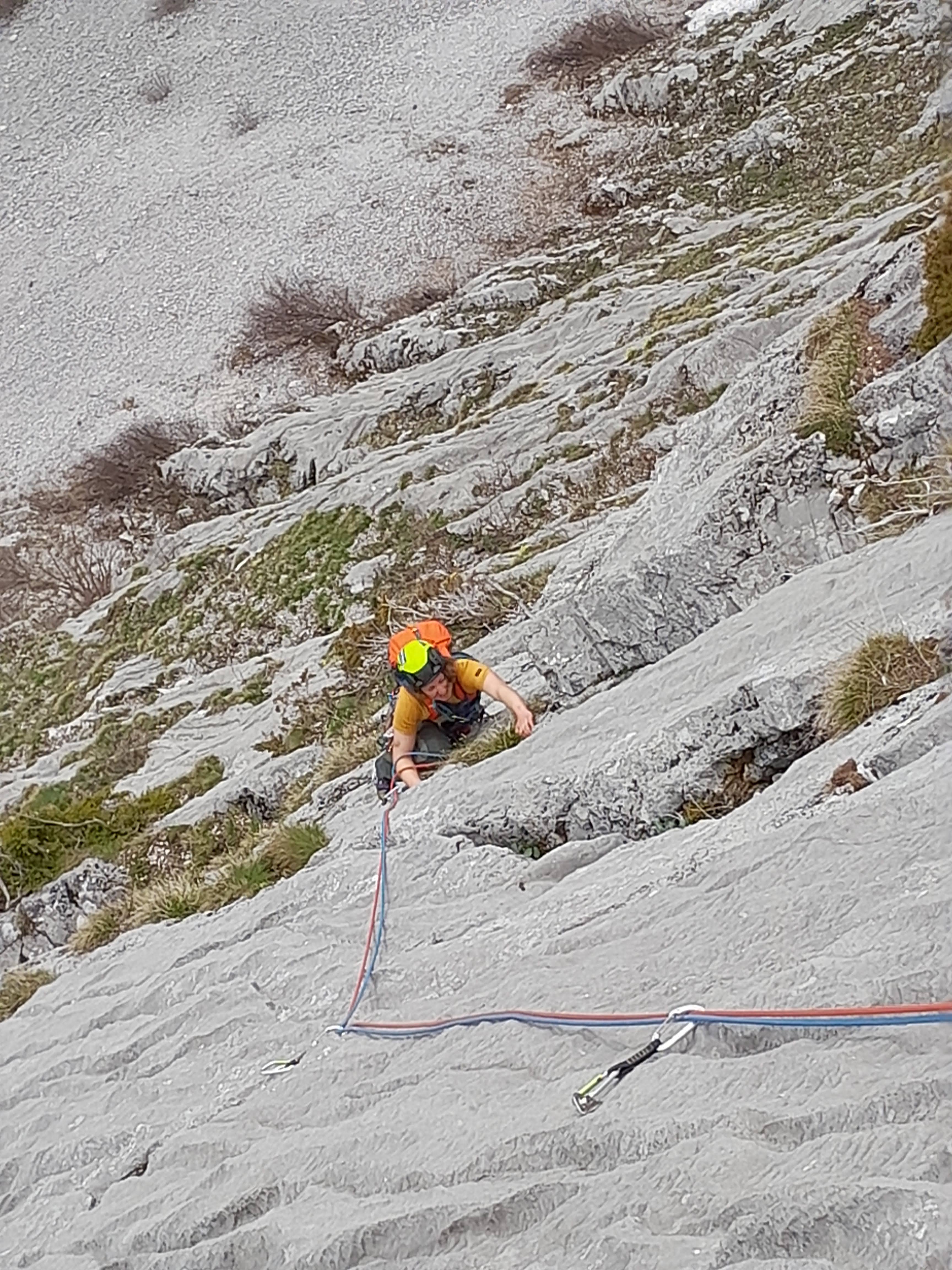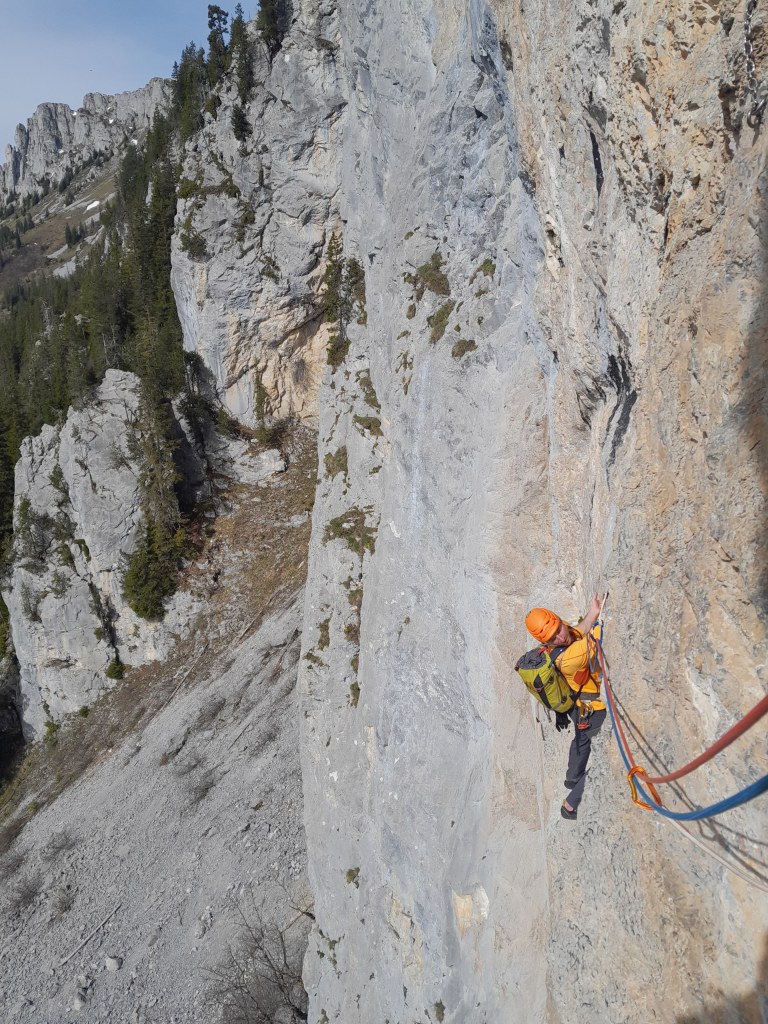 Tijdens het Hemelvaartweekend van ons eerste opleidingsjaar gingen we met het team van Mount Coach 10 voor vier dagen op klimstage in Gastlosen, Zwitserland. Het doel was niet alleen om de touwtechnieken die we twee weekends voordien nog herhaald hadden op de Belgische rotsen toe te passen ‘in het echt’, maar ook om ons karakter te trainen en onze teamspirit verder te laten ontwikkelen. We hebben alle zes minstens één van de vier stagedagen als ‘gids van de dag’ onze cordée begeleid in nieuw terrein en zo leerden we veel over tochtplanning én -uitvoering. Die uitvoering begint met de approach, hopelijk de juiste, en eindigt met een vlotte en veilige afdaling. Dat approachen en deproachen doen we natuurlijk allemaal omwille van de klimroutes! De routes die we klommen waren bijzonder gevarieerd, gaande van technisch dalklimmen tot meer fysieke, verticale en zelfs overhangende stukken rots, alhoewel dat eerder uitzonderlijk bleef. Op zich vereiste onze gekozen routes al een stevig doorzettingsvermogen, maar ons karakter werd nog steviger op de proef gesteld bij enkele onvoorziene omstandigheden…