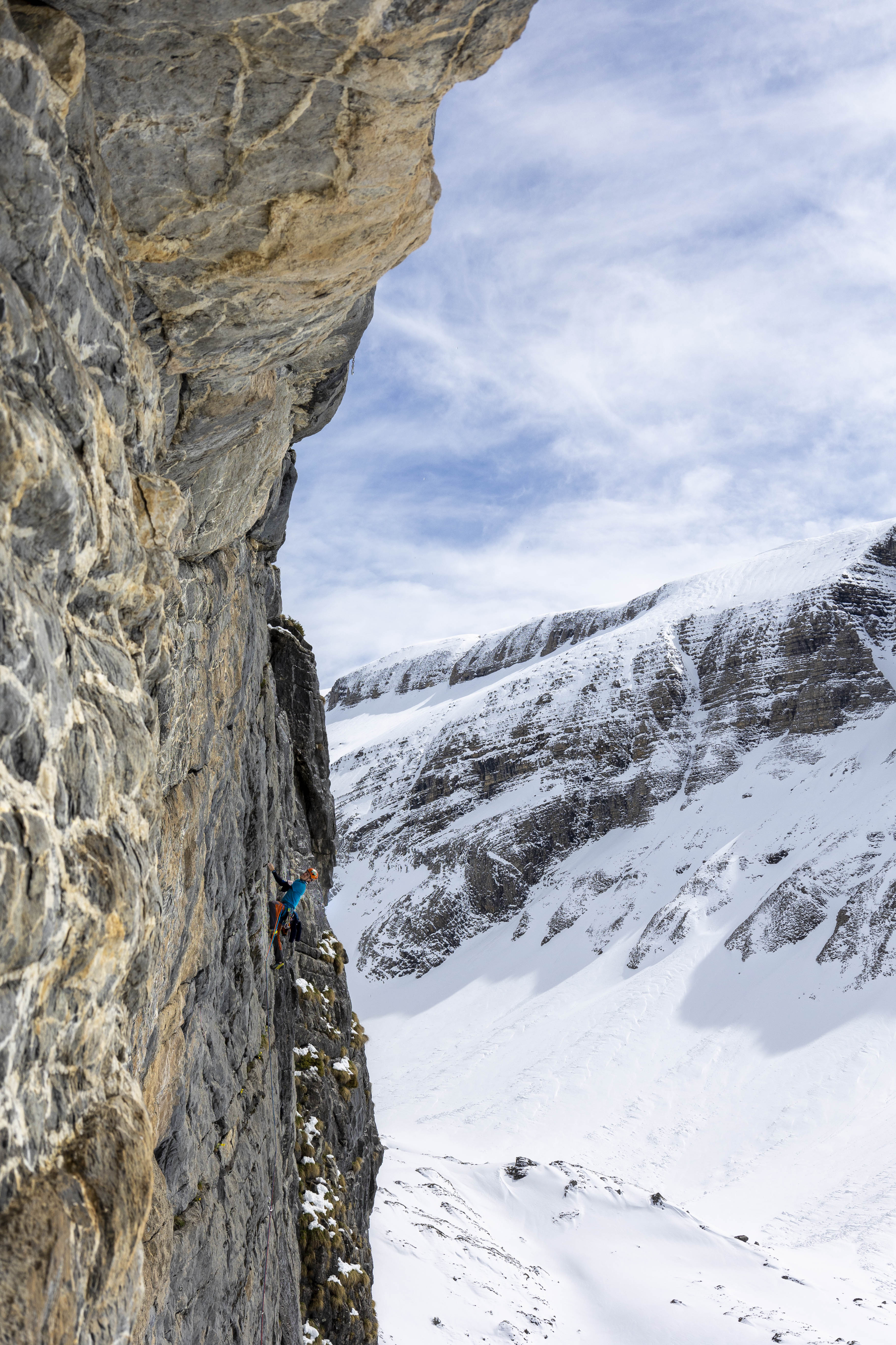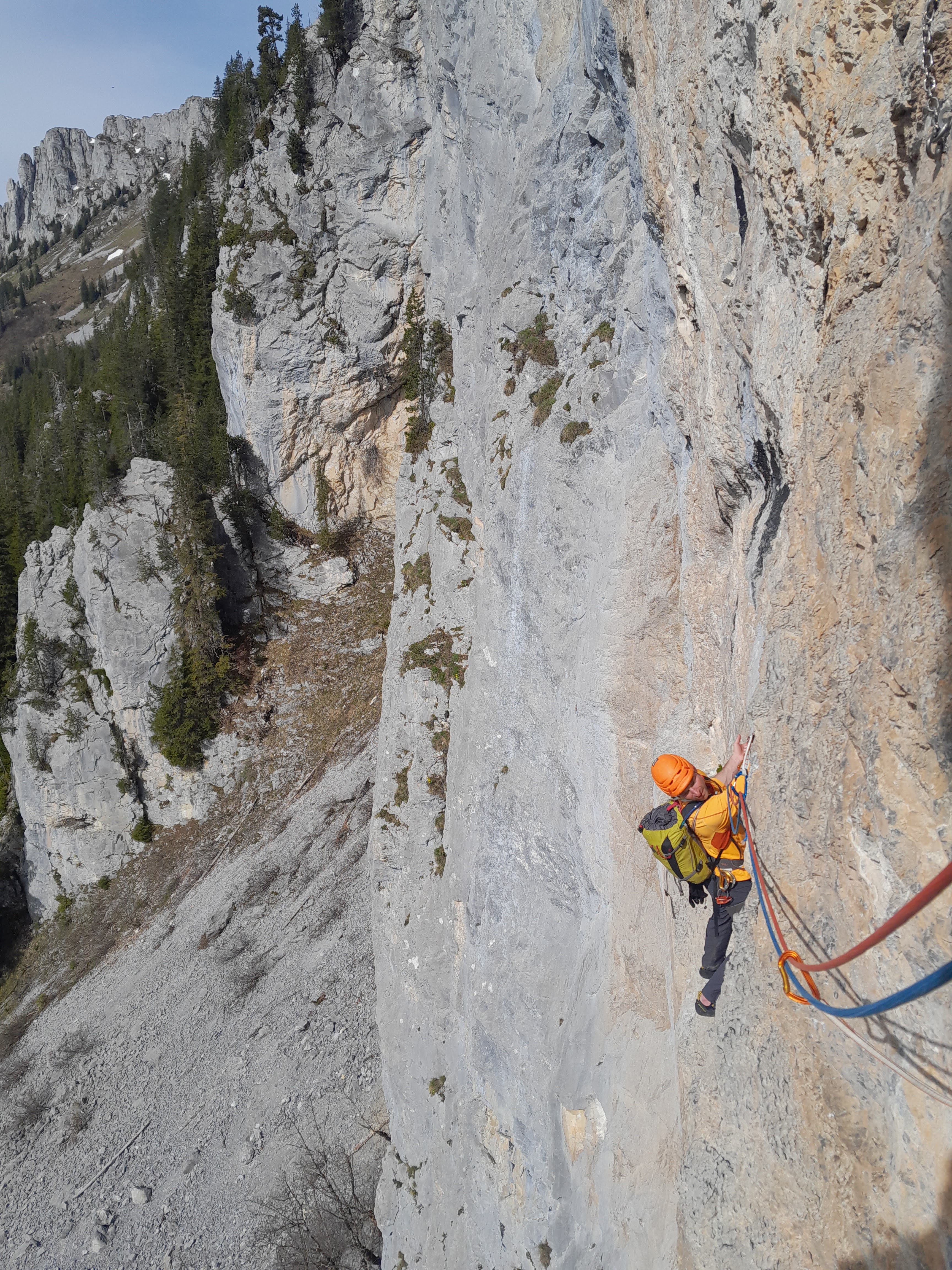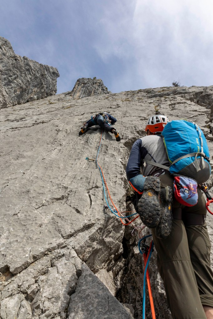 Eens we de wand naderden bekeken we welke delen droog en welke er nat waren en op basis daarvan maakten we al een eerste inschatting van welke routes we overwogen te klimmen. Op basis van de topo hadden we al enkele routes in gedachten, maar dan bleek een groot centraal deel van de wand nat te zijn. Daarom weken sommige cordées uit naar links en andere naar rechts. Vadim ging oorspronkelijk Kasper en Sanne door ‘Hasta la Vista’ (6c) gidsen maar aangezien het daar praktisch aan het regenen was van de smeltende sneeuw hogerop, koos hij voor de iets gemakkelijkere route naar links toe en daar genoot hij met volle teugen van de “supermooie kalksteen met alpien gevoel!” Kobe en Sander gingen de Hintisberg dan weer te lijf in ‘ Sigriff’ (7a). “We waren efficiënt qua touwtechnieken maar we hebben wat betreft het klimmen vaak gesukkeld vanwege de hoge graad.” zegt Sander. “Daardoor moesten we af en toe setje trek doen en Kobe heeft zelfs een lengte helemaal omhoog gejumard.”