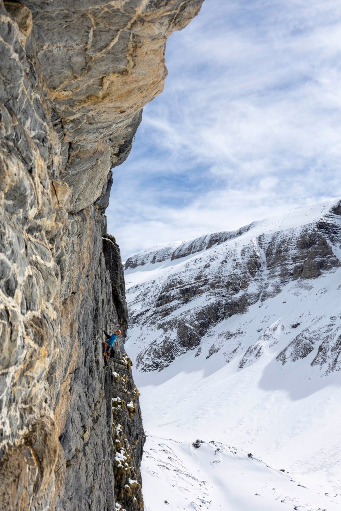 Emma en Emile vertrokken in ‘Todi’ (7a). Emma leidde de eerste lengte (6b) vlot, ondanks dat die nat was. Gelukkig was de tweede cruxy lengte (7a) wel droog en daarna was het heel gemakkelijk. Emile spreekt vol lof over de laatste 7a pitch, dat was “echt een queenline vol met scherpe reglettes waar technisch op geklommen moest worden, het uitzicht was bovendien schitterend, dus af en toe keek ik om en dat maakte mijn ervaring compleet.” Emma nam Emile ook eens te letterlijk. Ze bedacht op de relais dat het potje aan haar gordel enkel gebruikt zou worden om een voorklimmer te zekeren, dus die extra musketon die eraan hing was volgens Emile inderdaad ook niet nodig. Dus die musketon haalde ze eraf, maar ergens in de volgende handelingen heeft ze die per ongeluk laten vallen. Op het einde van de dag vond Kasper die nog bij toeval aan de voet van de wand, maar het was wel de vraag of die musketon nog te gebruiken was vanwege de valimpact, of zou die door de sneeuw zodanig geabsorbeerd zijn dat het nog oke was? Emma besloot er voor de zekerheid toch maar een kapstok of iets dergelijks van te maken.