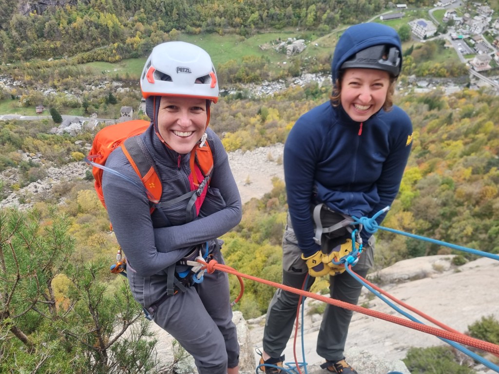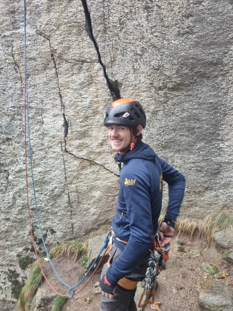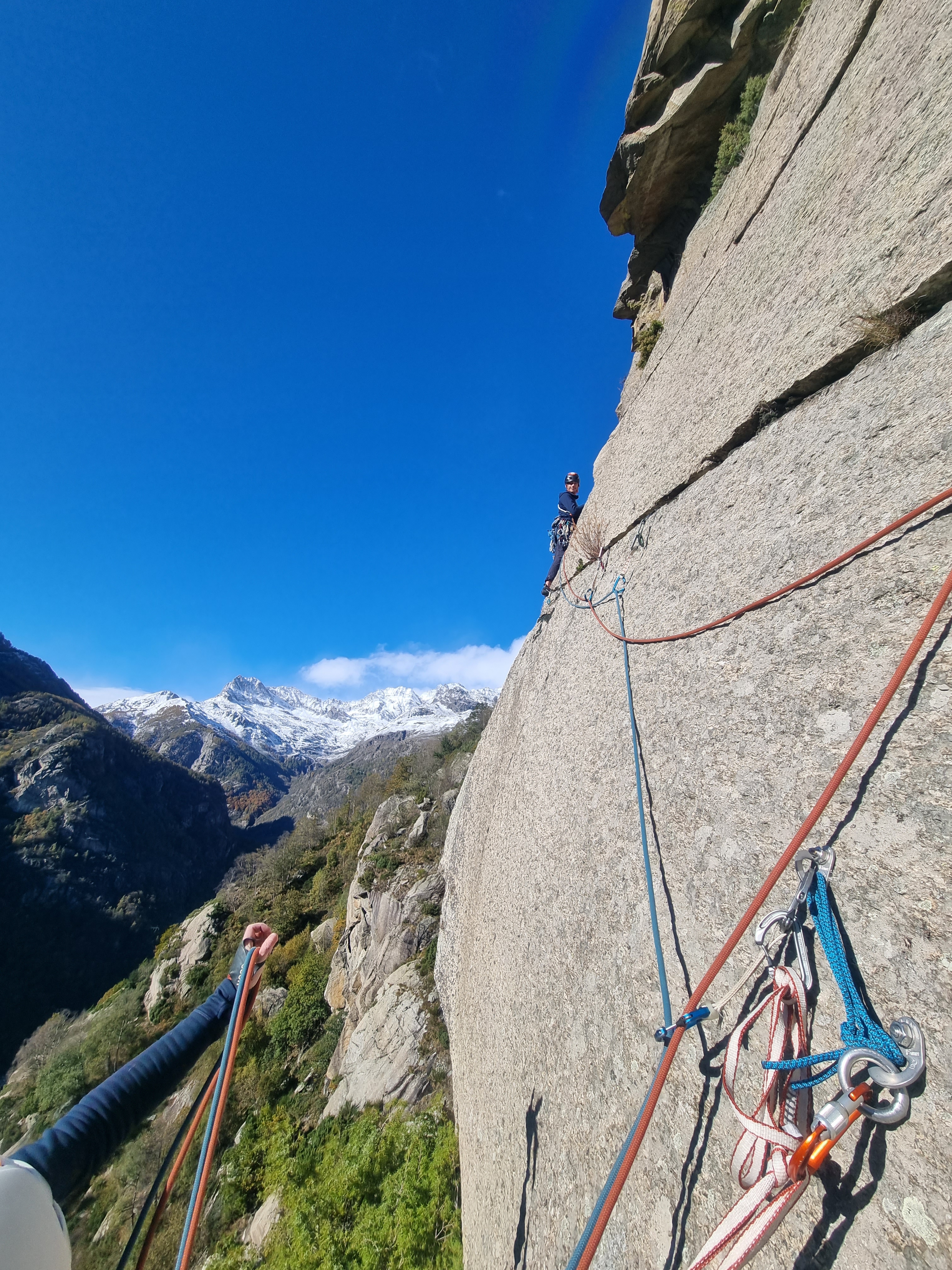 Na het afdalen van de eerste routes bleef nog voldoende tijd voor een tweede. De cordée van Emma, Vadim en An besluit om ook Spigolo te doen, dit keer klimt Emma voor. Emma vond na die overhangde 6a+ cruxpassage een 360°-move in het grotje waar je uit moest klimmen, leuk! Vadim klom dat stuk volledig met underclings (dankzij zijn grootte?) en An deed nog iets helemaal anders, ieder z’n eigen stijl. Misschien komen we deze week nog iets tegen waar klein zijn voordeliger is? Na de eerste paar lengtes had het cordée van Emma zicht op de route van Sander en Emile, samen met begeleider Denis: die zaten in Cani & Porci (6c, 5c oblig) 85m (3p), een imposante off-width, een combinatie van face climbing en jammen, zeker niet de meest evidente lijn om mee te beginnen, maar zeker wel de moeite. Dat was duidelijk te horen door Emiles geroep “oh nee mijn helm zit vast, wat een kutroute! … oké mijn helm is los, deze route is geweldig!”. Voor Emile was dit een reality check waar Orco wel binnenkomt, “een beetje zoals na een paar maanden terug in Freyr komen en zeggen, “juist, dat is Freyr”.”. Kasper en Kobe klimmen nog Via del Diedro (5c) 140m (4p), Emile, Sander en Denis vervolgen hun avontuur in Bagonghi (7a+, 6b oblig.) 95m (3p).