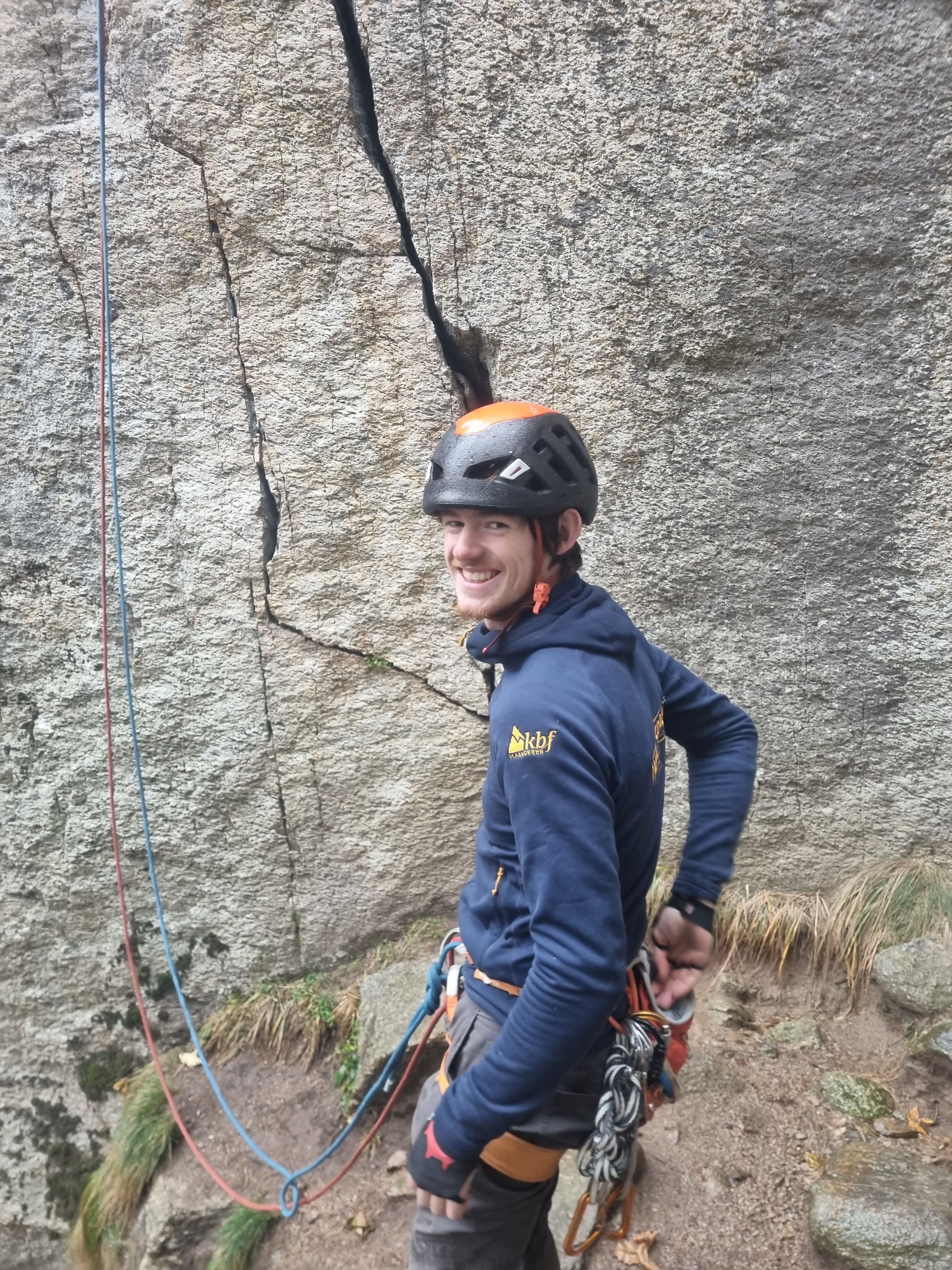 In tegenstelling tot het kiezen voor de klassieke routes, kozen Vadim, Kobe en Denis op dag 4 voor de zelden begane route La via piu bella della valle dell’orco (6a, 5c oblig, R2), 135m (4p), waarbij niet enkel de approach bushwacken was, maar ook de eerste lengte nog wat klimmen door doornstruiken. Volgens Denis “was de weg wel duidelijk!”, ook al waren er van de 40 steenmannen die door hem twee jaar geleden gebouwd werden nog maar twee over. Vadim vertelt: “Pitch 1 zijn we in een dihedral (hoekversnijding) gegaan, daarin was een klein exposé stukje voor 5 meter. Het was voor mij niet echt barstklimmen maar eerder Dulferen om daar omhoog te gaan. De relais waar ik toekwam bestond uit een sling rond een blok. Pitch 2 was ook een dihedral, die was breder en toffer, minder kleine barsten zoals ervoor, wel grotere zodat mijn voeten erin konden. Als je die bovenkwam was het een avontuurlijke relais die bestond uit 1 verroeste piton en een nut die vaststak. Voor de rest moest je aanvullen met je eigen materiaal. Pitch 3 was ook exposé, daar moest je naar rechts maar ik kon niet om de hoek kijken, ik wist niet dat de route zo liep, dus ik volgde eerst twee verticale barsten omhoog, slechts achteraf heb ik in de topo gezien dat dat een andere route was dan bedoeld, waardoor ik met gigantisch veel touwwrijving toekwam bij een boom. Daar heb ik me vastgemaakt. Pitch 4 had geen quotering en daarna zijn we uitgetopt. Het gevoel om boven te komen en “er geraakt te zijn” was echt fijn. Maar met de rappels naar beneden begint eigenlijk pas het echte verhaal. Rappel 1 ging goed, rappel 2 naar de bandsling ging ook goed voor Vadim, voor Denis en voor Kobe, maar met het naar beneden trekken van het touw is 1 touw volledig vast komen te zitten in een off-width, waar het touw gemakkelijk invalt, maar waar het wel kan vastzitten rond stenen die in die off-width steken. Achteraf bekeken was dit wel voorspelbaar, maar als het touw daarin zit kan je er niks meer mee doen.” Hoe zijn ze nog beneden geraakt? “Denis is terug naar boven gekropen en heeft het touw tevergeefs proberen loskrijgen, maar dat zat muurvast. Op dat moment hebben we besloten om het blauwe touw achter te laten en dan zijn we met het rode touw naar beneden gerappeld. Gelukkig was er nog maar 1 rappel tot de grond van 30m dus dat was doenbaar met een enkele streng van 60m. Dan moesten we nog helemaal terug door al die doorns…”