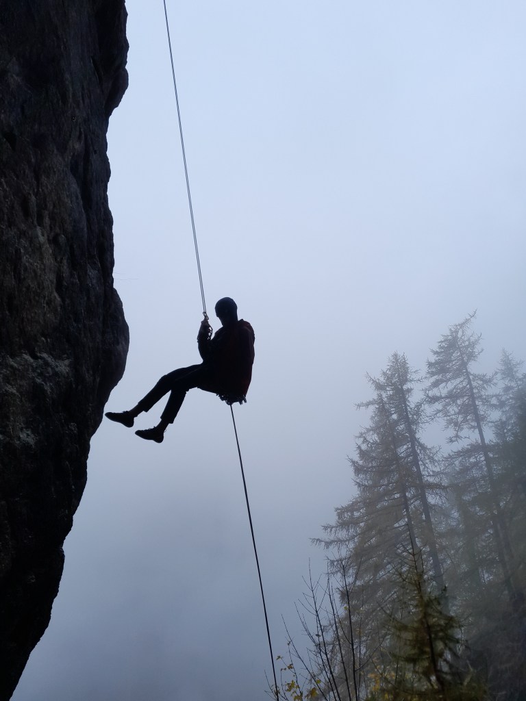 Om er nog alles uit te halen, klimmen we allemaal nog een korte multipitch of ‘een interessante single pitch met een andere pitch als approach’ voordat we rond de middag huiswaarts keren. Het sneeuwt ondertussen, we hebben deze week alleszins van alles gezien van weersomstandigheden: open lucht, bewolkt, wind, geen wind, zon, regen en zelfs een beetje sneeuw. De sneeuw die deze voormiddag naar beneden dwarrelt zal achteraf gezien een voorbode blijken voor het avontuur van die avond, laten we zeggen: Autorit naar huis (sneeuwkettingen oblig.)… Sander en Kasper opteren voor Legoland (7b). Kasper lead de 6b+ tot daar maar moet toch al eens blokken, nuts en friends vertrouwen blijft een mentale uitdaging. Sander waagt de horizontale barst van Legoland als eerste en steekt twee cams, maar vraagt uiteindelijk compleet verzuurd aan Kasper om het eens te proberen. Kasper klimt los van de start waar Sander de beta ontdekte quasi heel de barst à vue – het oefenen op Open Gym loont wederom – en sukkelt met de uitklim, waar het hebben van de juiste beta een groot verschil maakt. Ze vergaten de reverso door te geven bij het wisselen, dus Kasper zekert Sander tot boven, of moeten we zeggen ‘opzij’ met een halve mastworp. Ze geven een high five en een knuffel aan de relais maar het is duidelijk genoeg geweest, tijd om af te dalen en tijd om naar huis te gaan. Moe maar voldaan duurt het niet lang voordat alle passagiers in de auto in slaap vallen.
