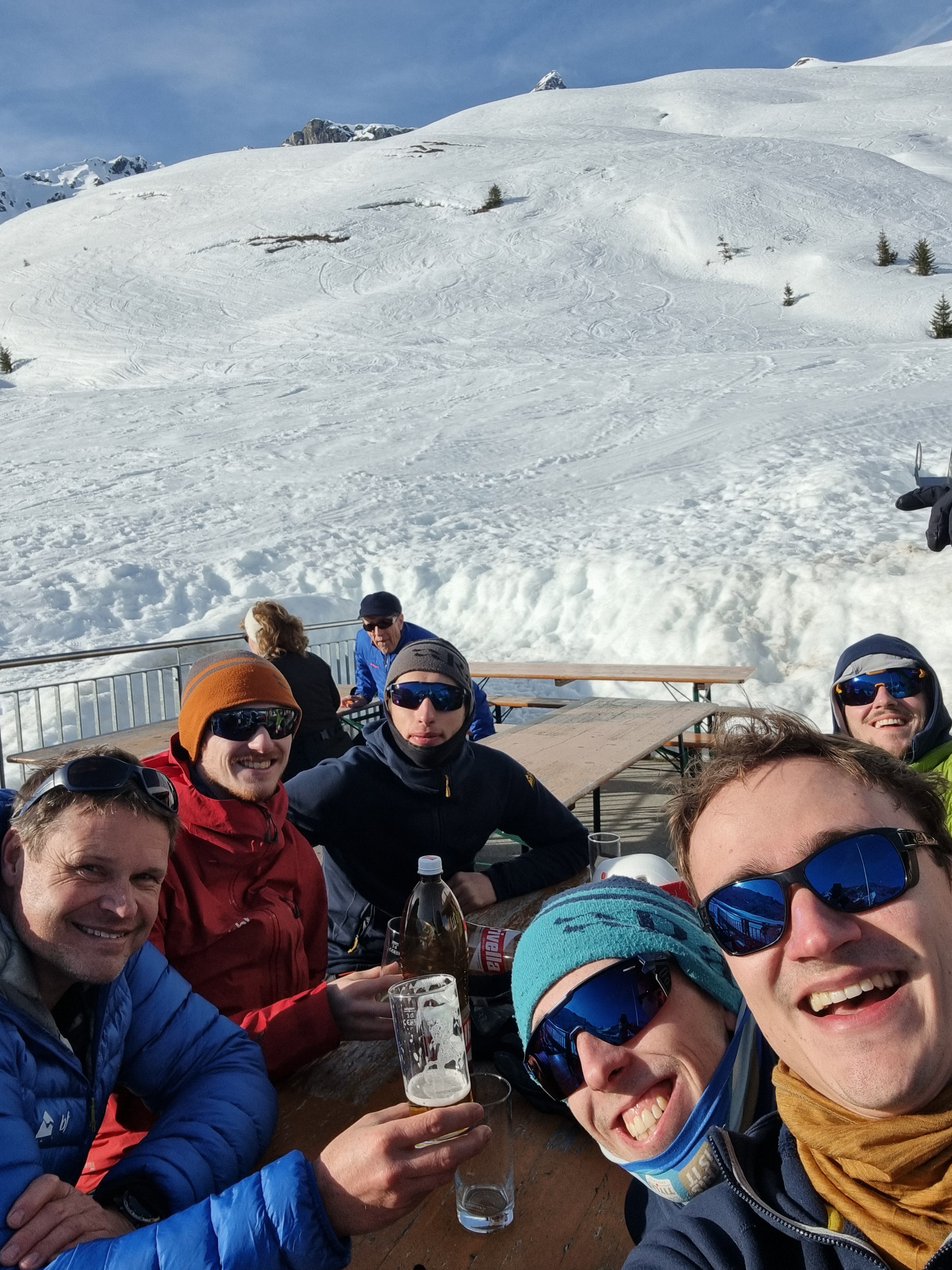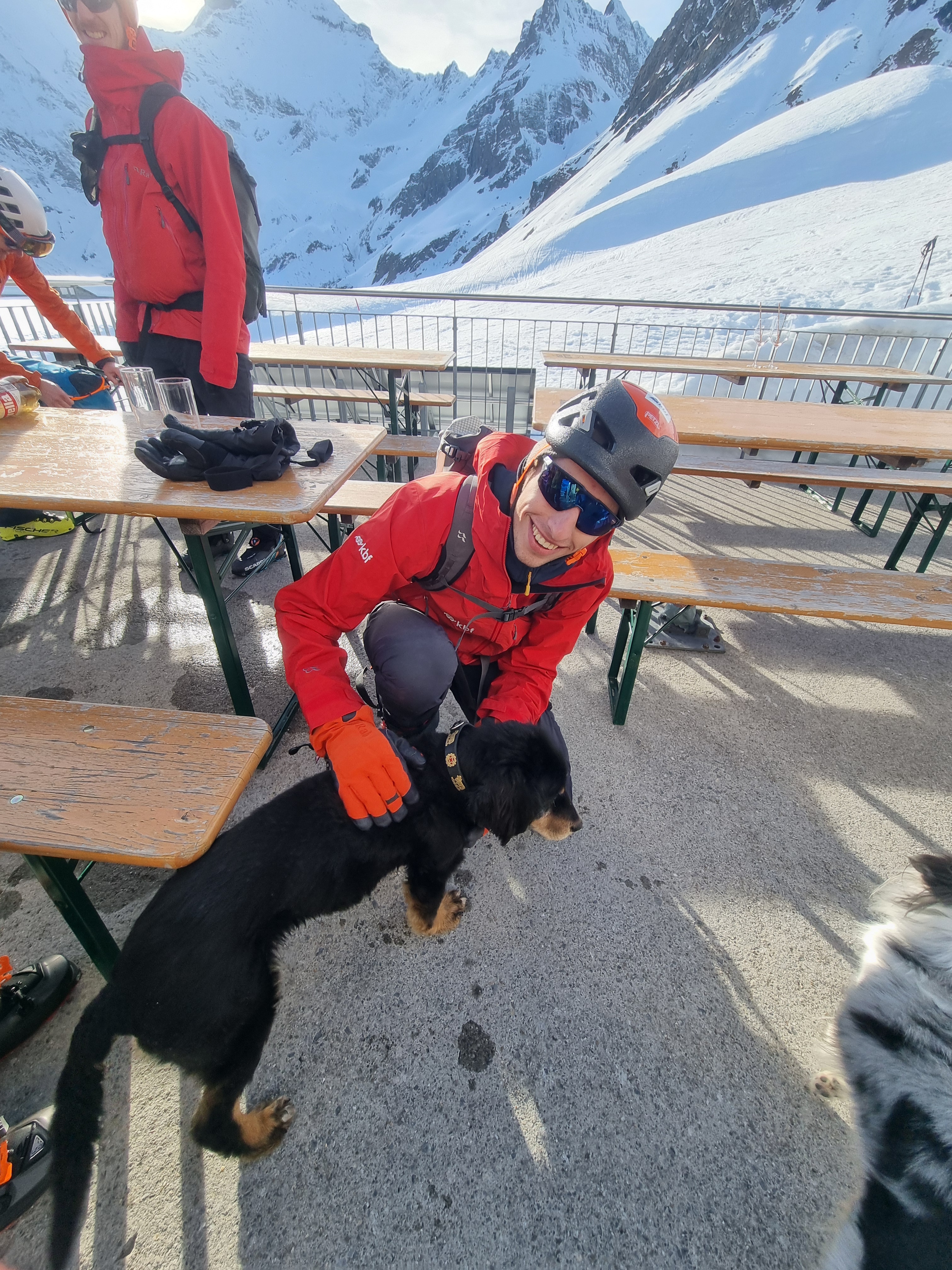Op dag 2 stond de beroemde “Bicep Boom” op de planning – een Mount Coach-traditie waarbij we, tijdens de afdaling, altijd even langs de boom moeten gaan om onze biceps te flexen. We deden een toertocht naar een kleine top, vergezeld door een hond van de hut die we passeerden. De hond besloot ons de hele dag te volgen, en hoewel hij ons de klim met gemak bijhield, werd het wat lastiger bij de afdaling. Af en toe moesten we wachten op de hond, omdat we ons anders schuldig zouden voelen. Uiteindelijk raakten we de hond even kwijt, maar toen we bij de hut aankwamen, stond hij een paar minuten later vrolijk voor de deur. Die dag hadden we al vanaf de parking sneeuw en nadat we de top van de Chli Karpf bereikt hadden, daalden we af op heerlijke zuidhellingen die ondanks het feit dat ze al lang geen nieuwe sneeuw meer ontvangen hadden, toch aangenaam skieden omdat de zon het bovenste laagje sneeuw zachter, maar nog niet gesmolten of nat had gemaakt. Na het harde werk van het stijgen ligt een zee van afdaalopties voor ons, en iedereen kiest een beetje zijn eigen spoor en geniet van speelse bochtjes. In skihutte Obererbs drinken we allen een flink glas Rivella en knuffelt Sander nog wat met Blacky, zo noemden we de hond die ons volgde.