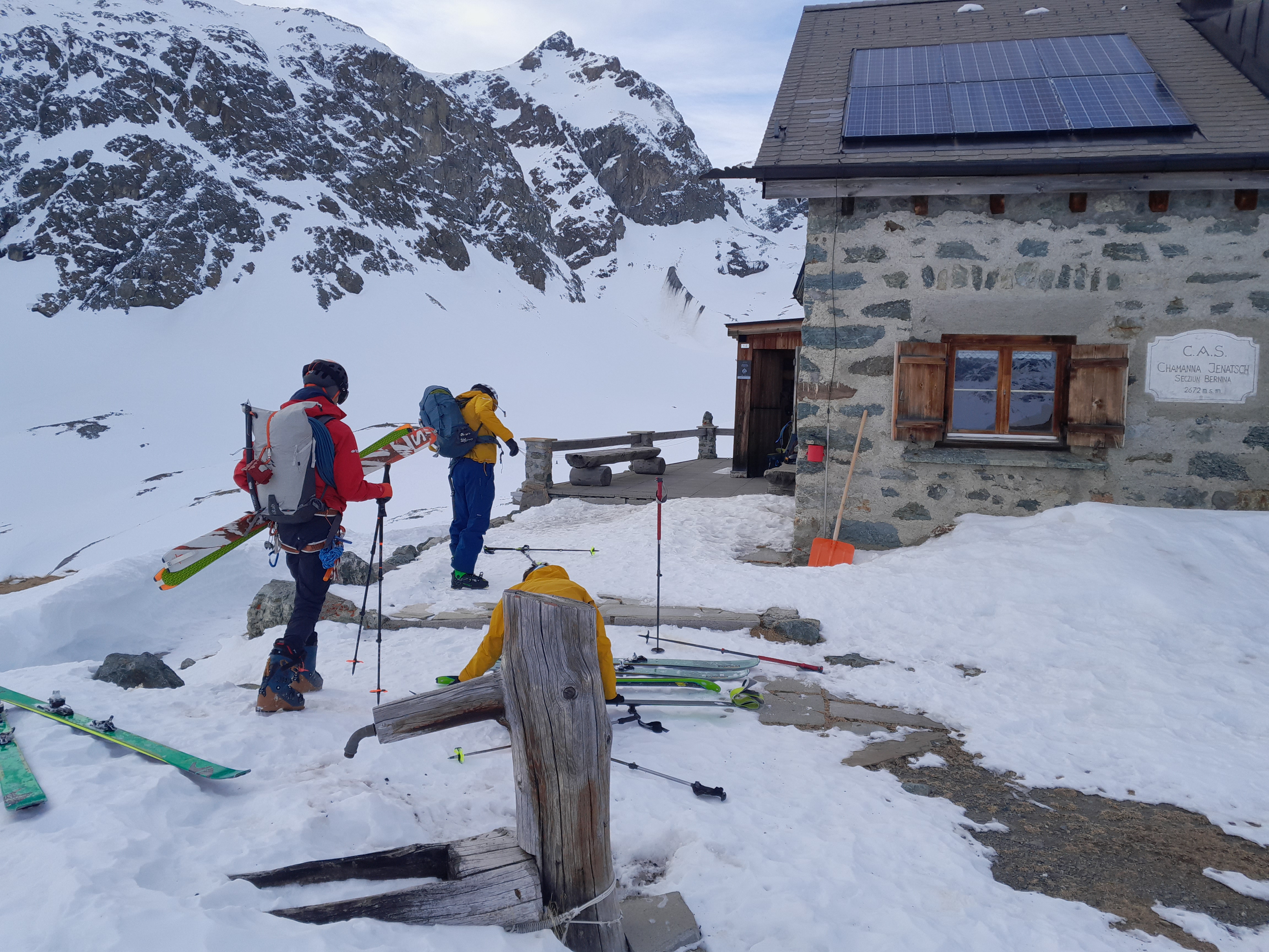 Na de eerste drie dagen werd besloten om naar de Chamanna Jenatsch hut in te stijgen voor 3 dagen, waar we vanuit een zogenaamd Winterraum (een deel van een berghut dat onbemand open wordt gelaten tijdens het ‘off season’, je betaalde vroeger ter plaatse een financiële bijdrage in een daarvoor bestemd bakje, tegenwoordig kan dat ook online; het systeem stoelt op vertrouwen) enkele tochten zouden maken. Het motto “light is right” was deze keer niet van toepassing aangezien we eten moesten meenemen voor enkele dagen in de hut, waarvan 1 avond kaasfondue. De instijg hakt er bij iedereen in, Kobe in het bijzonder voelt zich niet zo lekker en wordt de dag erop echt ziek wakker en geeft dan forfait voor die tocht. Emile had echter precies energie genoeg want hij bedacht om 3 liter wijn mee te sleuren voor de kaasfondue, en als dat nog niet genoeg was, haalde hij in de hut ook een minihangbord tevoorschijn uit zijn rugzak – want “vingerkracht onderhouden is belangrijk voor in Freyr!” De afdaling richting de hut, nadat we over de Fuorcla d’Angel passeerden, blijkt bijzonder uitdagend doordat we niet omheen sastrugi’s kunnen die soms groter zijn dan de lengte van onze ski’s, daardoor wordt er hier en daar wat gesprongen om vooruitgang te maken… Sanne, Ann en Kasper vliegen over de sastrugi’s, maar de rest blijft hier en daar al eens haken met een valletje tot gevolg, gelukkig in ongevaarlijk terrein.