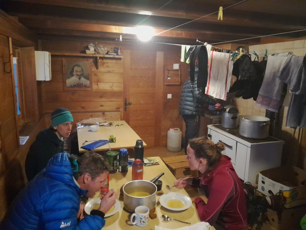 Eens aangekomen in de hut besloten we om de oude houtkachel-kookplaat-combinatie aan te steken om onze kleren te drogen en sneeuw te smelten, dat bleek een uitdaging maar gelukkig vonden Sanne en Kasper ergens een restje benzine uit een generator in de hut waardoor we de kachel makkelijker aan kregen. Het was erg gezellig in het Winterraum, want An had ons voor deze (geplande) 4-daagse uitstap vervoegd en nu waren we met zeven.
