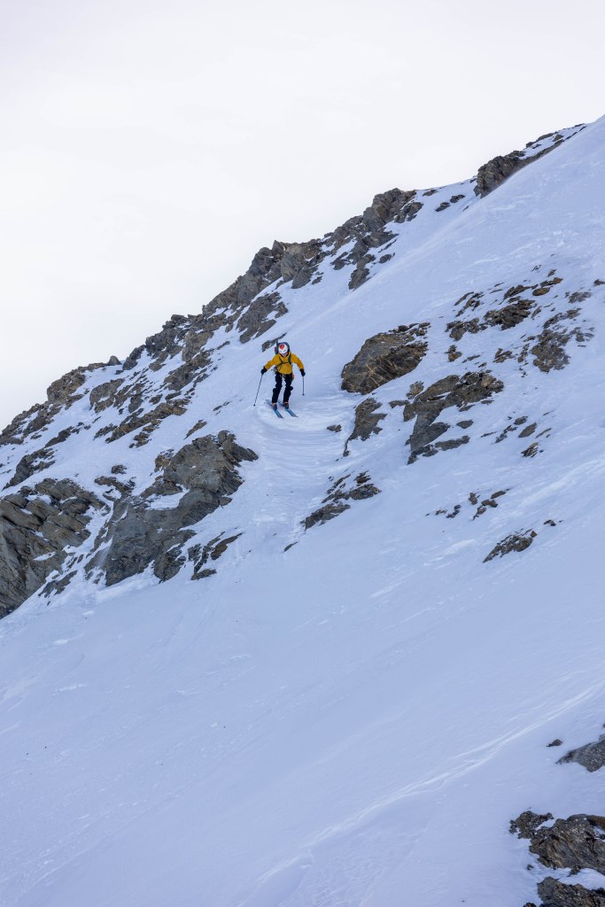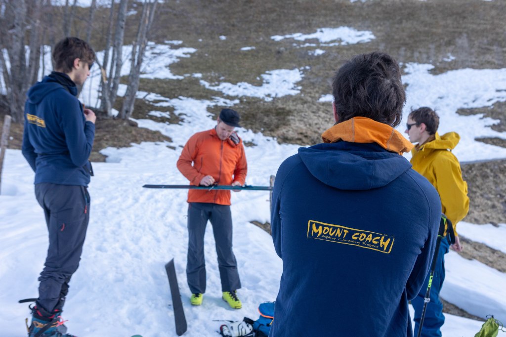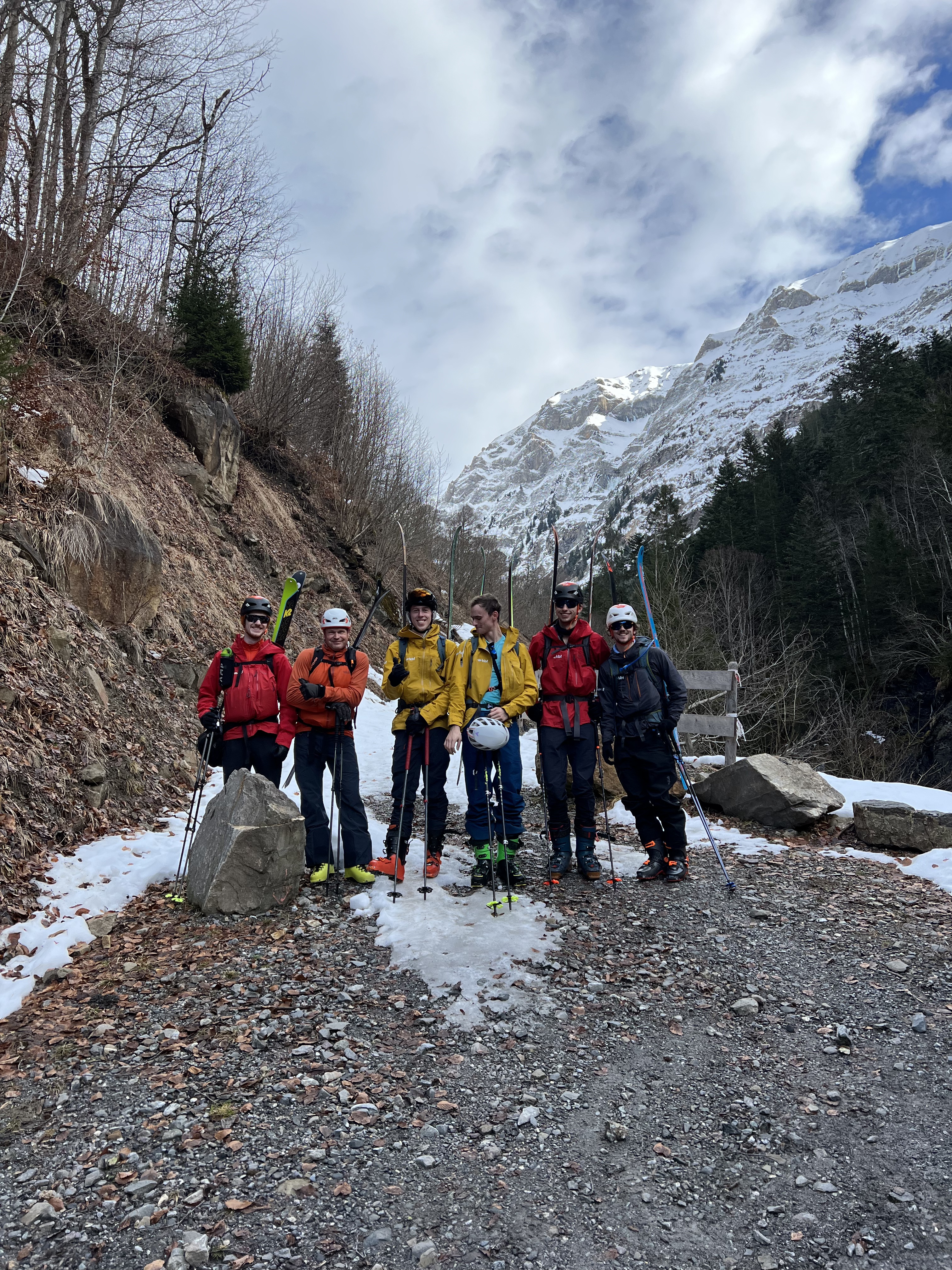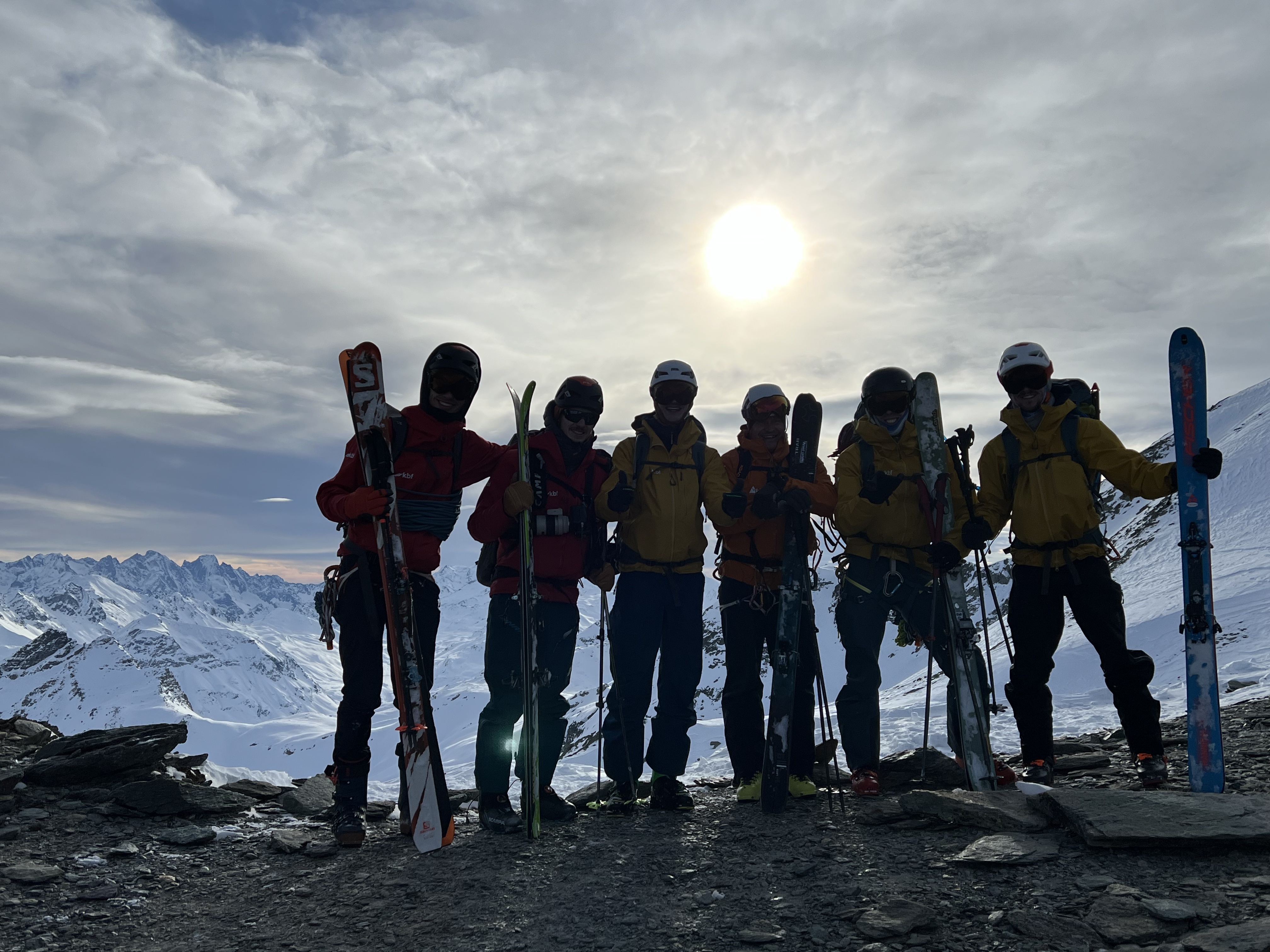 Sander vertelt: “Tijdens de Mount Coach stages wordt het concept van de “gids van de dag” toegepast, waarbij één persoon de leiding neemt over de tocht. Tijdens de toerskitocht naar de top van de Gemsfairenstock en daarna over de Tuefelsjoch-graat kreeg ik de kans om die beklimming te leiden. We parkeerden de auto’s in Urnerboden, een dorpje met prachtige uitzichten, en namen de luftseilbahn naar de Fisetenpass. Dan toerden we in een relatief rechte lijn naar het zuidwesten naar de top van de Gemsfairenstock, er zat een klein stukje in waarin we de ski’s uitdeden en met de crampons gingen scrambelen, en dan moesten we nog een stuk over meer ijzige sneeuw afwerken tot de top. Daarna maakten we een afdaling naar de zuidwestelijk nabijgelegen gletsjer. Hier brachten we onze vellen opnieuw aan om het volgende uitdagende stuk aan te pakken: een gletsjeroversteek en een korte klim over de Tufelsjoch-graat. We beklommen de graat via een via ferrata, met ski’s op onze rug, volgens Vadim voelde dit als “bijna 20kg”. Eens op de graat aangekomen volgde nog enkele rappels, alhoewel dit moeilijker bleek dan verwacht omdat de rappelstanden besneeuwd en dus praktisch onvindbaar waren. Gelukkig waren de ankerpunten verbonden met een ketting, die we wel vonden. We rappelden tot op de noordwestelijk georienteerde flank en leefden ons daarna uit in een – na een relatief lange klimdag – welverdiende, toffe ski-afdaling.