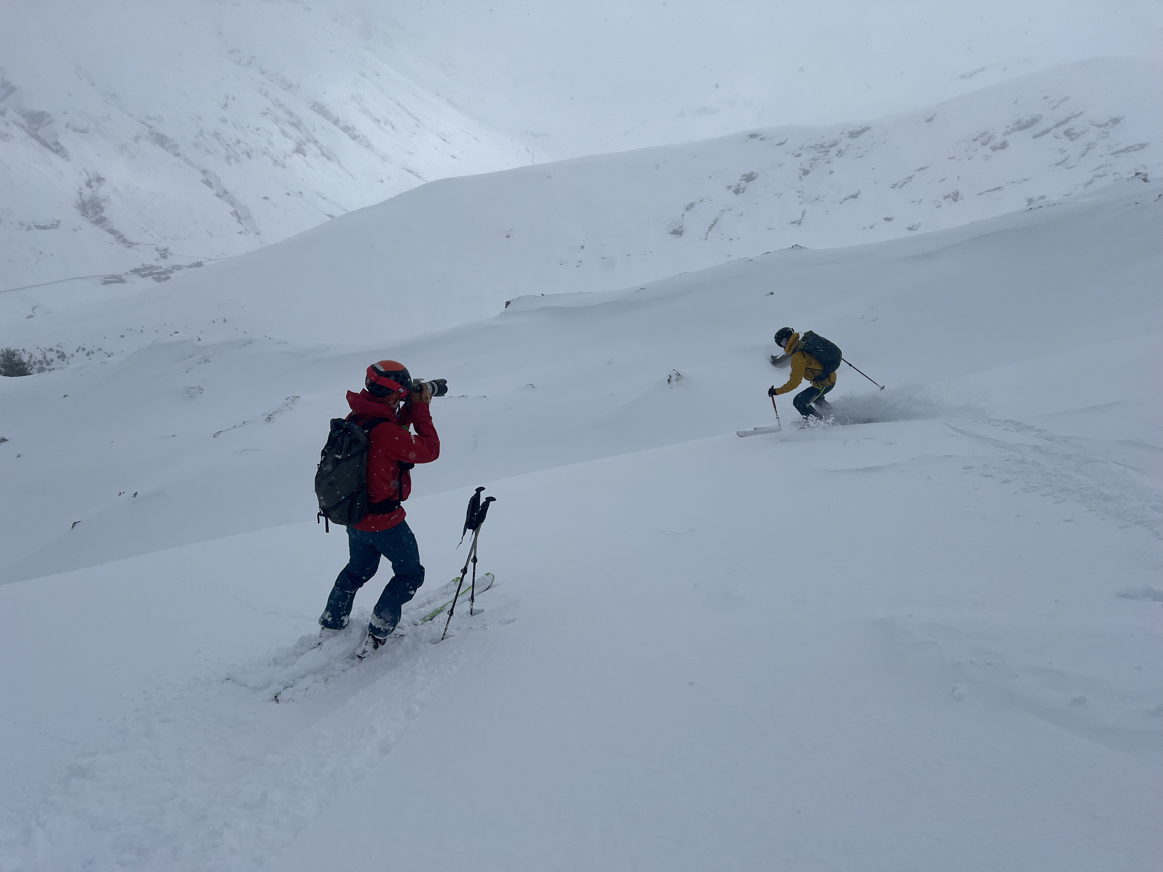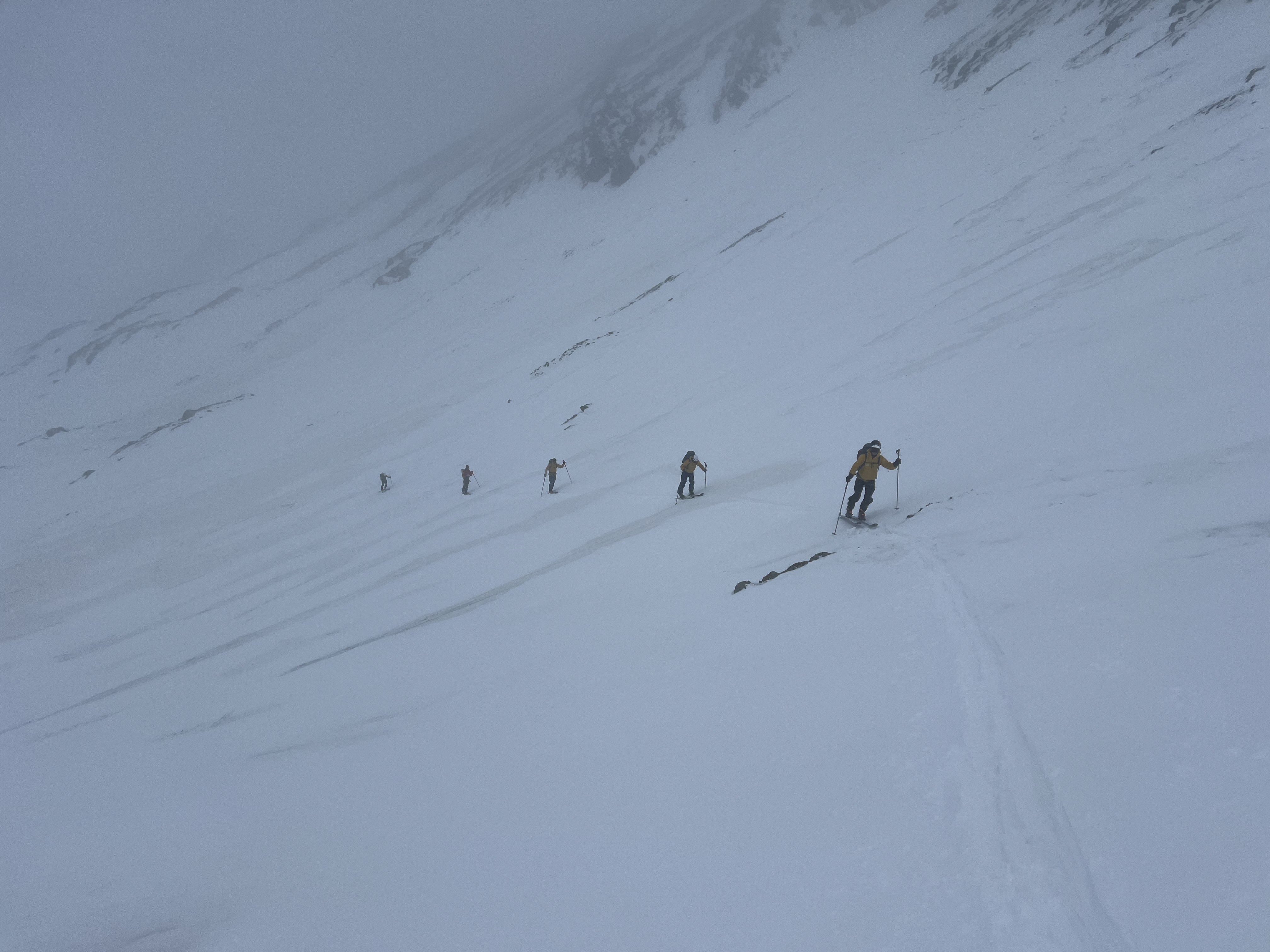 De daaropvolgende dag werd ingezet met een gezellige ochtend aan de ontbijttafel. Tijdens het ontbijten zagen we dat de voorspelde meteo – die we op de top van de Tschima da Flix gedownload hadden, want in de hut is geen bereik – stelselmatig tot stand kwam en zo veranderde de situatie van het lawinegevaar wel, er viel veel nieuwe sneeuw en dit zou enkel blijven opbouwen tot meer dan 20 cm, er werd een toenemende wind verwacht en het waaide al hard, dus het gevaar voor windplaten zou drastisch gaan stijgen. Zoals Sanne altijd zegt: “Wind is de bouwmeester van lawines.” De Chamanna Jenatsch hut bevindt zich qua reliëf in een kom die omgeven is door prachtige bergen en skimogelijkheden, maar om dat paradijs te verlaten moesten we door wanden van meer dan 30 graden stijgen en dalen, namelijk nabij de Fuorcla d’Angel, en met het aankomende lawinegevaar van niveau 4 was dit een no go om dit lang te laten wachten. Er zat dus niet veel anders op, met die tikkende klok besloten we samen om al het materiaal in te pakken en die dag het gezellige Raum te verlaten, terug naar het dal. Eens over de col van de Fuorcla d’Angel gingen we een mooie afdaling tegemoet, die Kobe voortreffelijk leidde. Ondanks de hevige wind, vooral op de col, hielden onze nieuwe Rab hardshells ons lekker warm – waarvoor dank aan KBF en Rab. De hevige wind en sneeuwval leerden ons ook waarom efficiënte transities, iets waar vanuit de begeleiding altijd op gehamerd wordt, belangrijk zijn. Het is leuk, maar we zitten niet in een speeltuin en er zijn reële gevaren!