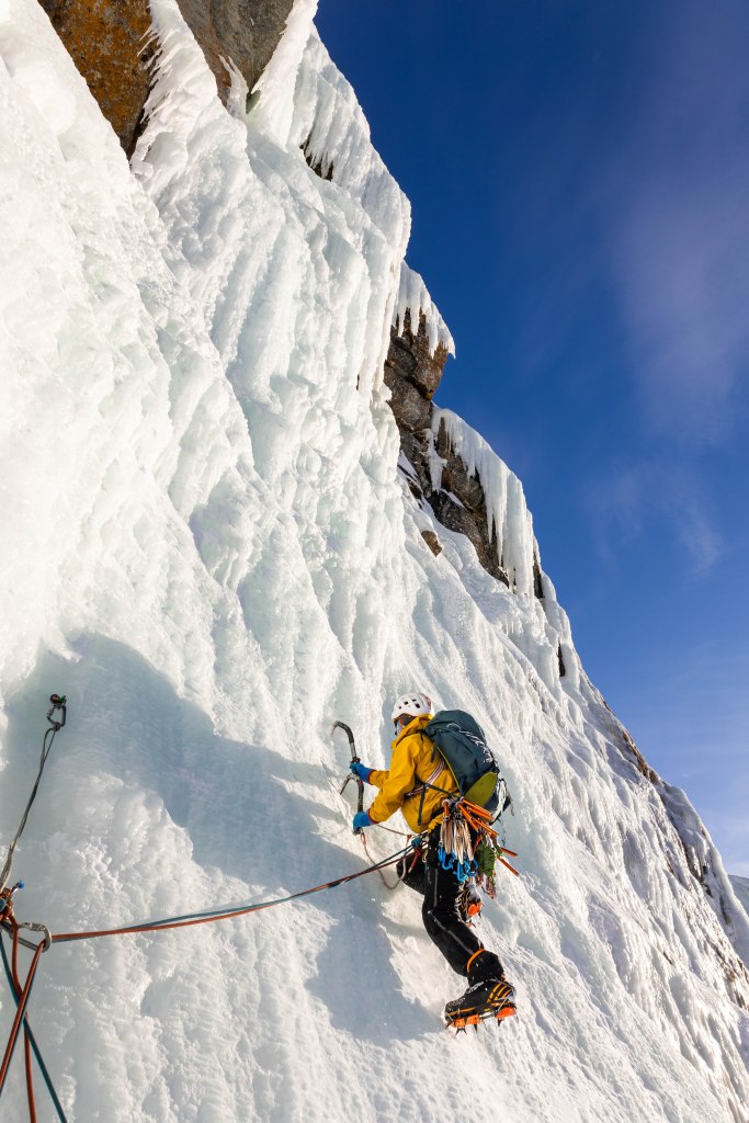 Het klimmen was een uitdaging op zich, met een mix van uitpitchen en simultaan klimmen in het eerste deel. Halverwege begon de echte route: honderden meters WI3 en WI4-ijs.