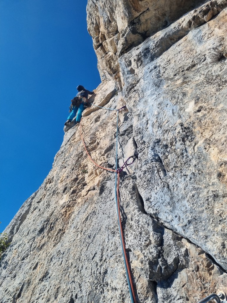 We herverdeelden de cordées. Sander en Emma kozen een route met twee bommetjes, dus extra avontuur. De route bevatte veel 6b’s waarbij regelmatig relais gebouwd moesten worden. Halverwege werd Sander bijzonder creatief: zes punten verspreid over een heel plateau. We waren het er unaniem over eens dat we die beter niet te zwaar konden belasten.