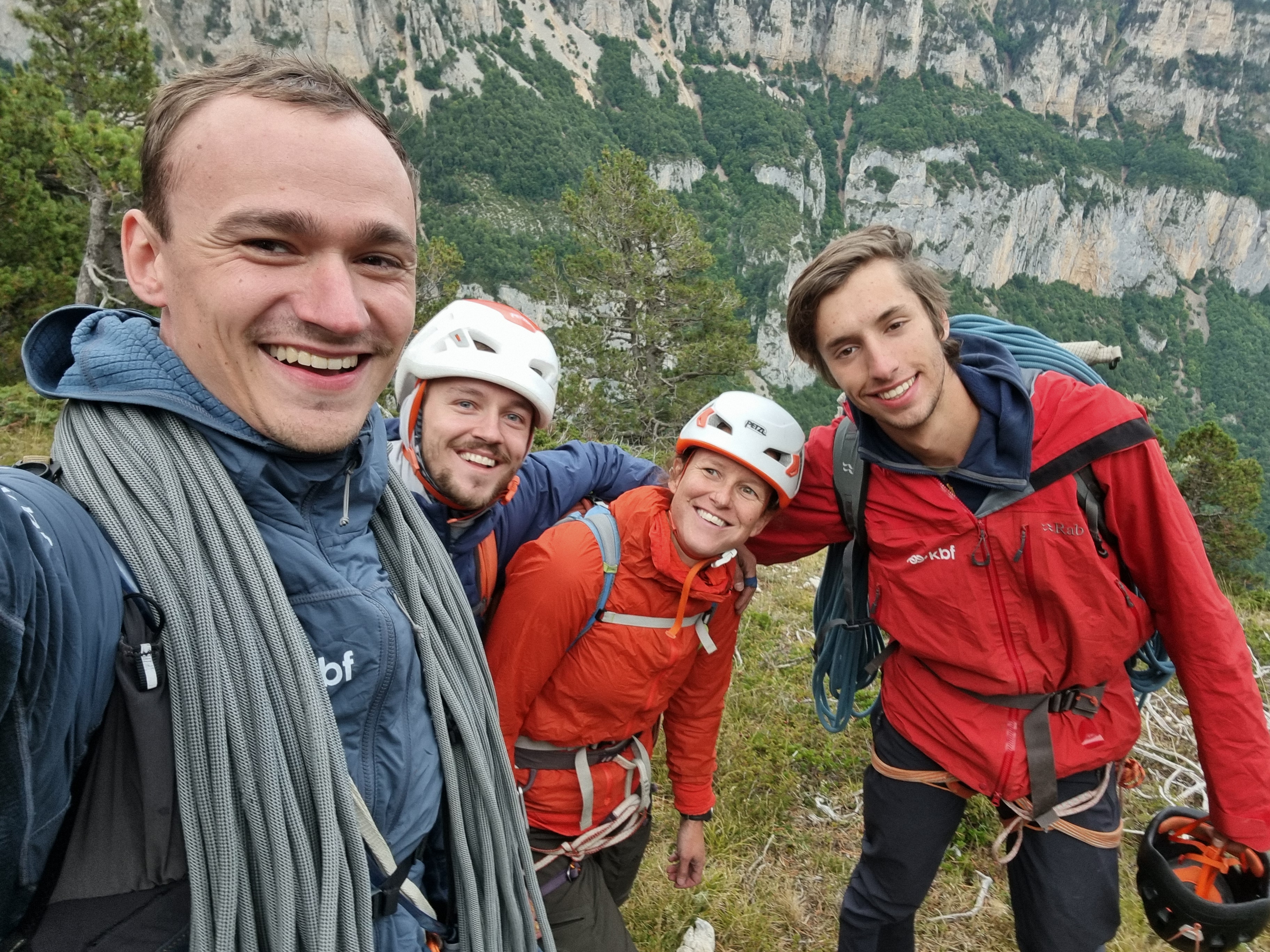 Iedereen sprong met hun cordée in de auto richting de rotsen. Sander en Denis, zoals gewoonlijk als eersten klaar, hadden een lijn gekozen die volledig behaakt bleek te zijn: een sportklim dus. Wat Sander niet vermeldde, was dat het om een 300 meter lange 7a “opwarming” ging. Kasper en Emile waren de volgende cordée. Zoals bekend zijn zij samen geen navigatie-experts. Een uur nadat iedereen al met zijn route was begonnen, kregen we een sms: “We vonden de rappel naar de voet van de route niet, nu pas onderweg.” Emma, An en ik konden alleen maar lachen; dit hadden we kunnen voorspellen.