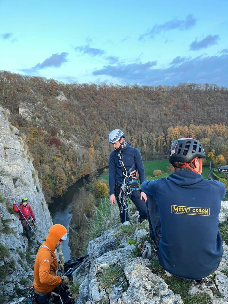 De eerste dag werd doorgebracht in Pont-a-Lesse, waar we ’s ochtends een intro aid klimmen kregen van Filip en Sebastiaan waarna er werd geoefend op een kleine overhang geëquipeerd met haken en kleine gaatjes voor skyhooks te plaatsen. In de namiddag lag de focus op het haulen en jumaren. Enkele dikke takken kwamen goed van pas om onze haulbag mee te vullen, om het gewicht van een echte haulbag te simuleren. We oefenden ook op jumaren en lower outs, wat inhoudt dat je tijdens het jumaren een traverse tegenkomt en je jezelf schuin moet laten zakken.