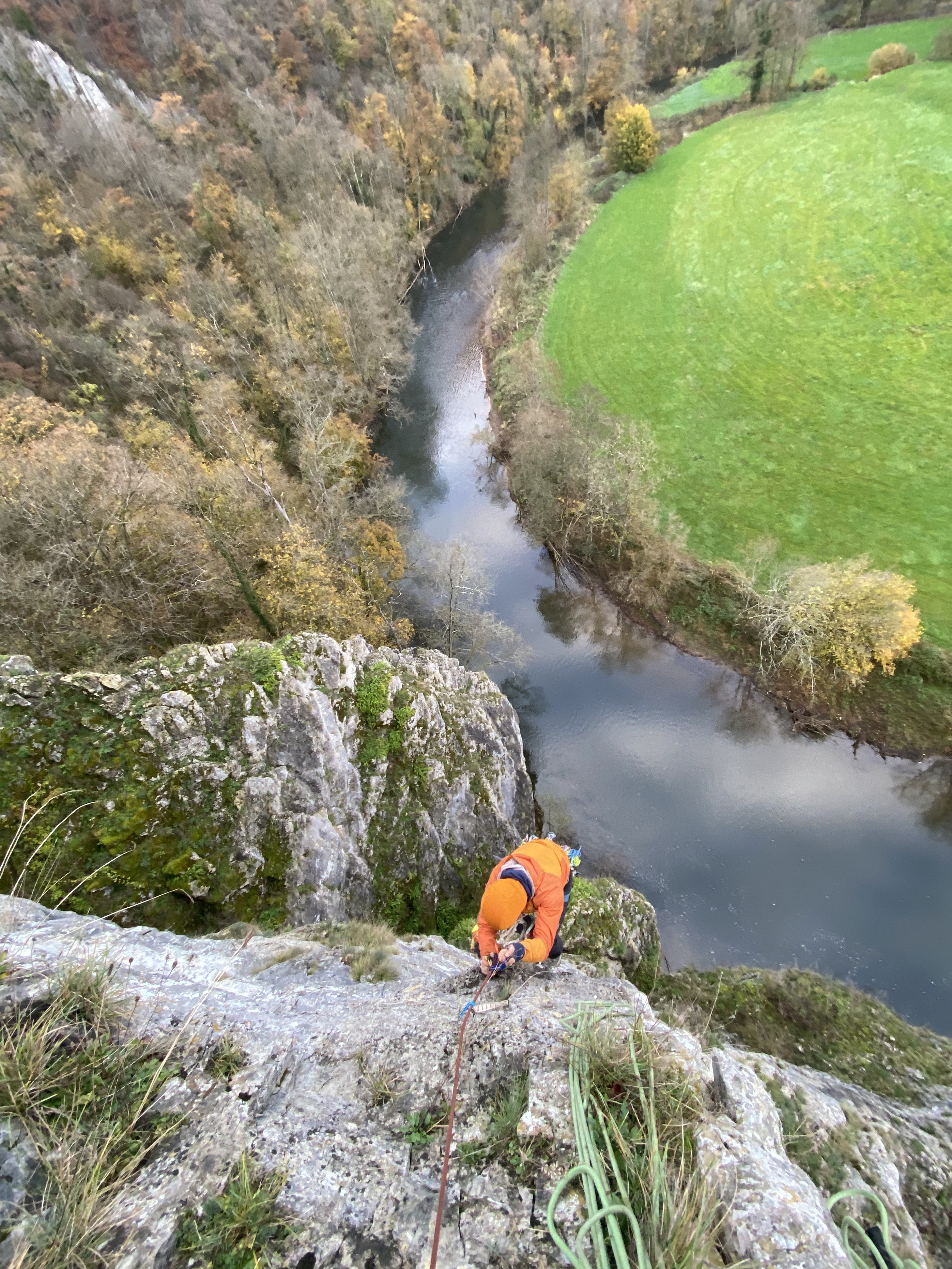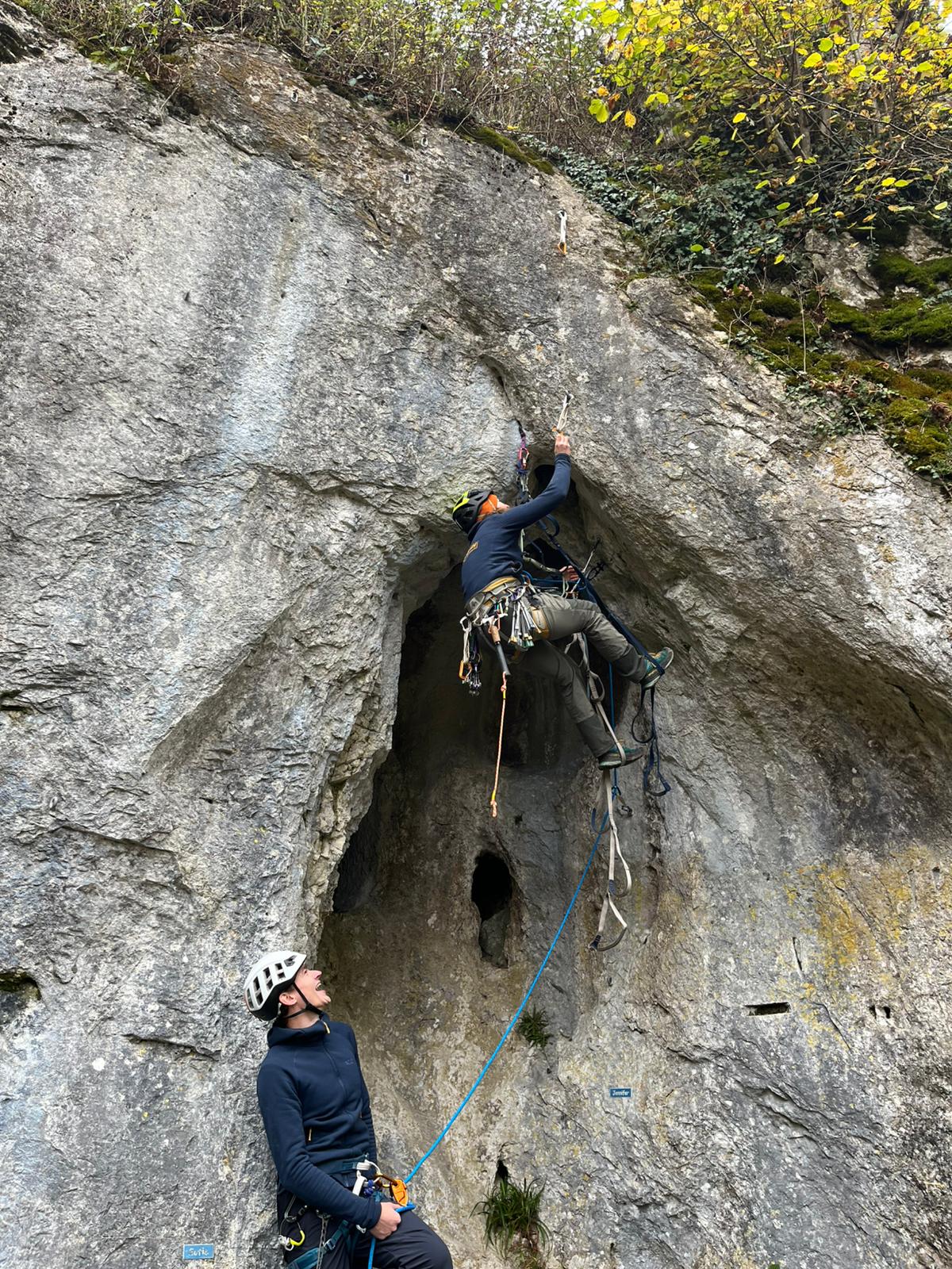 De eerste dag werd doorgebracht in Pont-a-Lesse, waar we ’s ochtends een intro aid klimmen kregen van Filip en Sebastiaan waarna er werd geoefend op een kleine overhang geëquipeerd met haken en kleine gaatjes voor skyhooks te plaatsen. In de namiddag lag de focus op het haulen en jumaren. Enkele dikke takken kwamen goed van pas om onze haulbag mee te vullen, om het gewicht van een echte haulbag te simuleren. We oefenden ook op jumaren en lower outs, wat inhoudt dat je tijdens het jumaren een traverse tegenkomt en je jezelf schuin moet laten zakken.