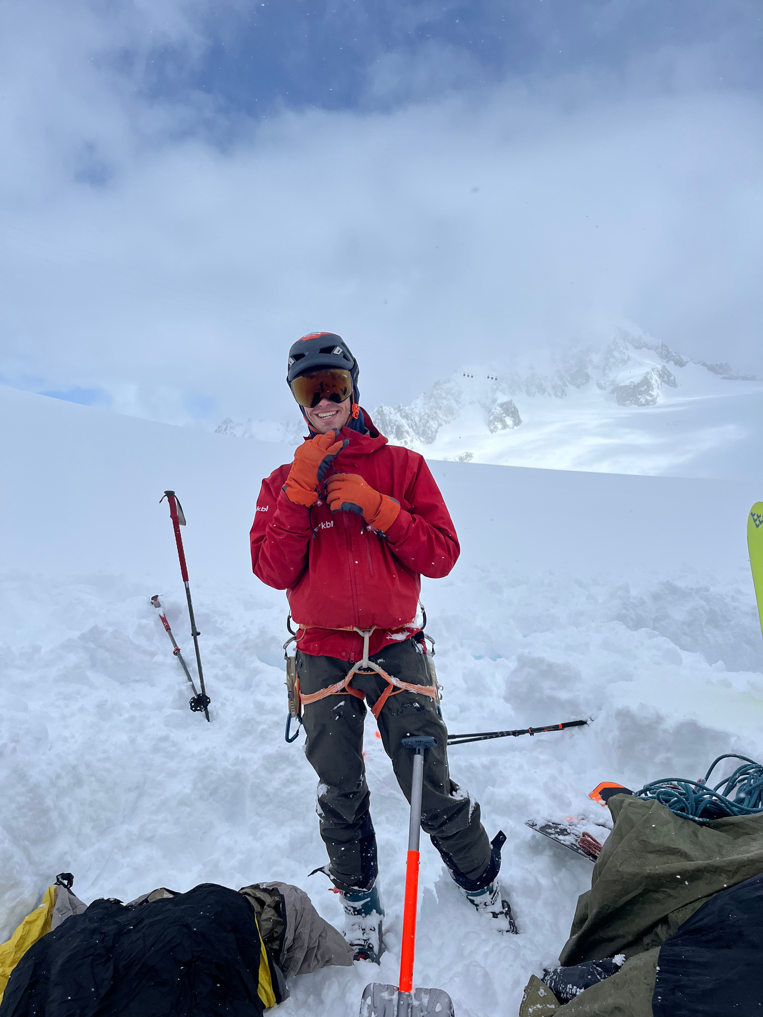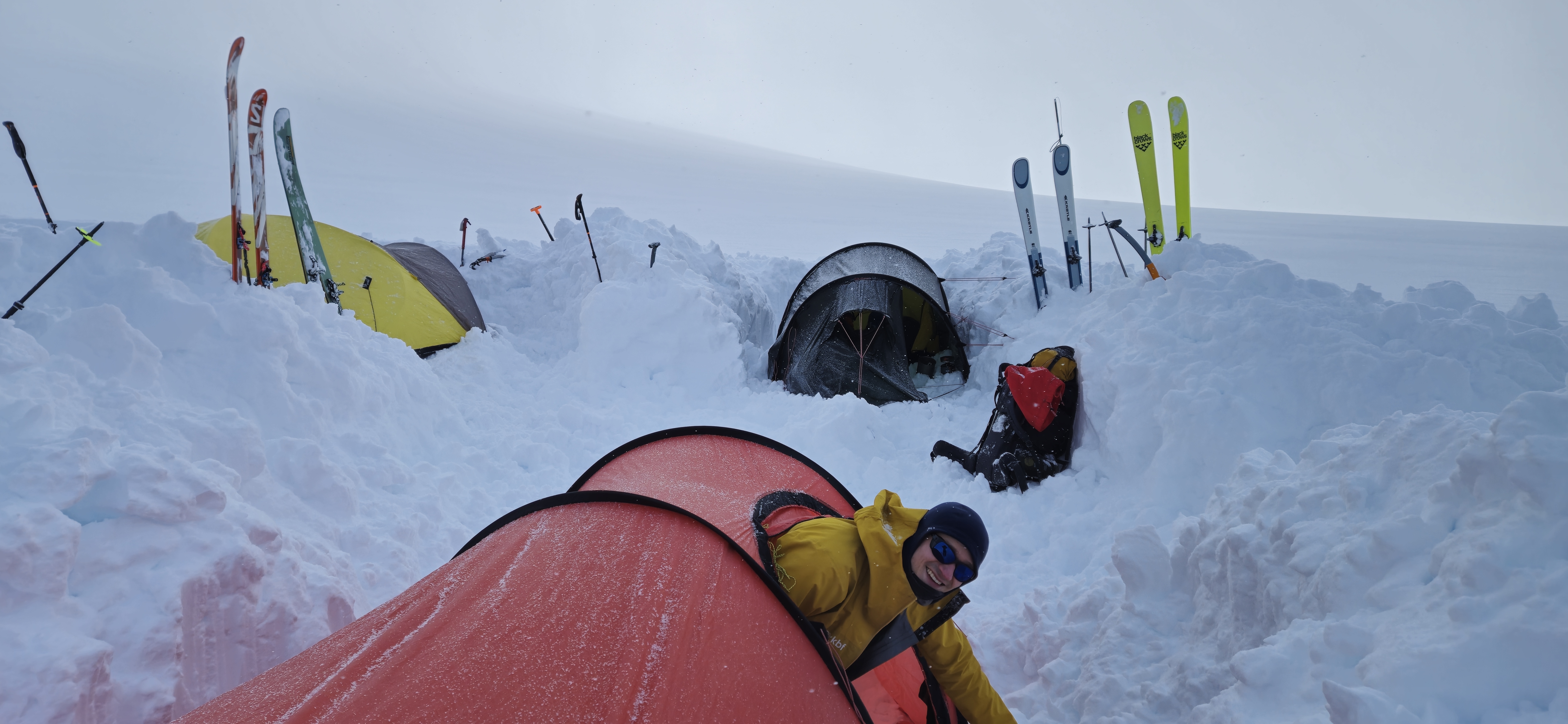 Na een korte, pittige afdaling naar onze basecamp-plek werden de tenten Rab opgezet en konden we rustig genieten van de stilte, enkel onderbroken door het constante geluid van de gasbrander die sneeuw smolt voor water.