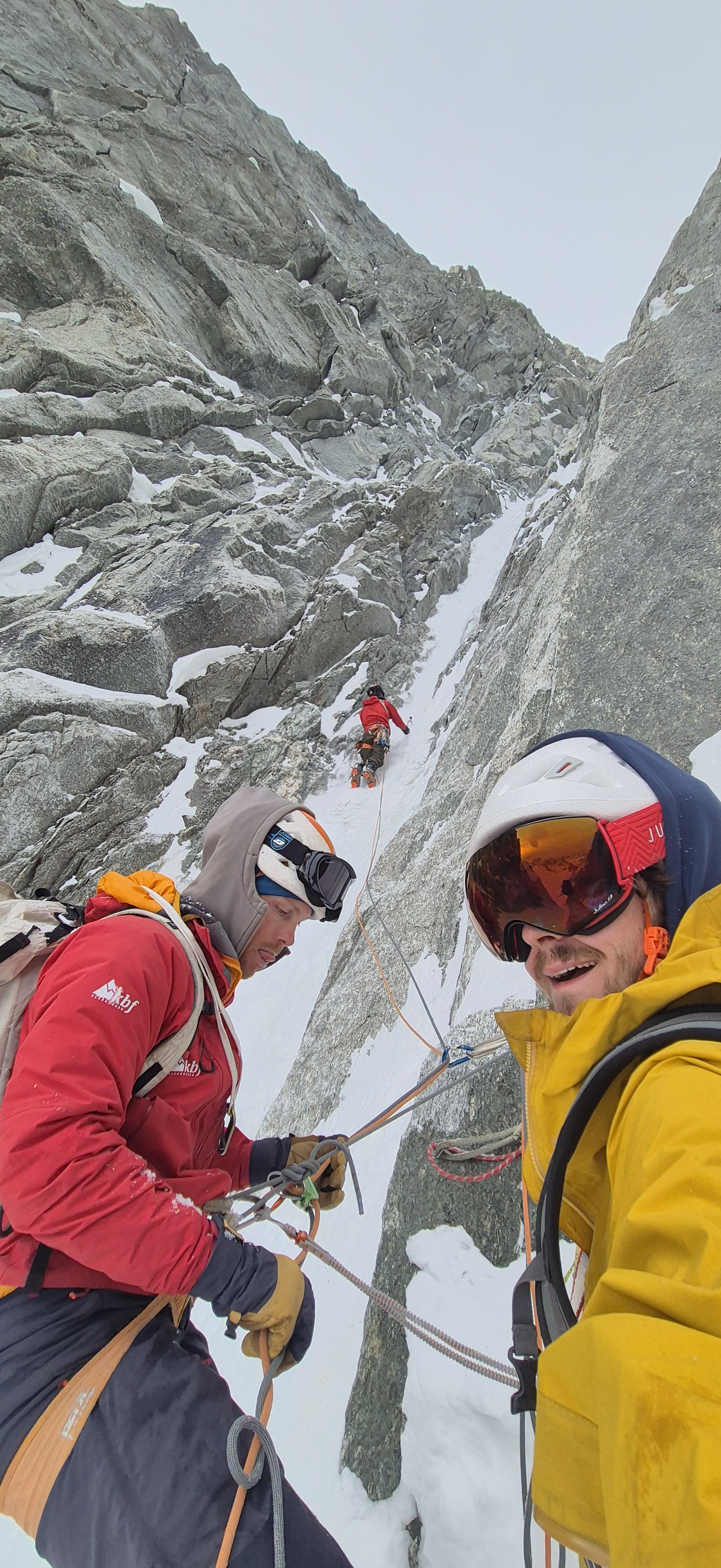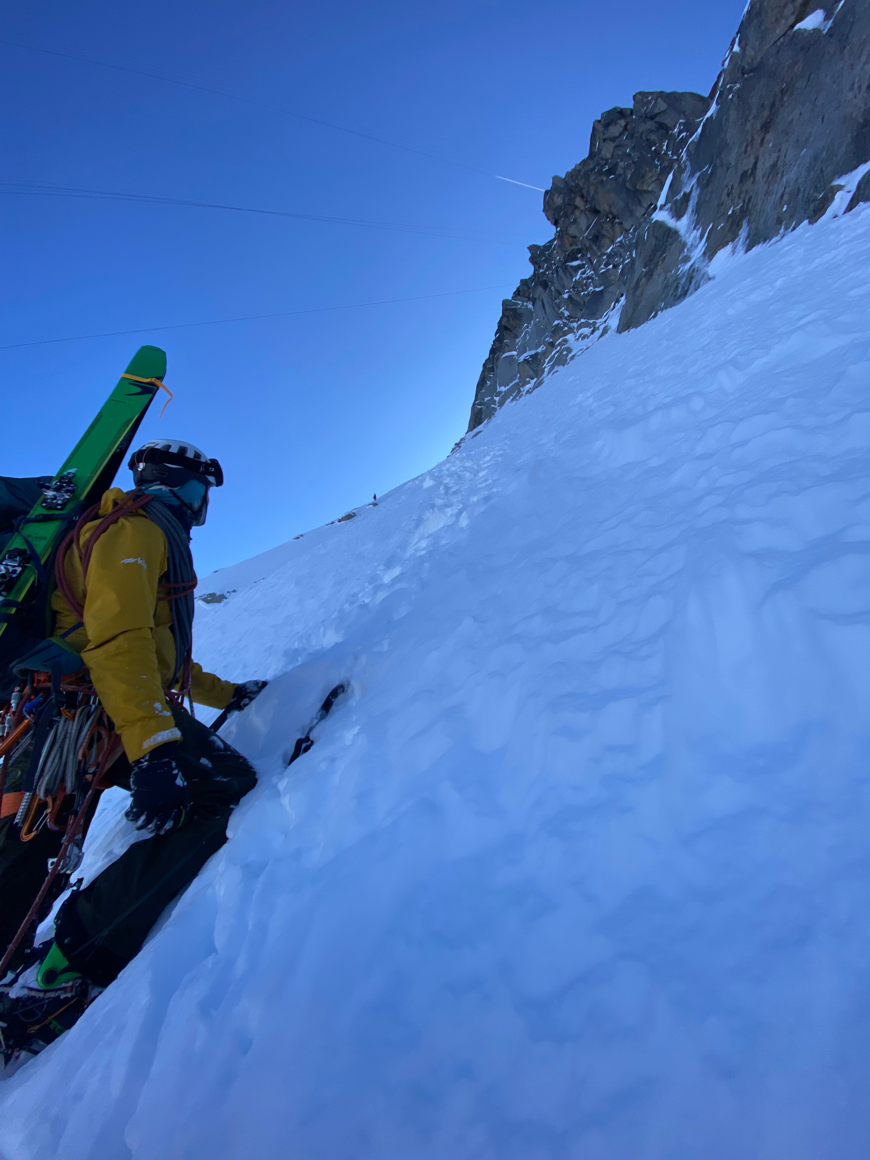 De route begon met een lange sneeuw couloir. Gelukkig nam Denis de kop en maakte hij het spoor, gevolgd door enkele spannende passages met mixed klimmen. Eenmaal boven kwamen Sander en Vadim uit onder het platform van de Aiguille du Midi, waar ze werden begroet met een applausje van enkele toeristen — een tikkeltje ongemakkelijk. Terwijl Kasper mij de laatste 200m aan het aanmoedigen was, omdat het voor mij mentaal en ook fysiek een zeer zware route was. Kwamen ook wij aan onder het platform.