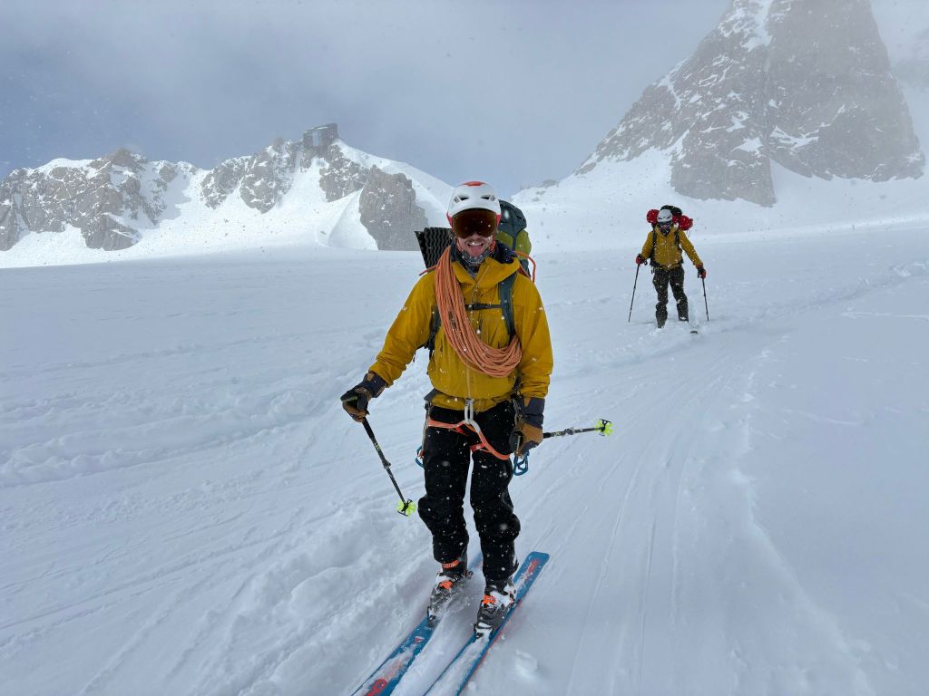 Op dag drie werden de routes omgewisseld, maar de cordées bleven hetzelfde. Met de juiste techniek (“eerst knie, dan pas voet”) ging het sporen een pak beter. Sander deed de eerste 100 meter sneeuw in amper 30 minuten — waar Kasper de dag ervoor drie uur over had gedaan. En waar Kasper nog recht over de rimaye kroop, vond Sander een sneeuw bruggetje en klauterde er elegant overheen.