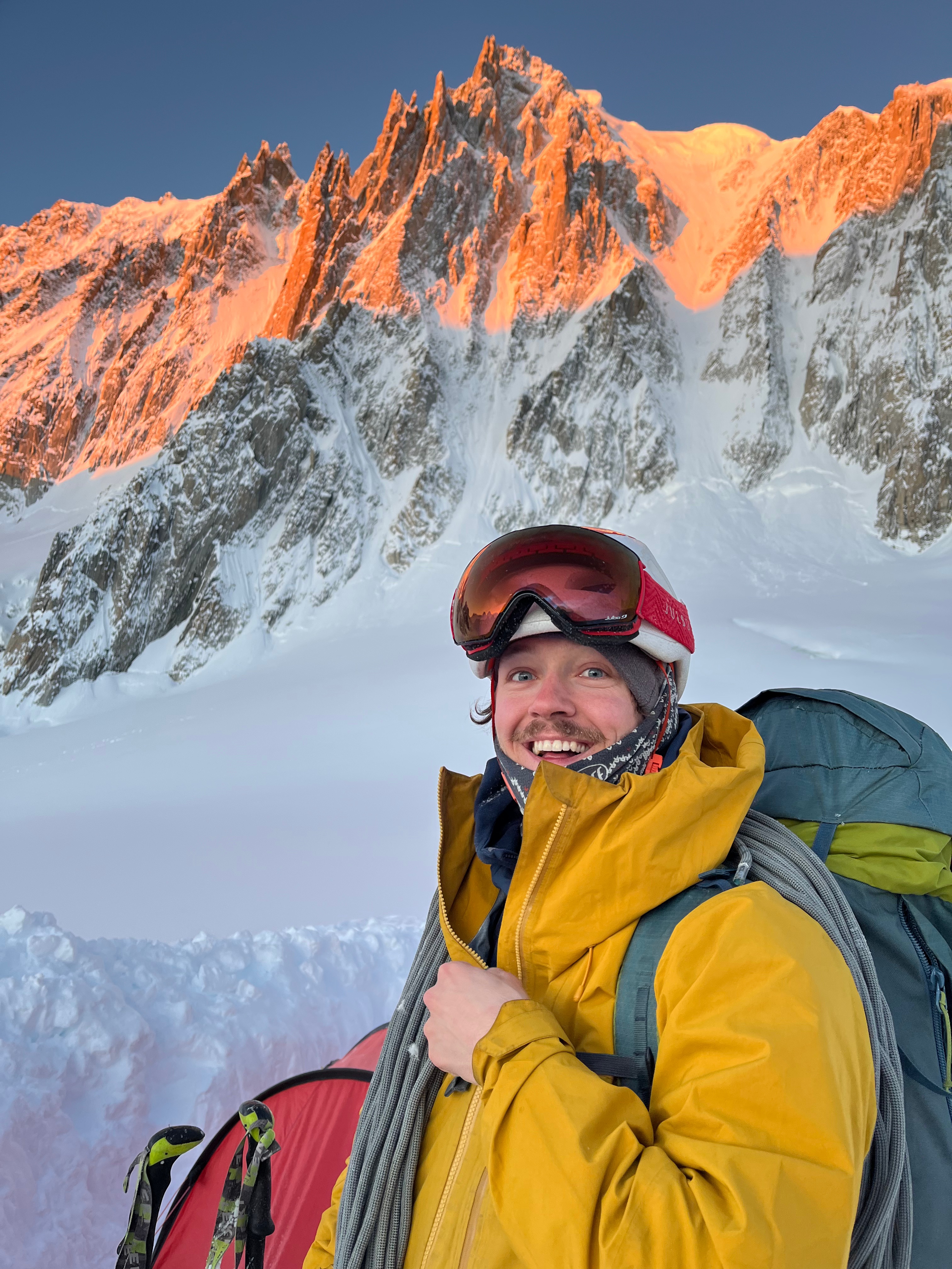 De zon kwam op boven de omringende toppen, en we zagen in de verte team Vadim, Sander en Sam hun eigen lijn trekken richting de route Pellissier in een ongespoorde Vallée Blanche. Toen besefte ik hoe hard ik de bergen heb gemist. Kasper dook als eerste 100 meter diep de sneeuwflank in — letterlijk zwemmend in de sneeuw van 45°. Na drie uur ploeteren, een crawl over een rimaye in plaats van errond heen, en een mentale uitputtingsslag, bereikte hij de relais aan het begin van de route.