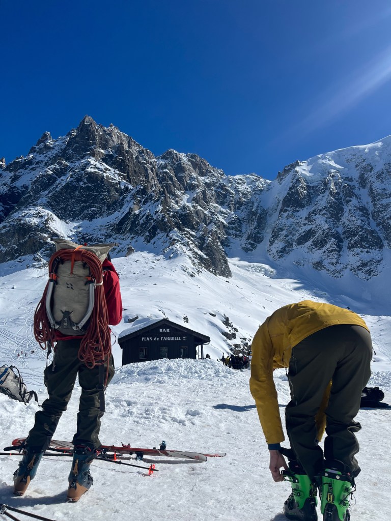 Na een welverdiende nacht in de Gîte de la Montagne namen we woensdagmiddag het liftje naar de Plan de l’Aiguille. Na een korte afdaling in verse poeder bereikten we de hut, waar we nog even konden genieten van de zon. De rest van de namiddag gebruikten we om ons voor te bereiden op de route van de volgende dag: de Mallory-Porter op de noordwand van de Aiguille du Midi.