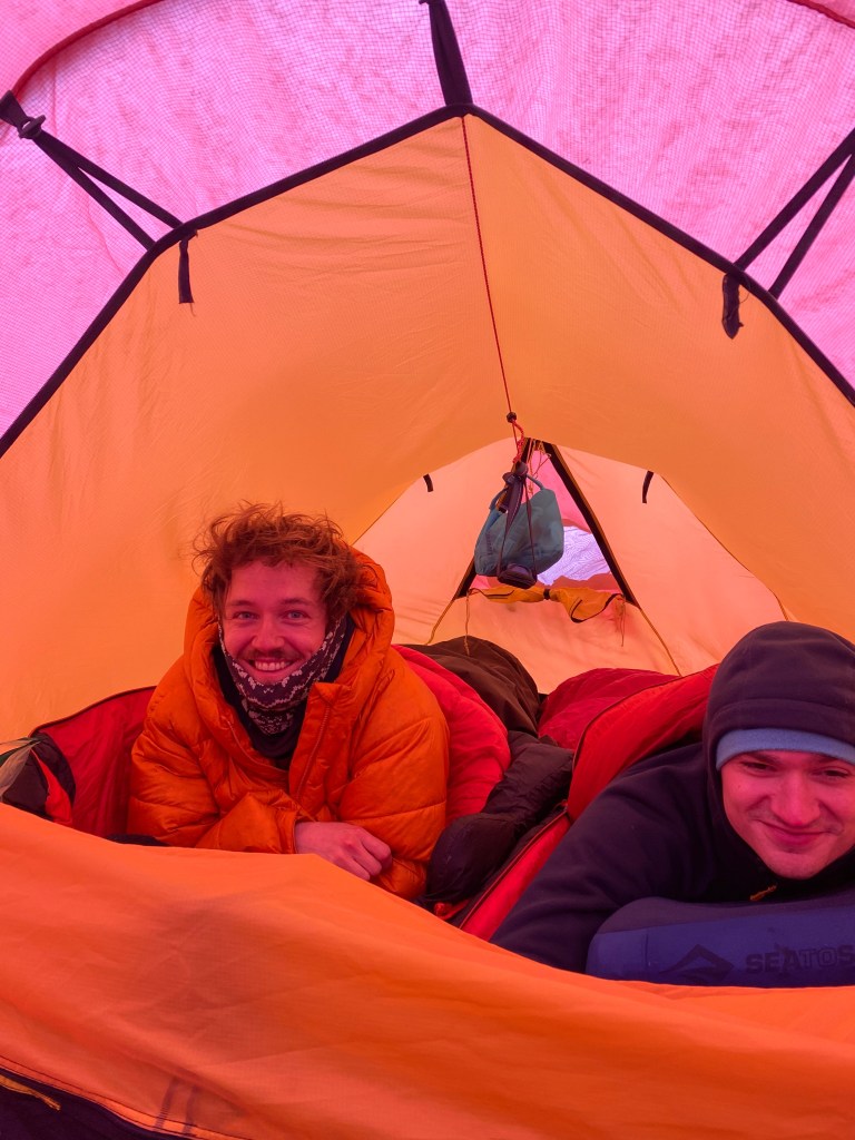 De volgende ochtend beseften we dat het -20°C was, In het licht van de hoofdlamp zagen we dat alles onder een laagje ijs zat. Het water dat we de avond ervoor zorgvuldig hadden gesmolten, was ondertussen alweer bevroren.