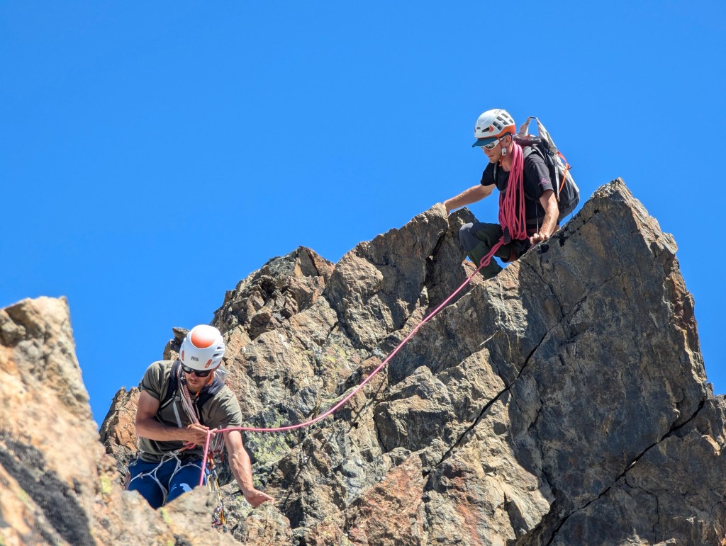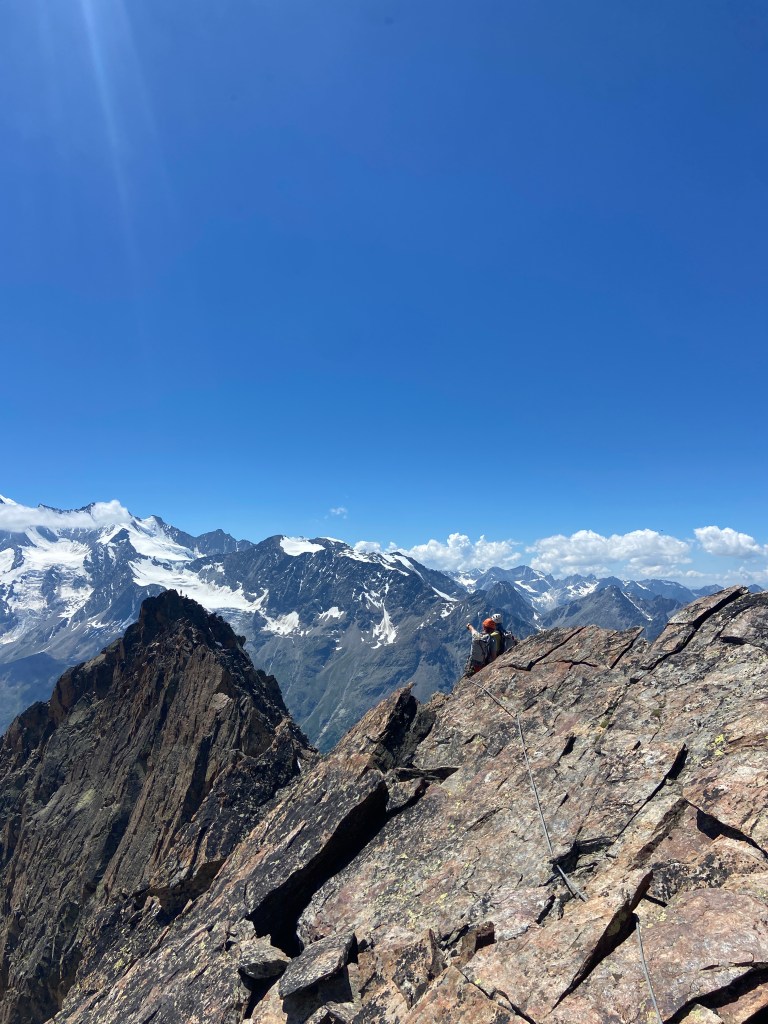 De volgende ochtend wandelden we aan, ongeveer zoals gepland, en begonnen de beklimming in drie cordées: Matthijs en Emiel met Denis; Felix en Hektor met Sam en ten slotte Liedewij en Mo. Sommigen moesten nog wat wennen om met hun C- of D-schoenen op kleine randjes te staan, een vertrouwen dat tegen het einde van de week volledig in orde zou zitten. Op de graat waren Denis, Matthijs en Emiel al snel verderop uit het zicht verdwenen, terwijl ze discussieerden over bedenkelijke dilemma’s geponeerd door Denis, zo zou de rest later horen. Ondertussen vorderde de rest van de groep op hun eigen tempo. Een vrij traag tempo, zo bleek, want ze misten de laatste lift terug naar beneden. Dat wilde zeggen dat ze 1000 hoogtemeters (extra) te voet moesten afdalen. Meteen een goede start voor onze stage :p