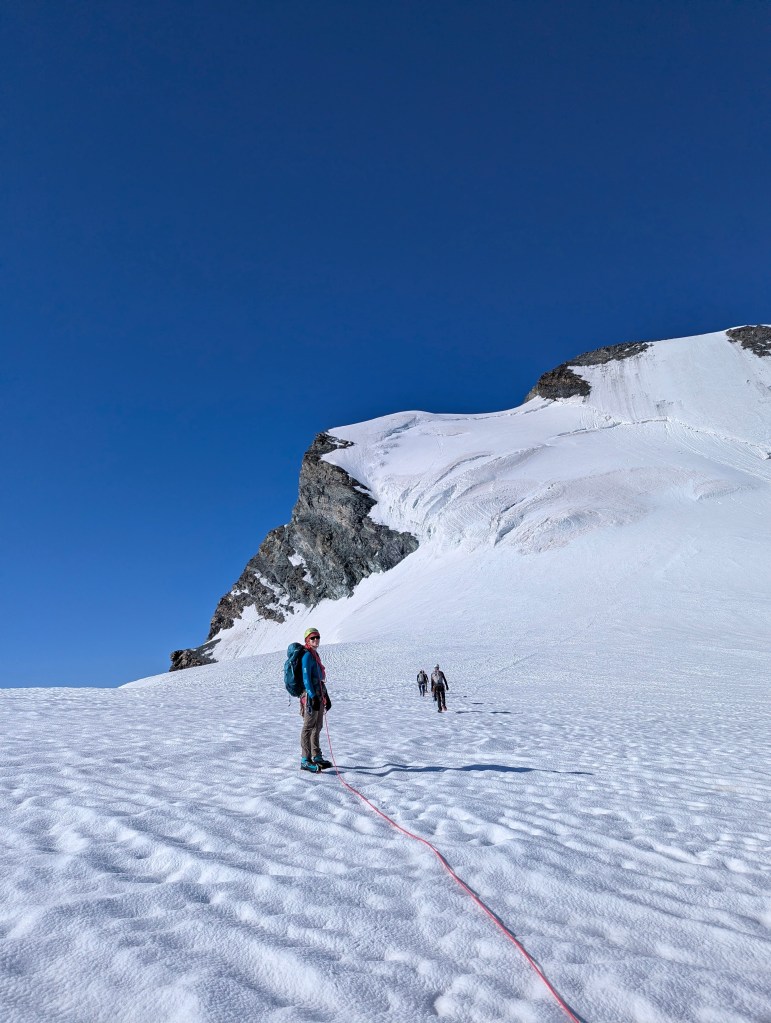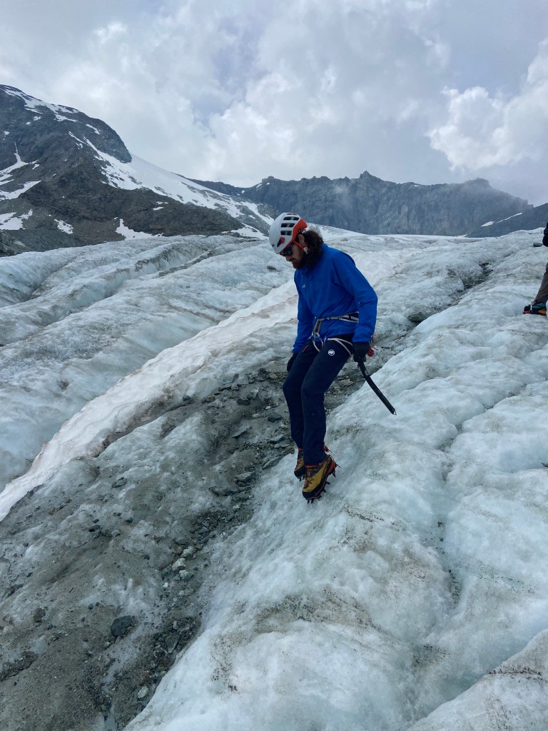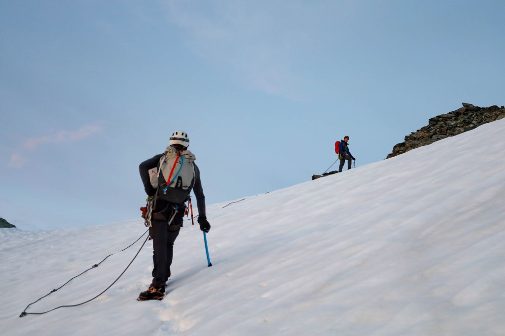 De volgende ochtend reden we op naar Saas-Fee om daar een liftje te pakken en nog een goed uur te wandelen tot aan de hut. We kwamen rond de middag aan, en na onze spullen weggeborgen te hebben, namen we onze crampons en ijsbijlen mee naar een stuk apere gletsjer een paar honderd meter lager voor de ijsscholing – d.i. vorderingstechnieken over ijs oefenen, en ook het indraaien van ijsvijzen en het maken van abalakovankers.