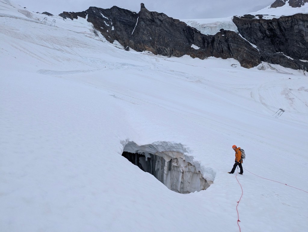 Tijdens het afzakken over de Feegletsjer (die trouwens een heuse skipiste onder constructie was – pistenbully’s ontwijken dus!) vonden we nog een geschikte crevasse om onze spaltenberging te oefenen. Met de opening redelijk bergop en een back-up anker konden we veilig deze redding in realistisch(ish)e omstandigheden inoefenen.