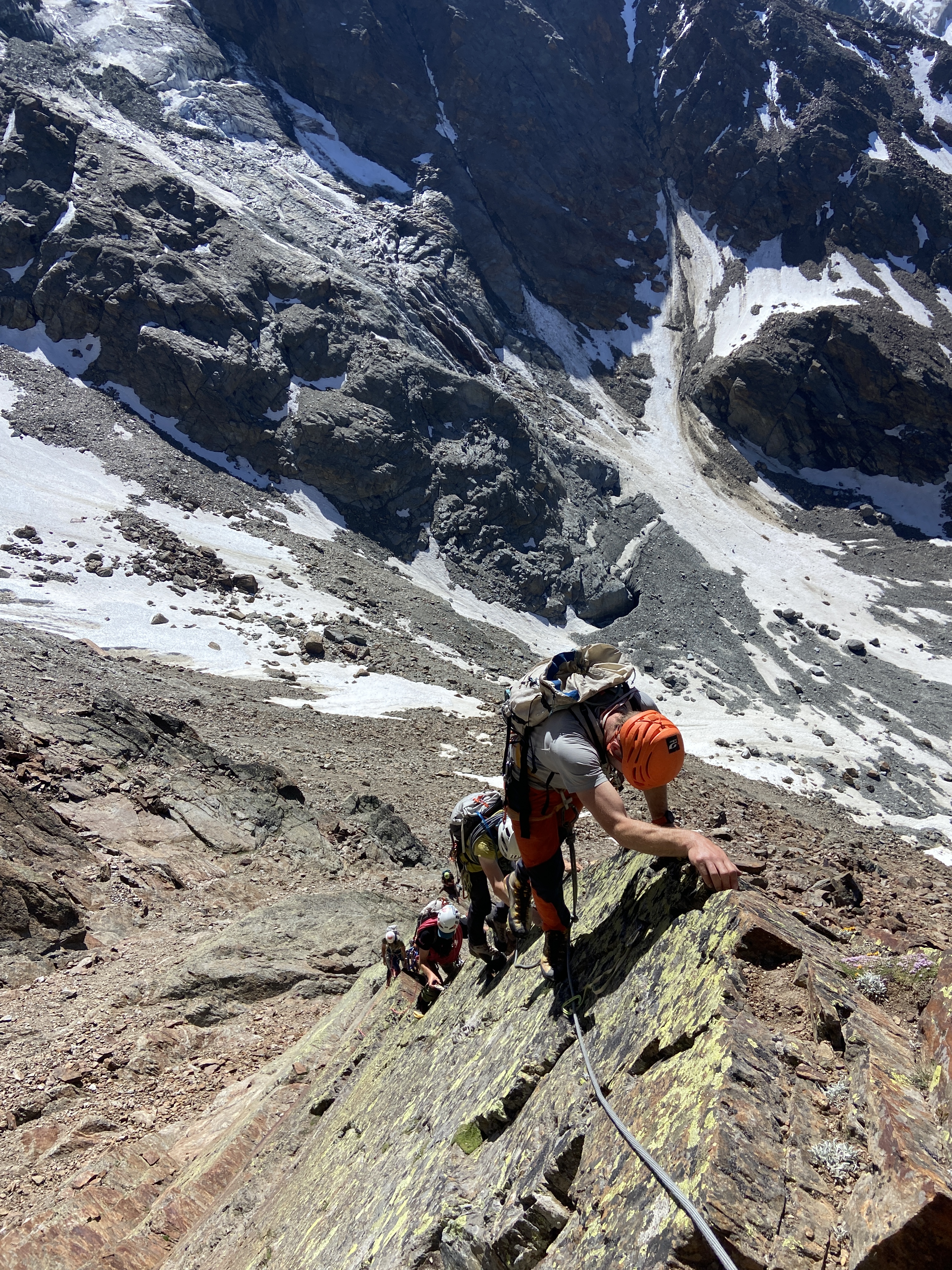 De volgende ochtend wandelden we aan, ongeveer zoals gepland, en begonnen de beklimming in drie cordées: Matthijs en Emiel met Denis; Felix en Hektor met Sam en ten slotte Liedewij en Mo. Sommigen moesten nog wat wennen om met hun C- of D-schoenen op kleine randjes te staan, een vertrouwen dat tegen het einde van de week volledig in orde zou zitten. Op de graat waren Denis, Matthijs en Emiel al snel verderop uit het zicht verdwenen, terwijl ze discussieerden over bedenkelijke dilemma’s geponeerd door Denis, zo zou de rest later horen. Ondertussen vorderde de rest van de groep op hun eigen tempo. Een vrij traag tempo, zo bleek, want ze misten de laatste lift terug naar beneden. Dat wilde zeggen dat ze 1000 hoogtemeters (extra) te voet moesten afdalen. Meteen een goede start voor onze stage :p